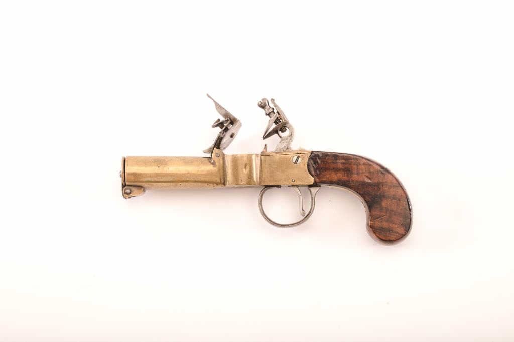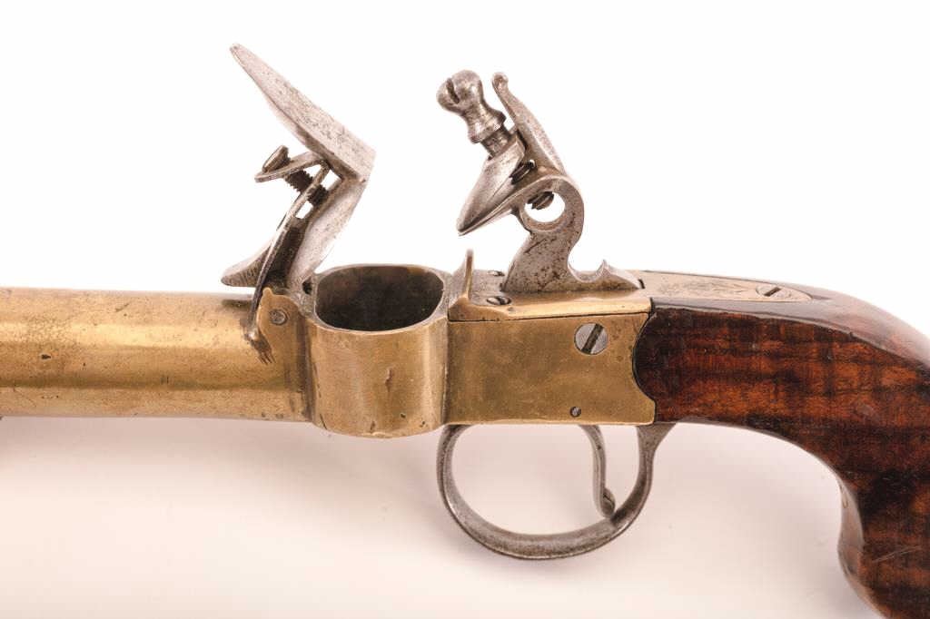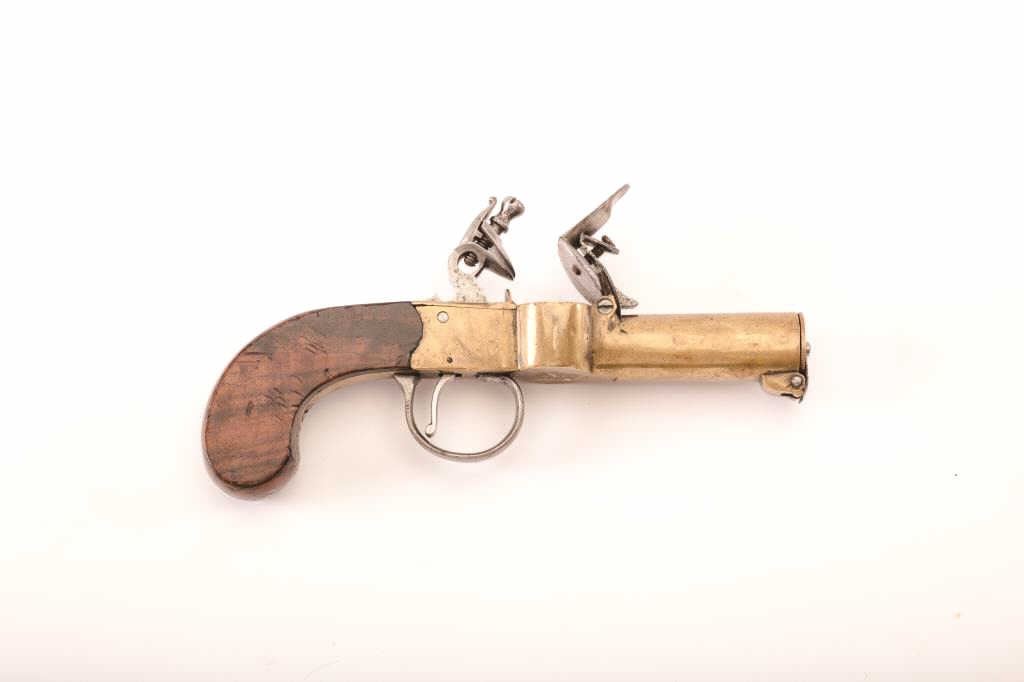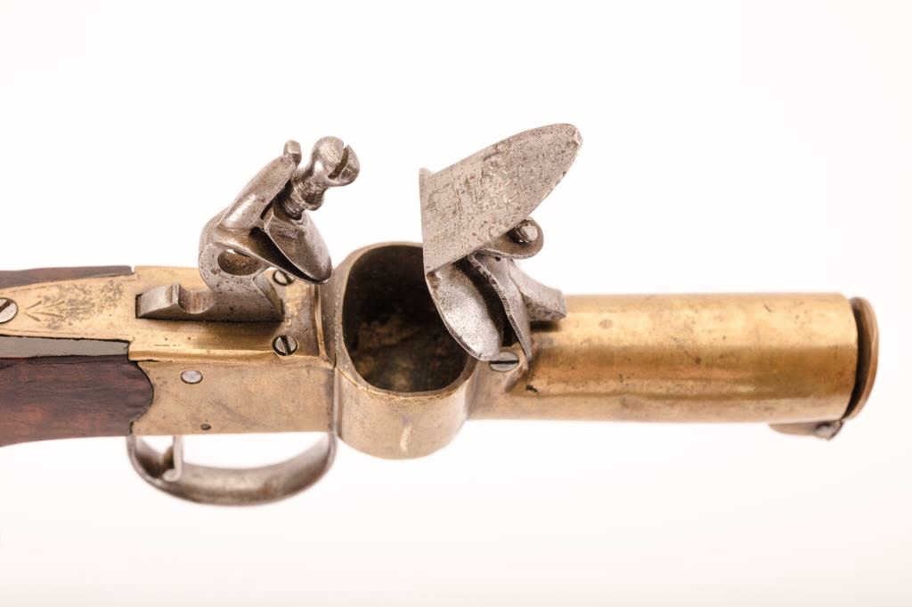 Early 19th century all brass tinder lighter in center hammer English box lock style. Measures 7 1/8” overall. Very good plus condition and made by a gunmaker. Type used in early American as fire starter. Est.:$750-$1500