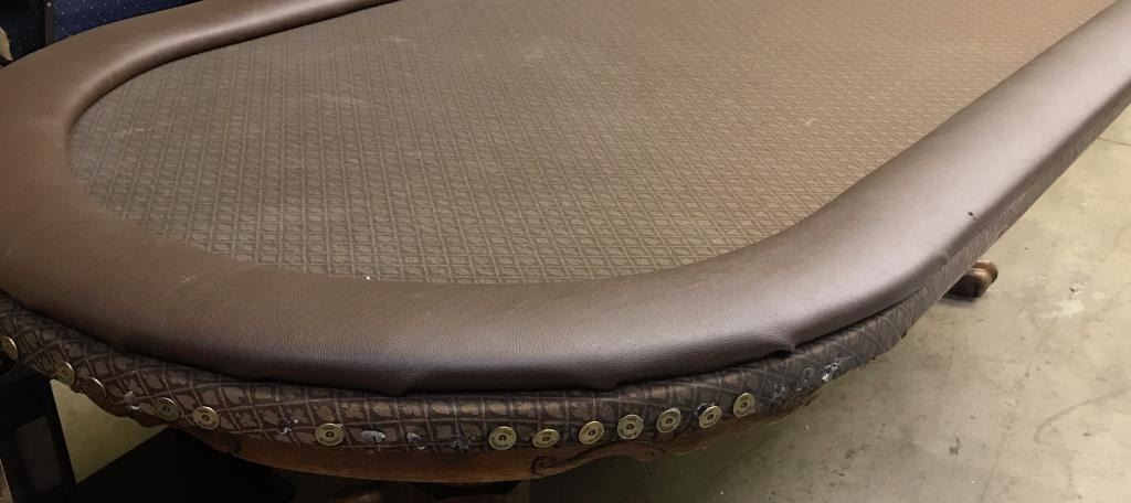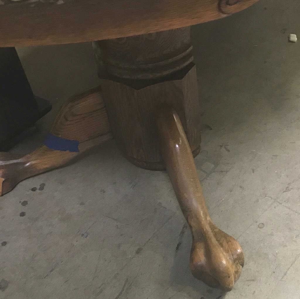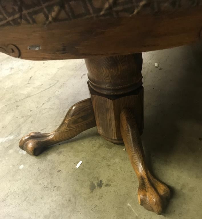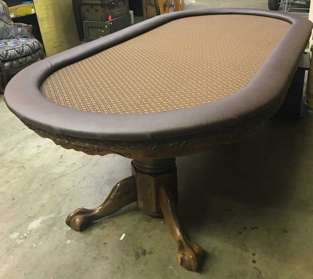 Beautiful large heavy solid oak poker table with claw foot pedestals, approximately 32” in height, 8 feet long and 4 feet wide; recently re-felted; one leg has been repaired and there is one slight tear to felt at edge but is not visible as it is secured under the bumper. Great for any man cave or game room! Est.: $200-$400.
