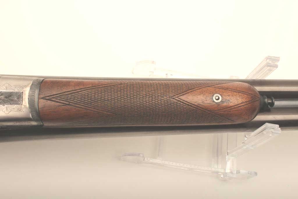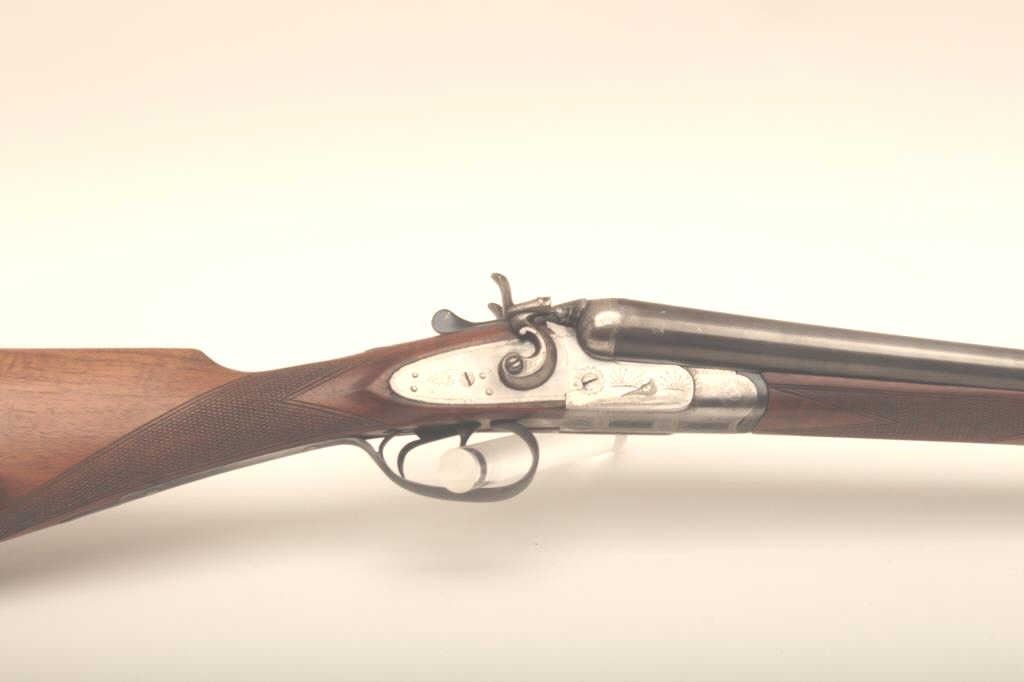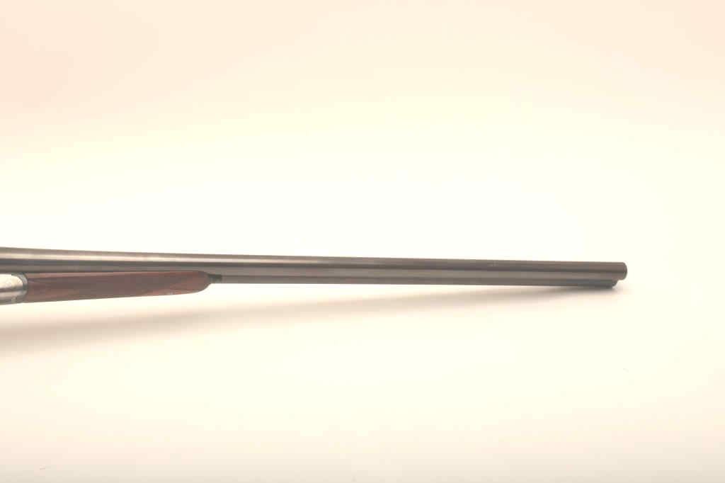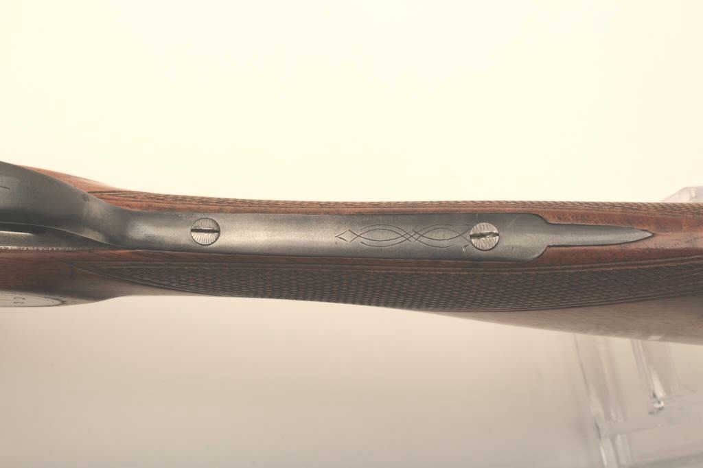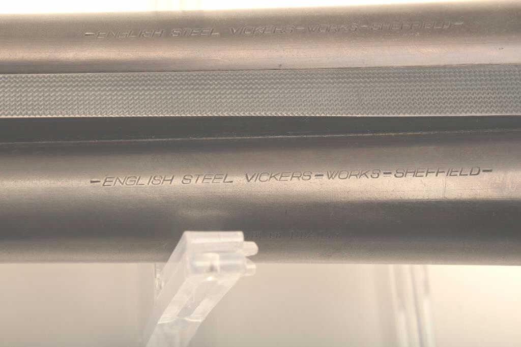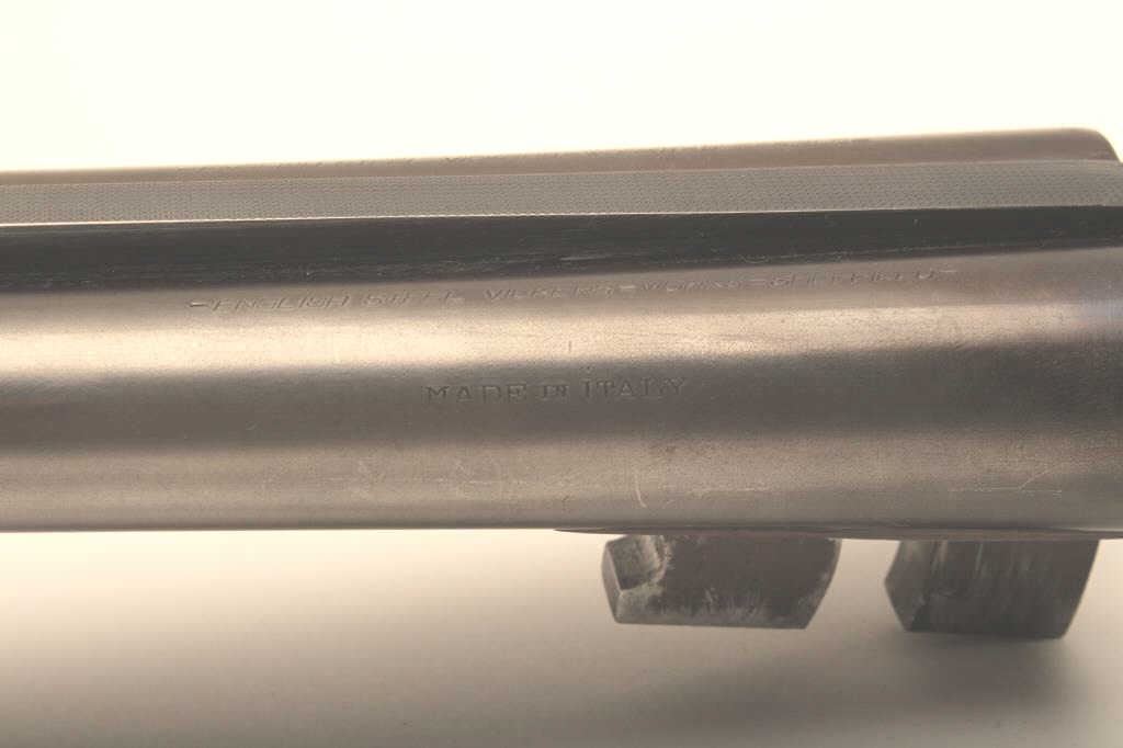 I. Marco Brescia Italy marked 12GA SxS shotgun with vikers steel, Sheffield marked barrels, exposed hammers, double triggers, standard extractors, and English style straight stock, S/N 6167. Interesting Greener cross bolt and dolls head locking mechanism. The barrels measures 27 ¾” and choked full and full. 50%-70% thinning blue on the barrels with one thumbprint 9” down on the left barrel from action. Satin gray frame isvery good. The stocks are very good with hair line crack just starting behind the left lock plate. Locks tight with good bores. An interesting gun we would date shortly after WWII to 1970s before Brescia re-emerged asgun making center and British steel was sought after. Est.: $450-900
