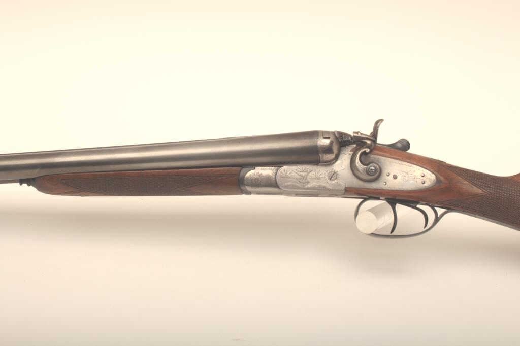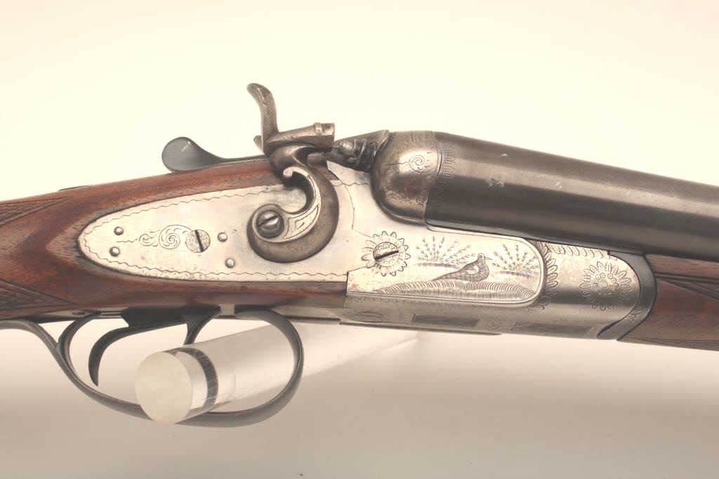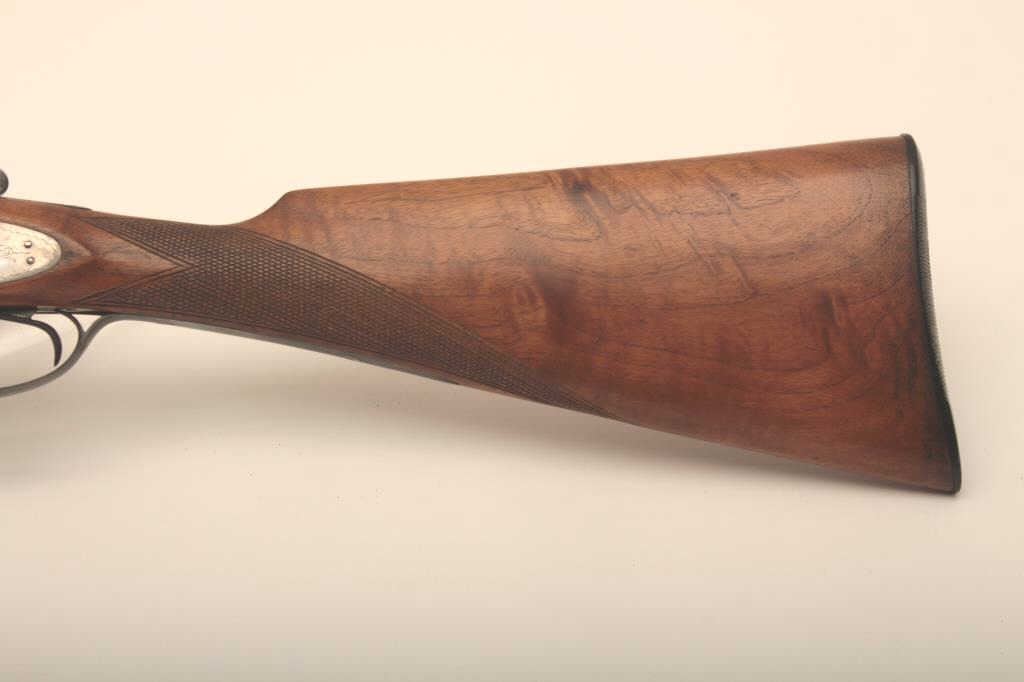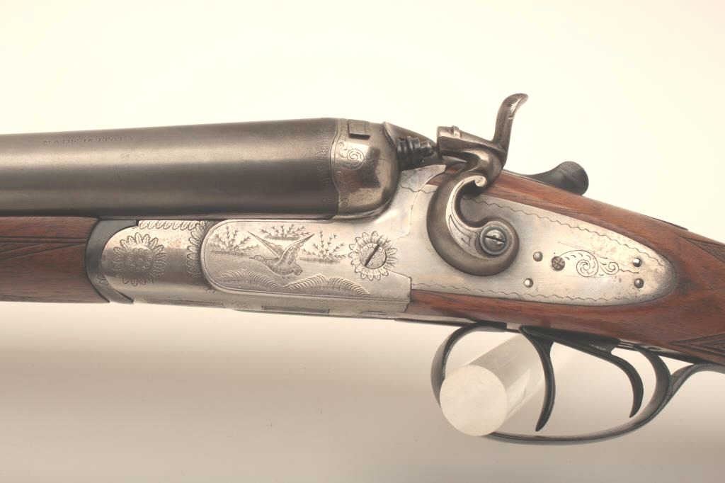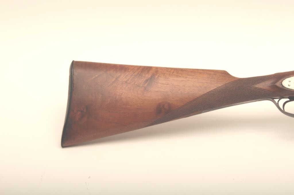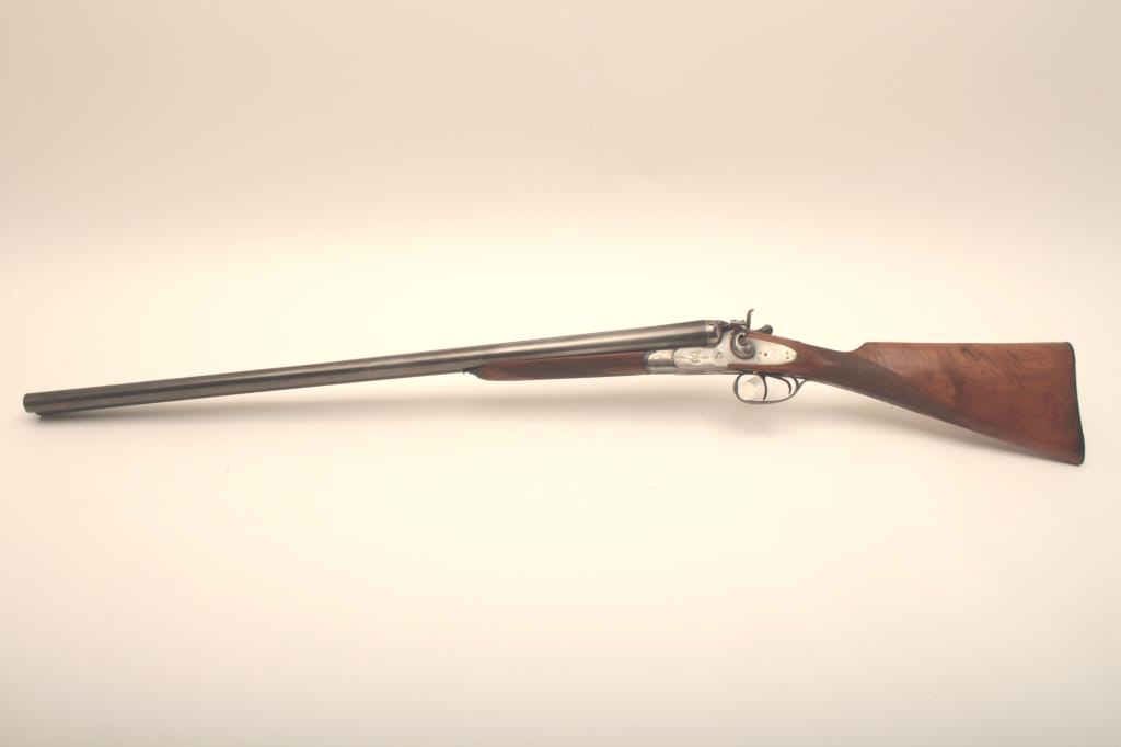 I. Marco Brescia Italy marked 12GA SxS shotgun with vikers steel, Sheffield marked barrels, exposed hammers, double triggers, standard extractors, and English style straight stock, S/N 6167. Interesting Greener cross bolt and dolls head locking mechanism. The barrels measures 27 ¾” and choked full and full. 50%-70% thinning blue on the barrels with one thumbprint 9” down on the left barrel from action. Satin gray frame isvery good. The stocks are very good with hair line crack just starting behind the left lock plate. Locks tight with good bores. An interesting gun we would date shortly after WWII to 1970s before Brescia re-emerged asgun making center and British steel was sought after. Est.: $450-900