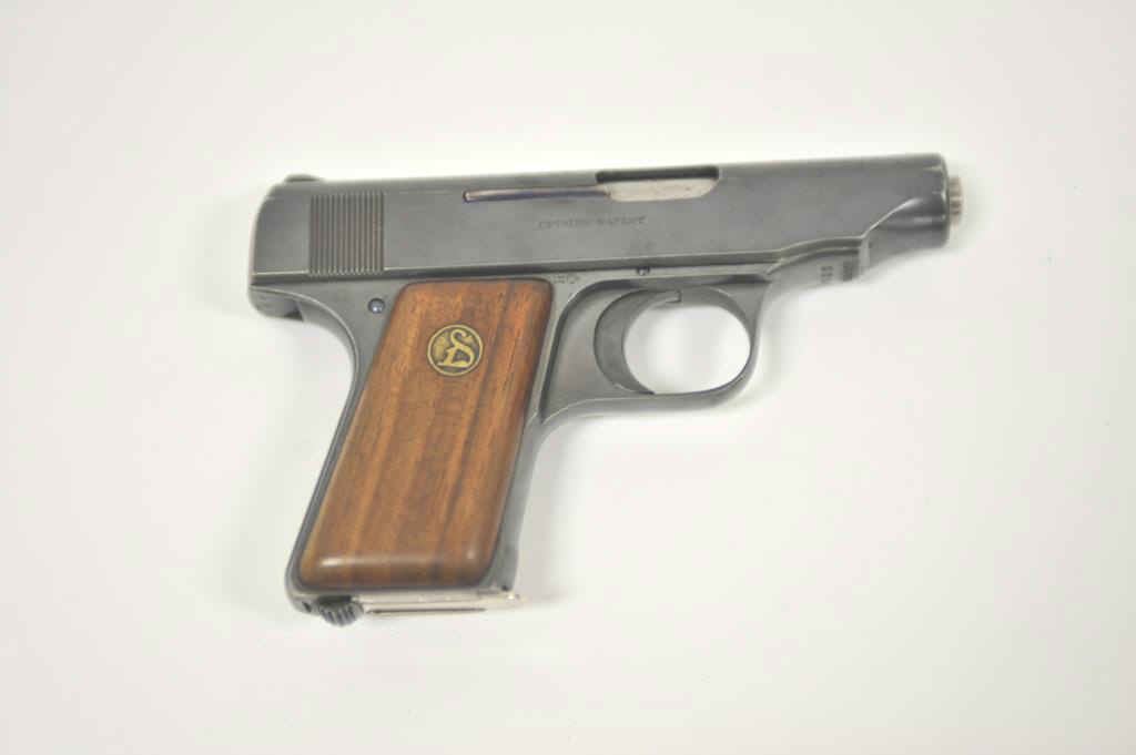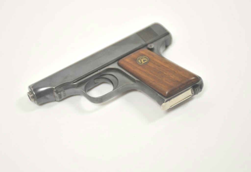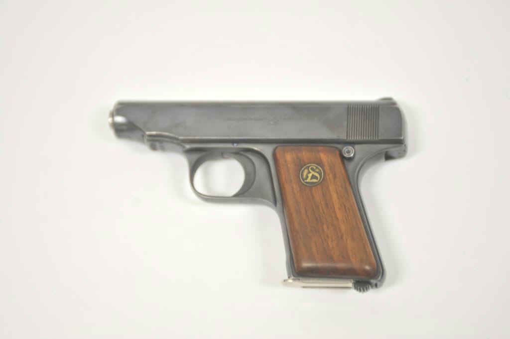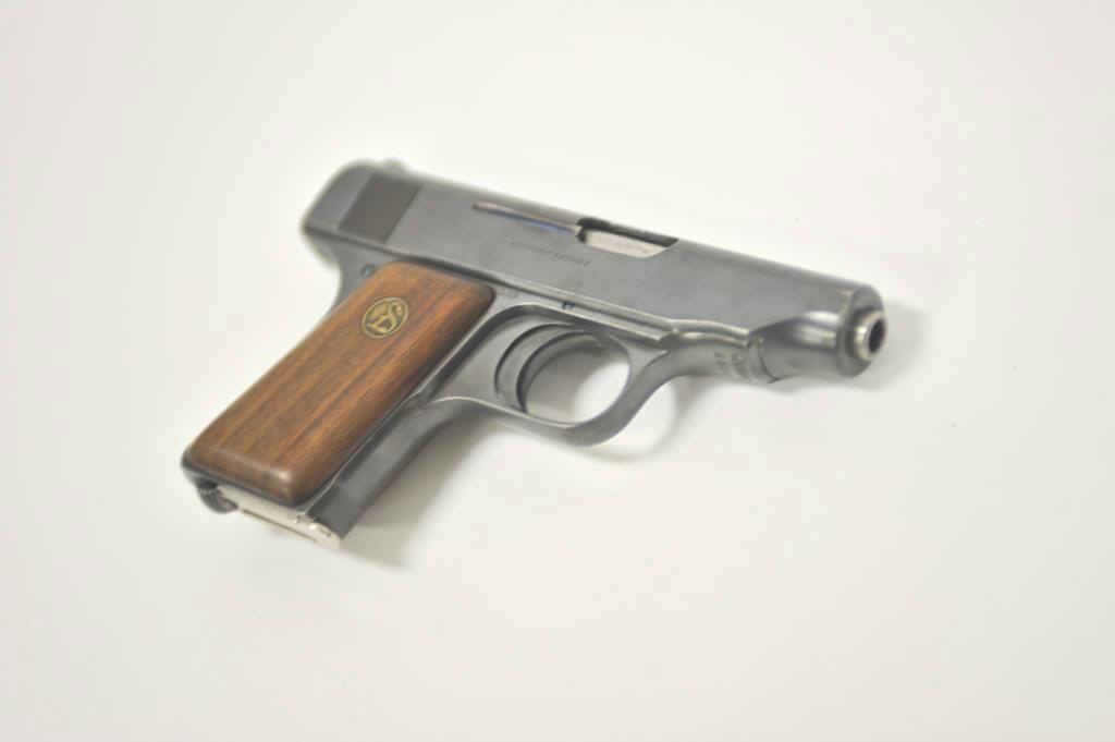DWM Ortgie’s Model pocket semi-automatic pistol, 6.35mm caliber, 2.75” barrel, blued finish, wood medallion grips, S/N 22502; overall very good condition with majority of original finish remaining, good bore, crispaction, sharp markings and very good grips. (C&R/PPT). Est.: $200-400