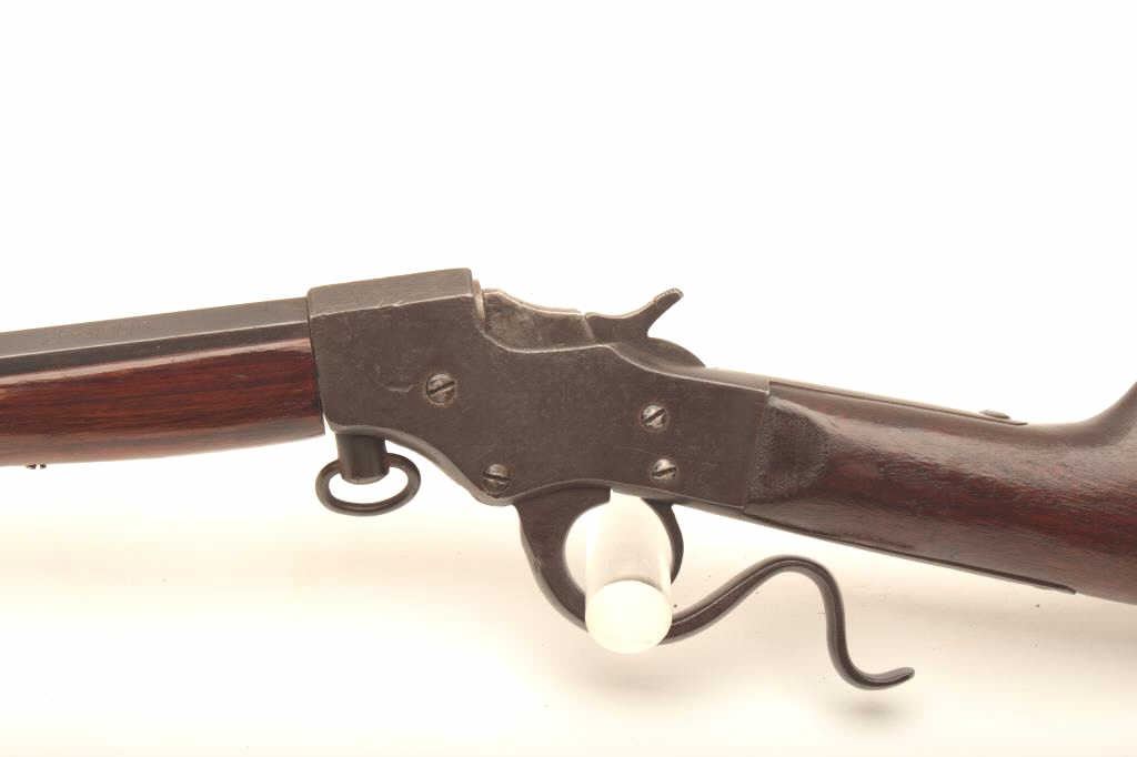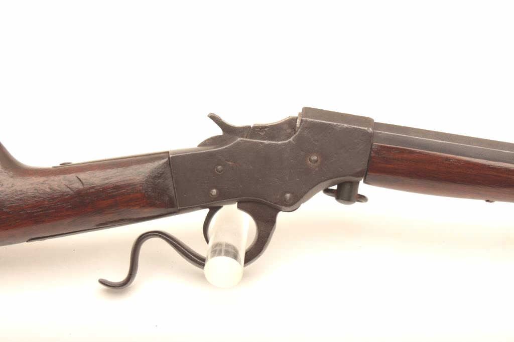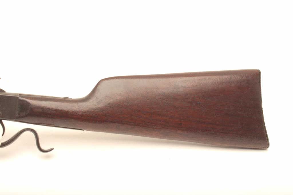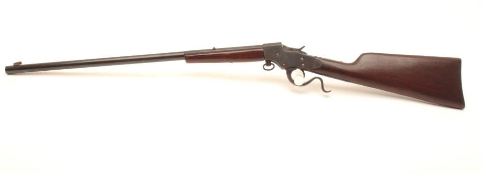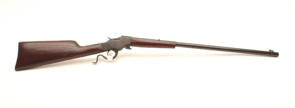 Stevens falling block rifle, .25 Stevens caliber, 22” half round/half octagon barrel, old re-blued finish, wood stocks, S/N 891; fair to good condition as re-finished with fair + bore, good action, good markings andoverall good wood. (C&R). Est.: $125-250