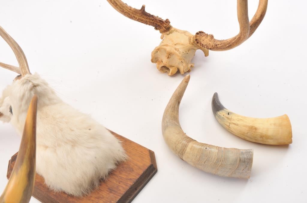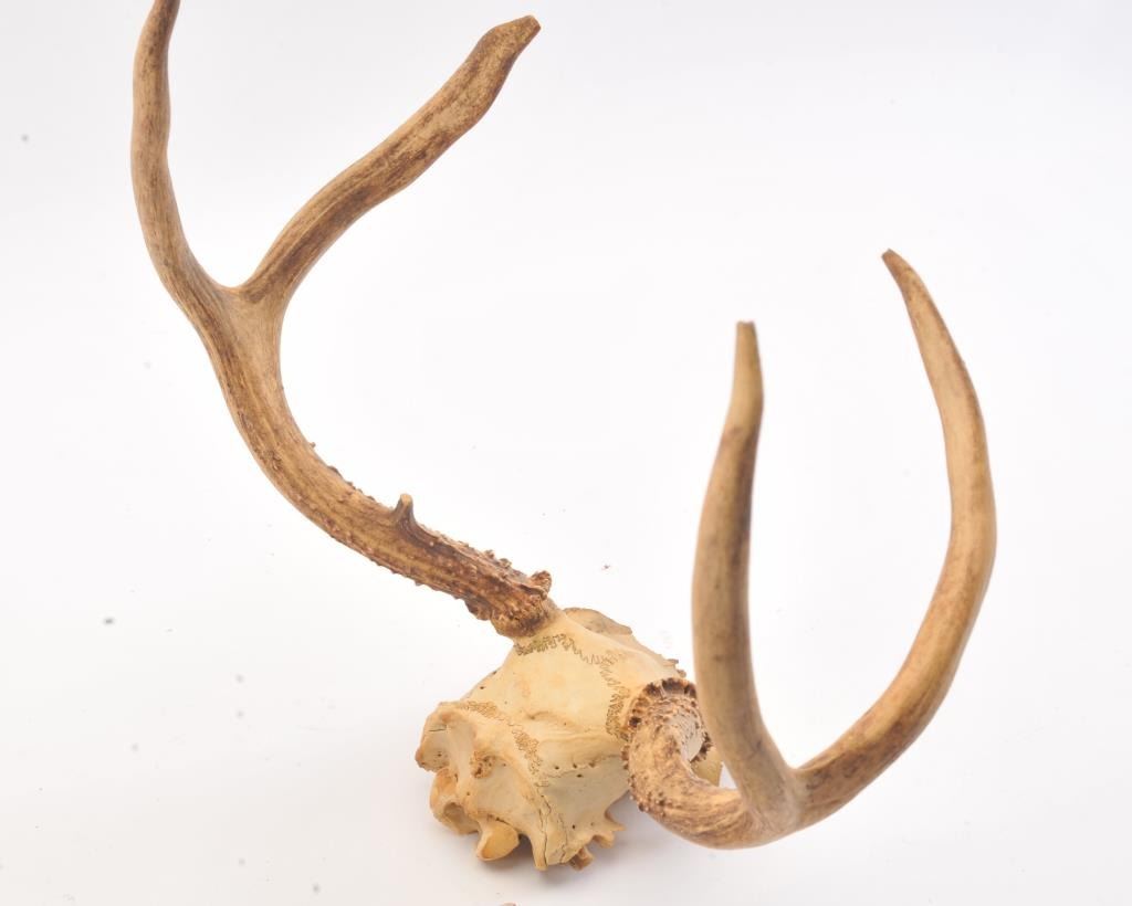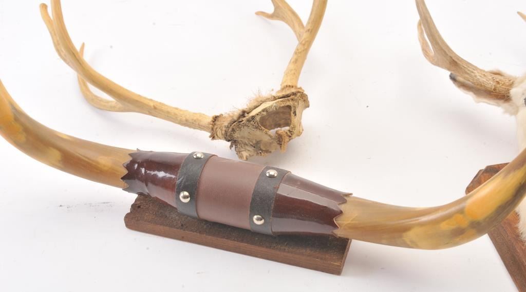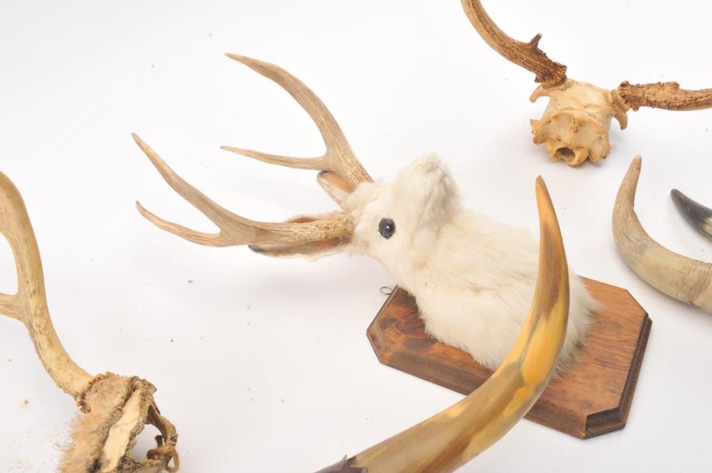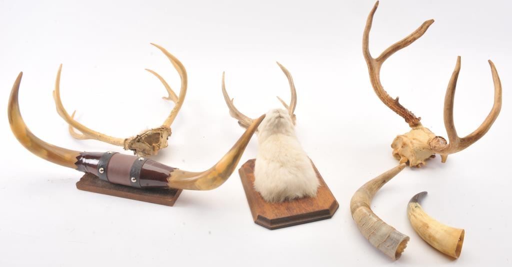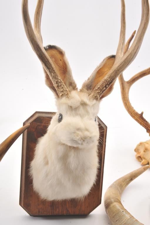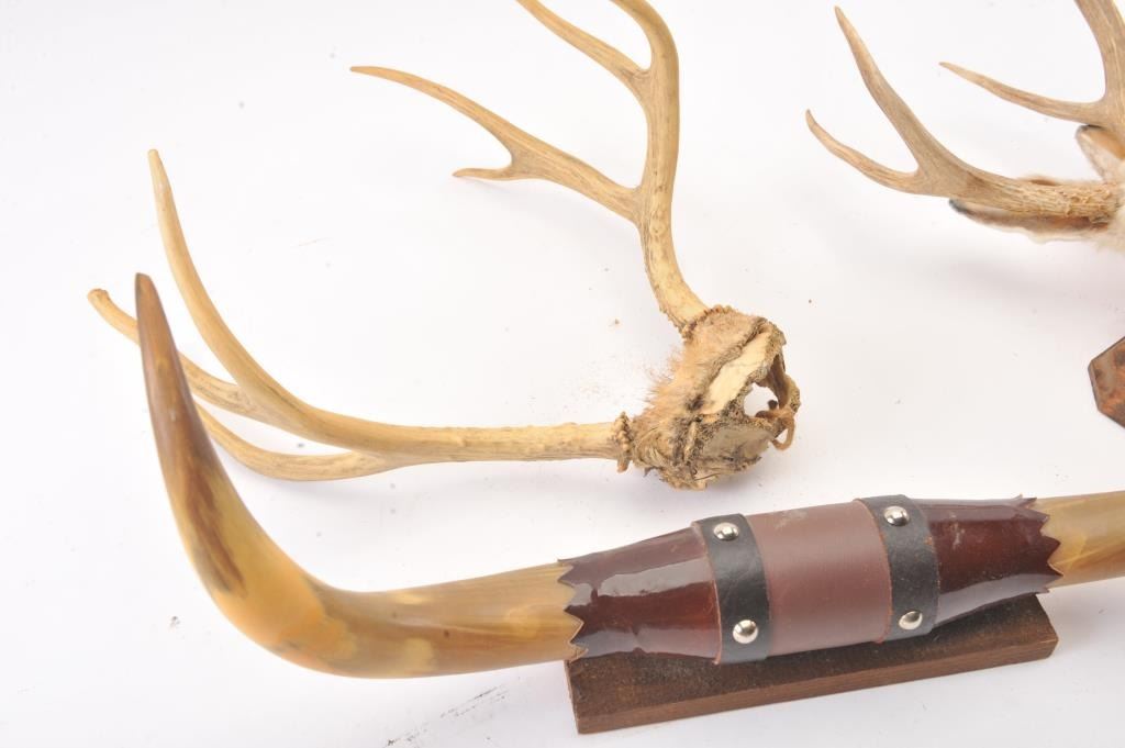 Lot of horns including a wood mounted pair of steer horns, two pair of deer antlers, two misc. horns and a plaque mounted “jack-a-lope”. Est.: $100-$175.