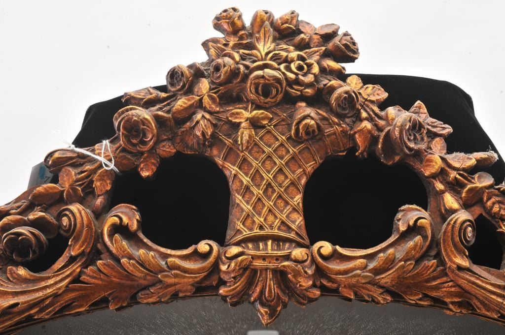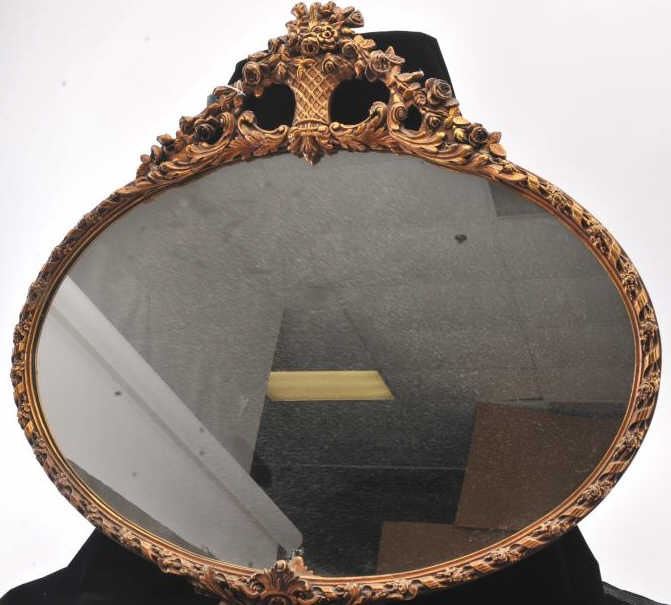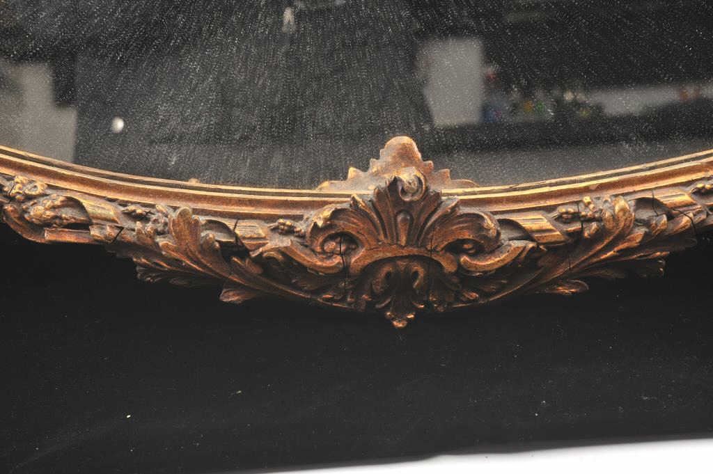 Beautiful vintage oval mirror with ornate gold painted gesso on wood finish. The mirror is approximately 36” across in good condition with a nice floral themed frame. The frame is unmarked, but heavy and showsage. Est.: $100-$200.