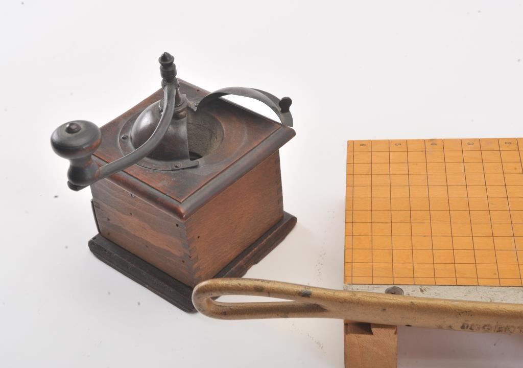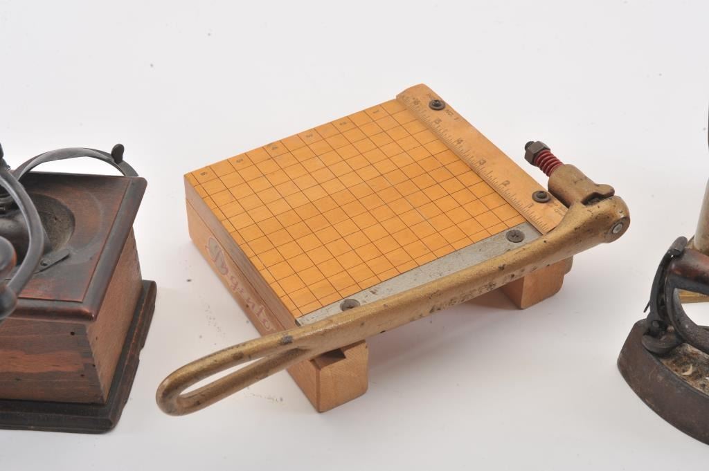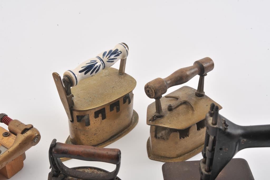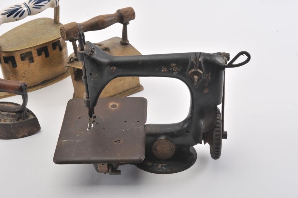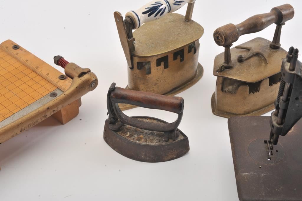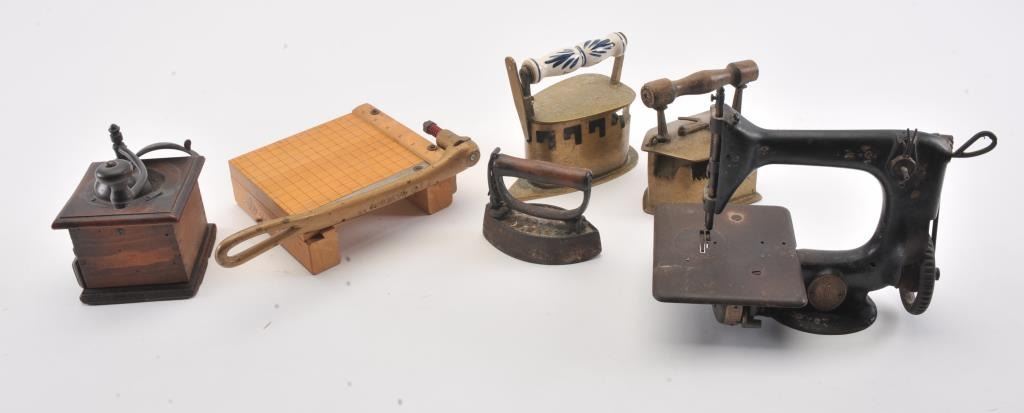 Lot of vintage collectible smalls including an ELMA coffee grinder, two brass and one iron clothes irons, a little sewing machine and a small wood and gold painted iron paper cutter. Est.: $75-$150.