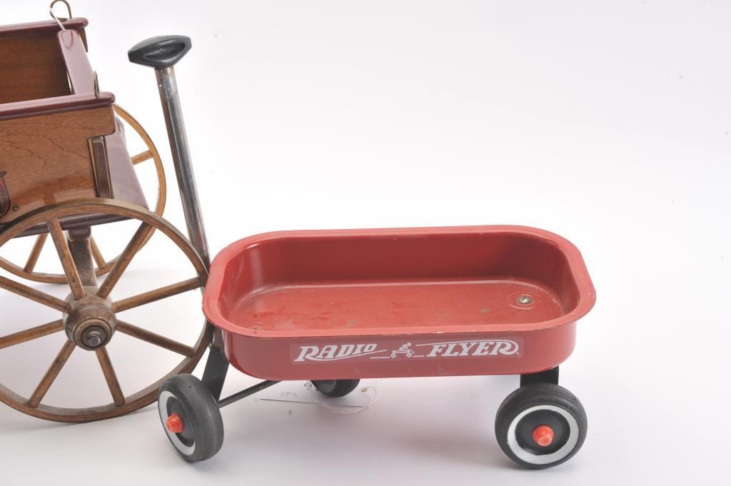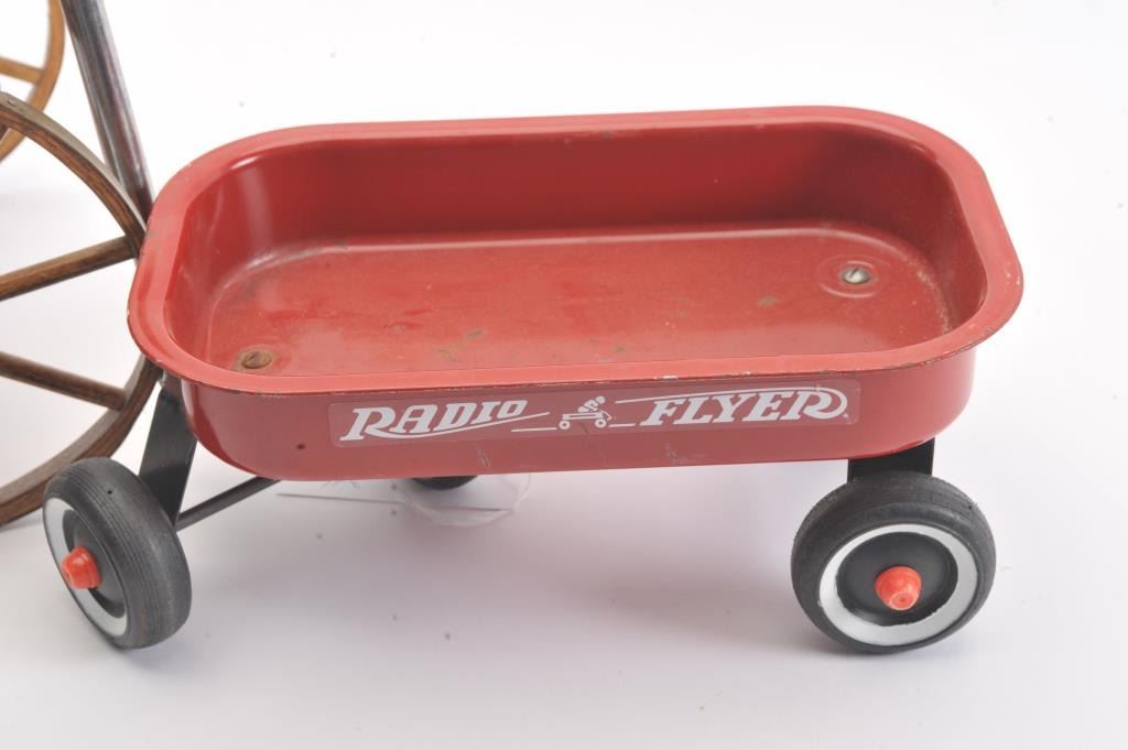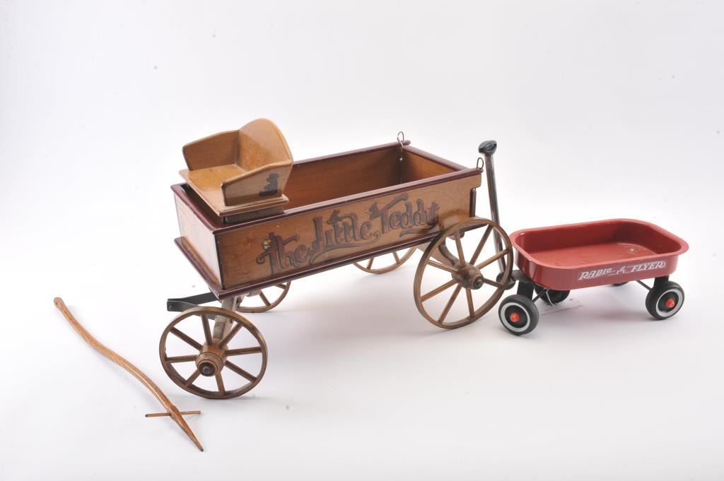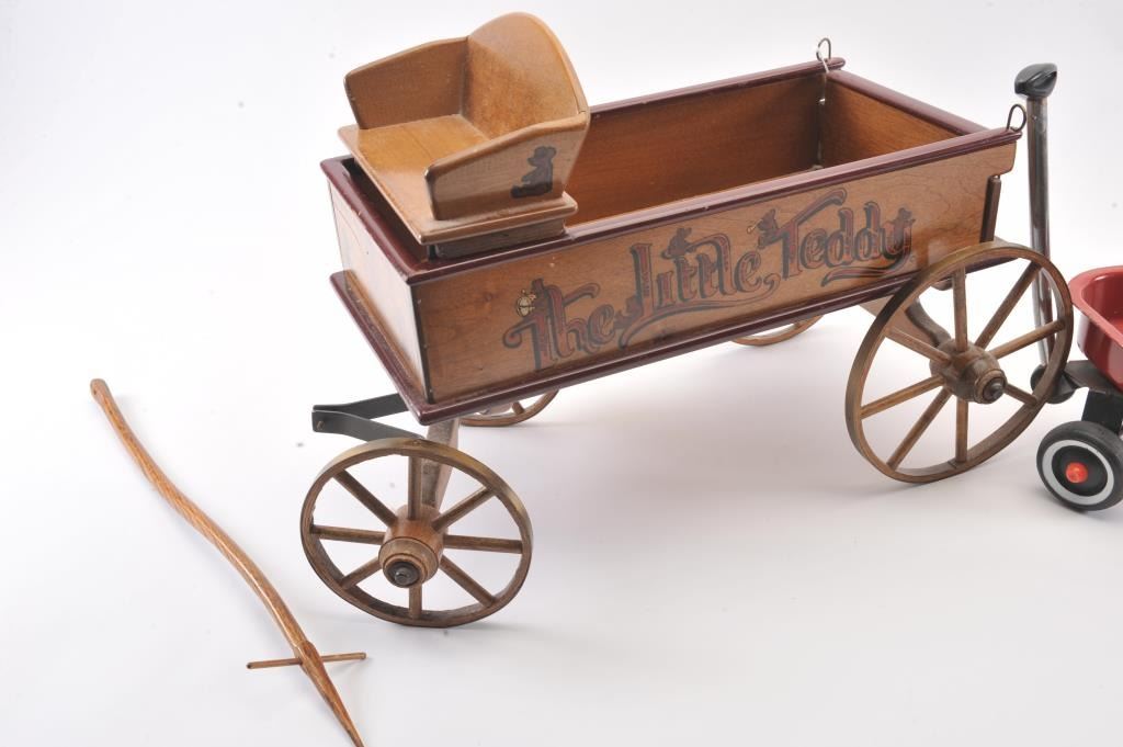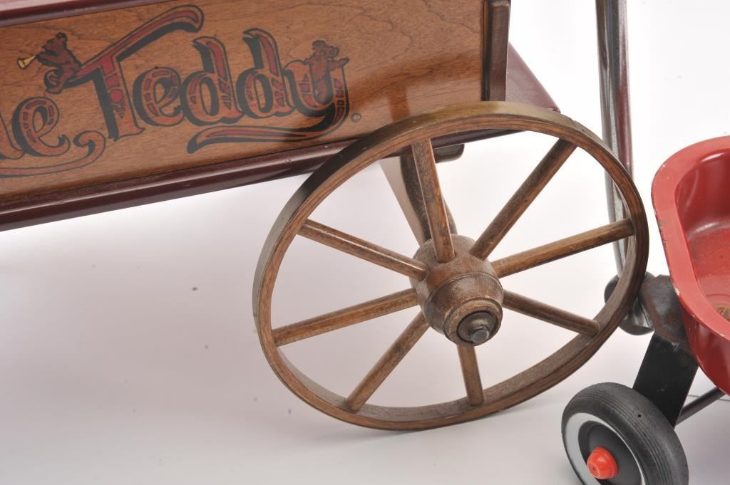 Collectible toy lot including a small metal red wagon marked “Radio Flyer”, a metal and wire table and four chair ice cream shop set and a wooden wagon marked “The Little Teddy; wagon is approximately 13” long x 8”wide x 6” tall overall; the table set is approximately 14” in height (table) with chairs 18” in height; the “Little Teddy” wagon is approximately 23” long, 15” wide (wheel to wheel). Est.: $150-$300.