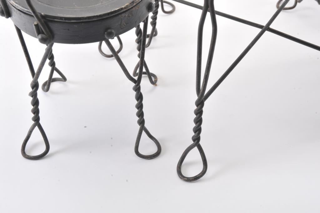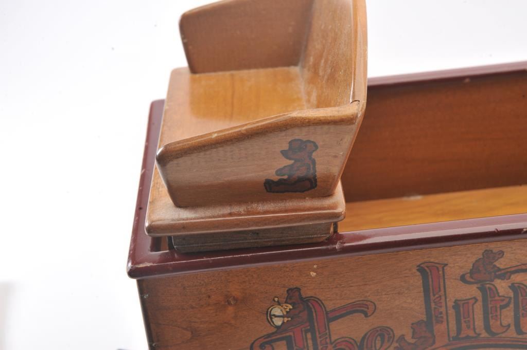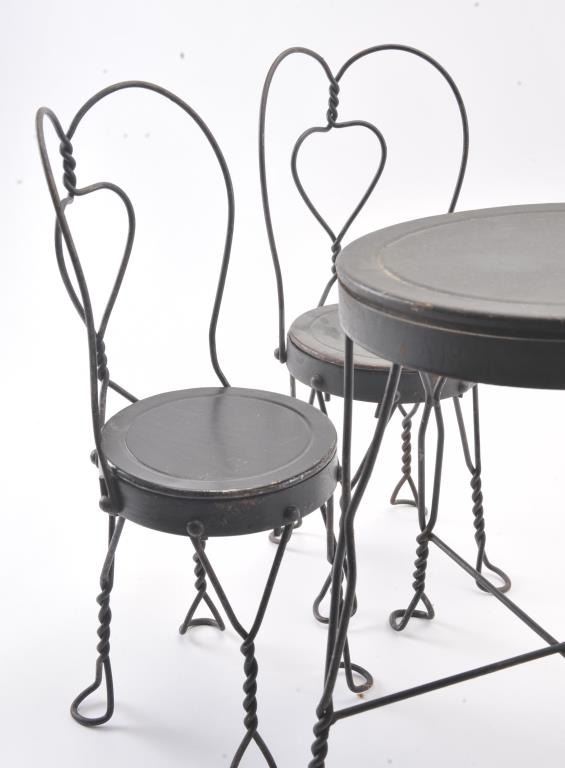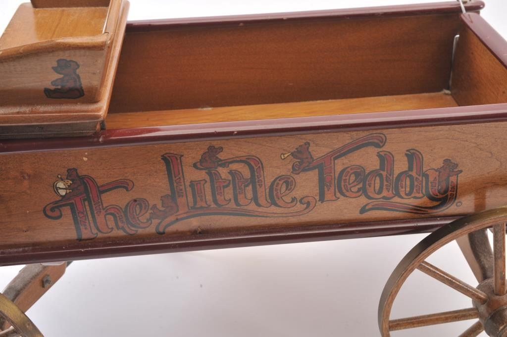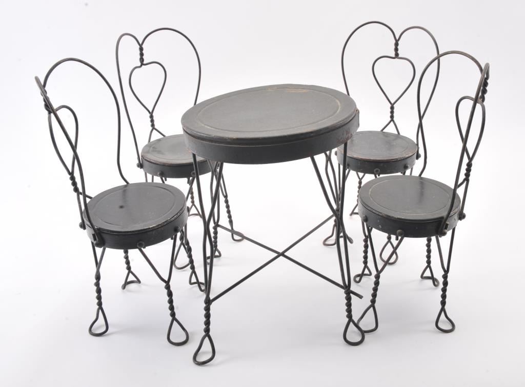 Collectible toy lot including a small metal red wagon marked “Radio Flyer”, a metal and wire table and four chair ice cream shop set and a wooden wagon marked “The Little Teddy; wagon is approximately 13” long x 8”wide x 6” tall overall; the table set is approximately 14” in height (table) with chairs 18” in height; the “Little Teddy” wagon is approximately 23” long, 15” wide (wheel to wheel). Est.: $150-$300.
