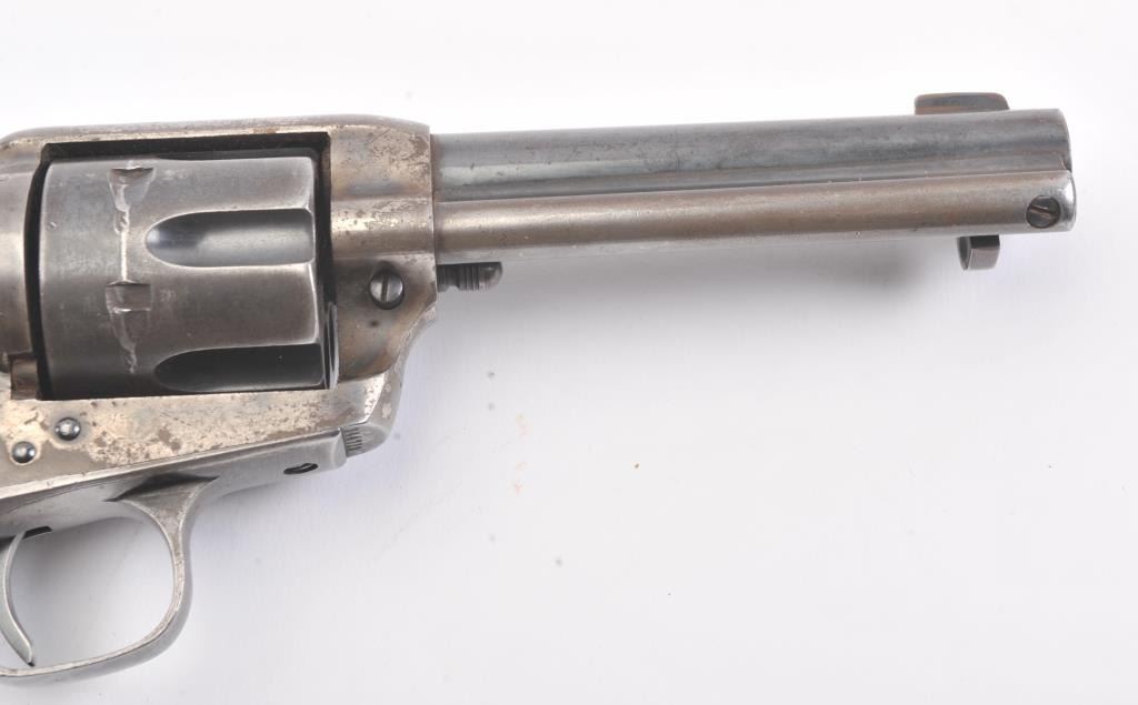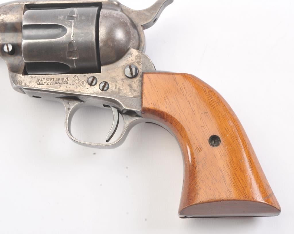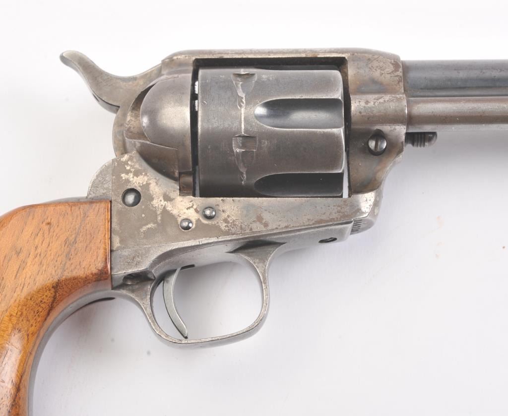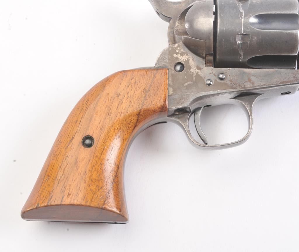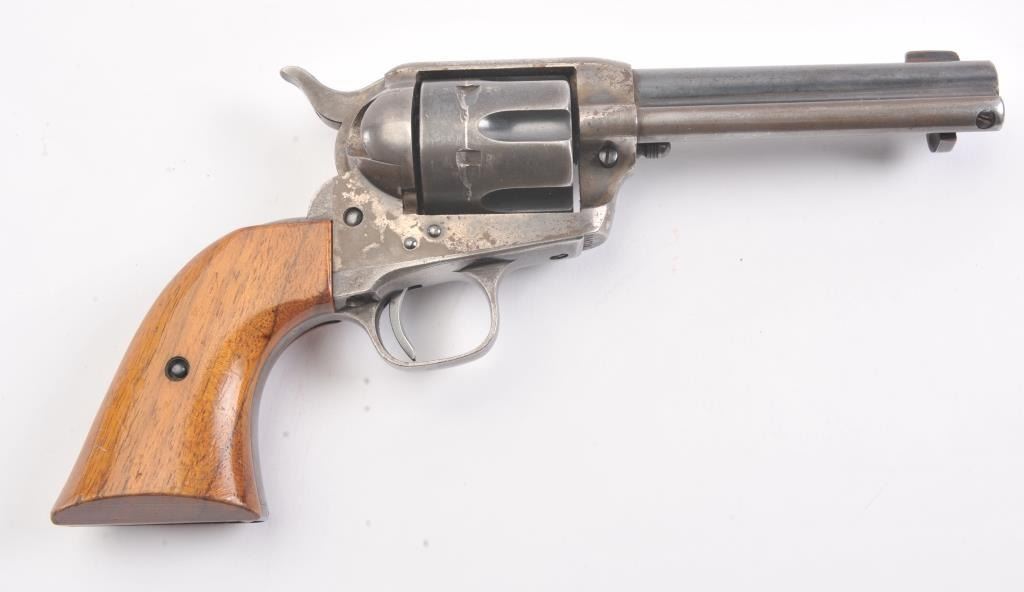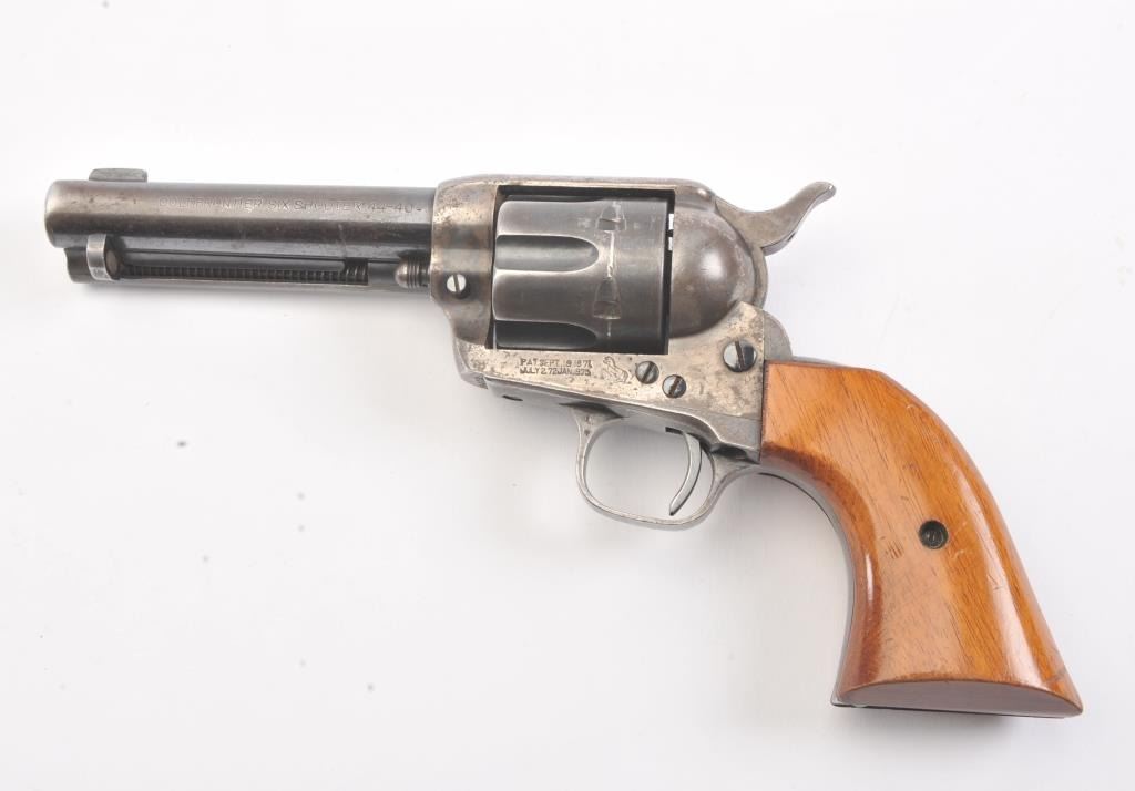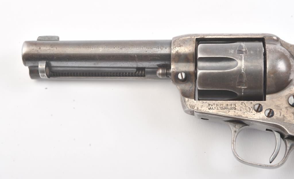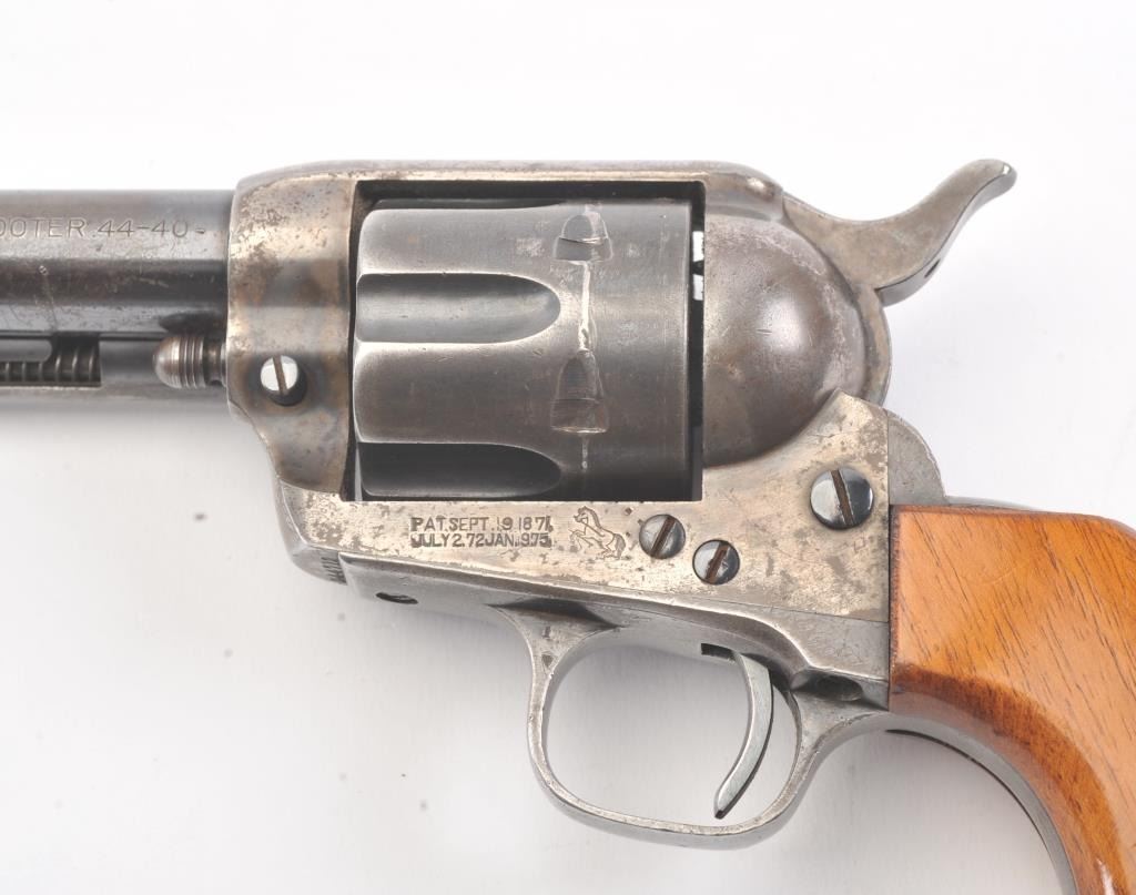 Late 1st Generation Colt SAA revolver, .44-40 caliber, Serial #344713. The pistol is in fine overall condition with a 4 ¾” barrel marked, COLT FRONTIER SIX SHOOTER 44-40”. The pistol retains approximately 60% of themuted blue finish with significant dull case hardening still visible on the frame. The front sight has been filed and the grips are smooth wood replacements. The action is crisp, marking are sharp and the bore is good on this late 1st Gen in the desirable .44-40 chambering. Est.: $1,200-$2,400. (C+R/PPT).