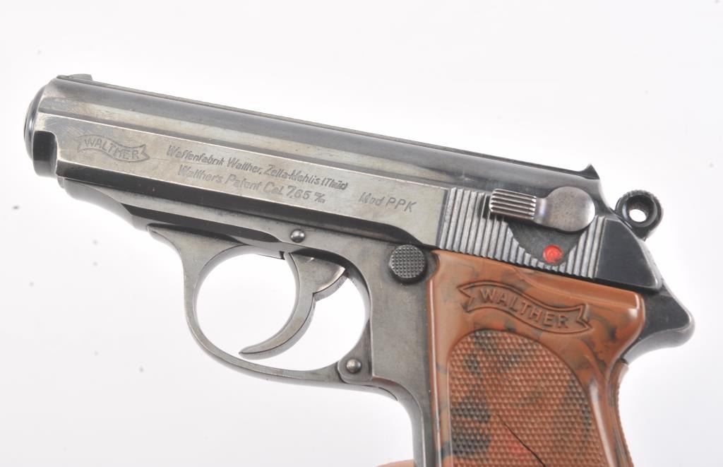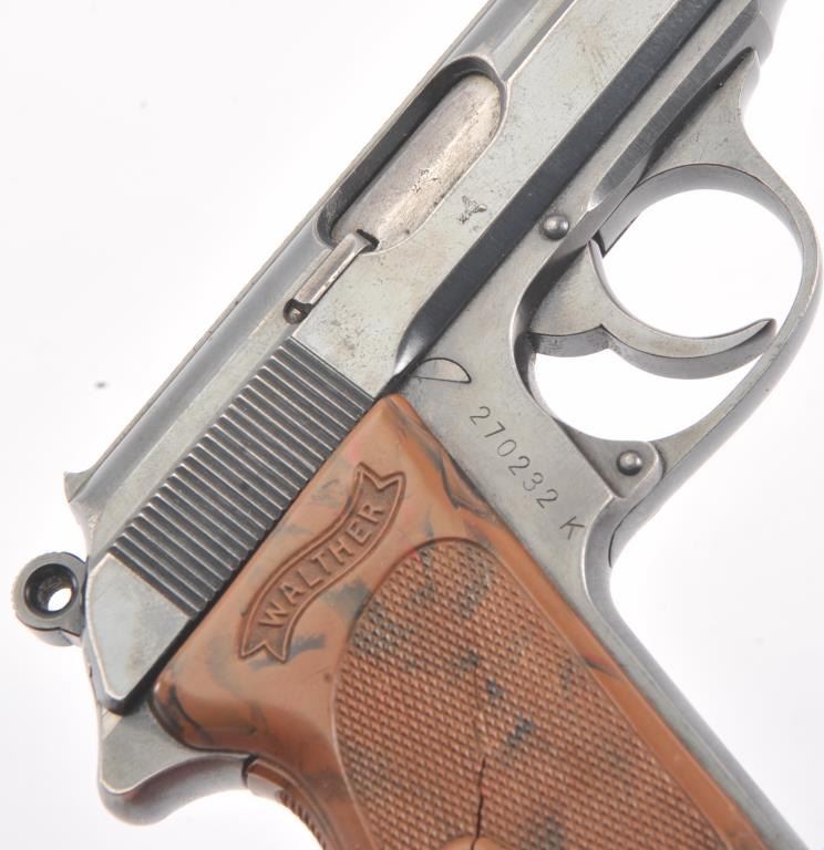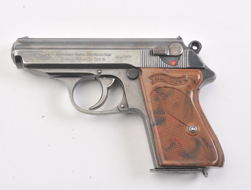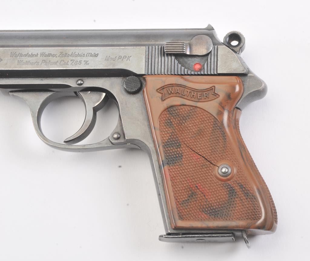 Nazi era Commercial Walther Model PPK semi-automatic pistol, 7.65mm caliber, Serial #270232K. The pistol is in fine overall condition with a 3 ¼” barrel. The pistol retains approximately 85%-90% of the mutedblue finish with holster wear at the muzzle and high edge wear. The slide and barrel both bear crisp Nazi proofs. The checkered plastic Walther marked grips have small cracks but are otherwise in very goodcondition with a lanyard ring at the base. The lot includes one correct, early magazine with a non-matching serial number. The bore is good, the action is crisp and markings are sharp on this desirable pre-war PPK. Est.: $600-$1,200. (C+R/PPT).
