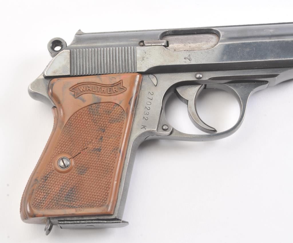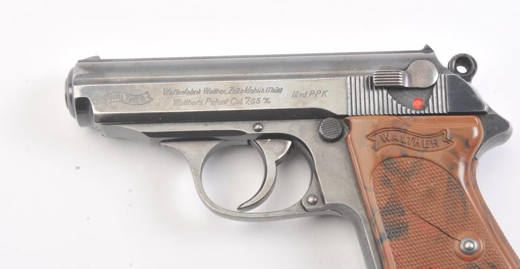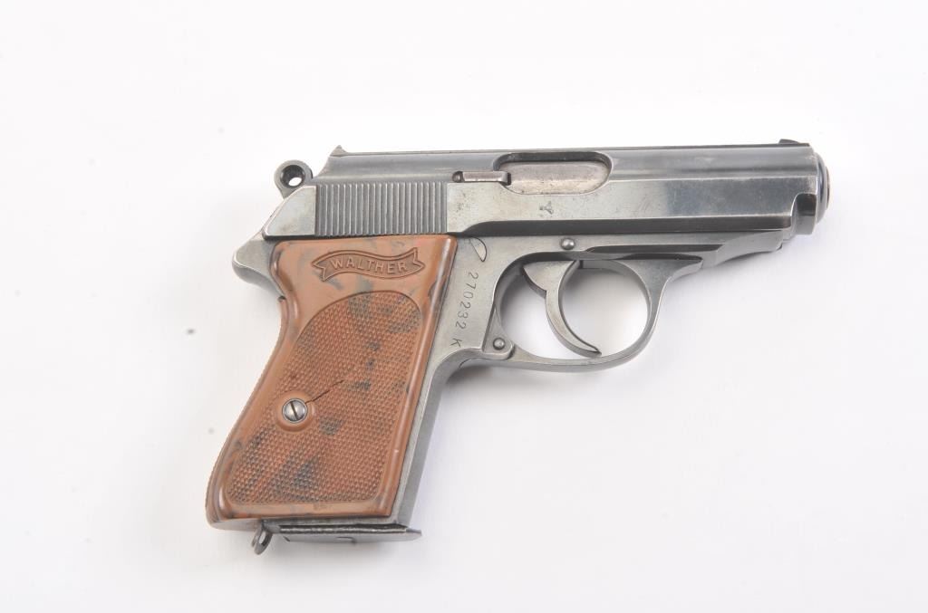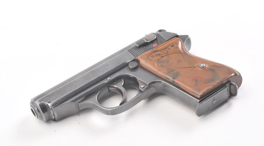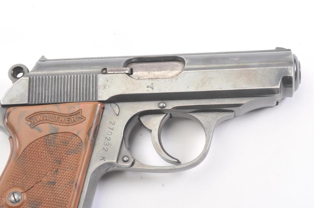 Nazi era Commercial Walther Model PPK semi-automatic pistol, 7.65mm caliber, Serial #270232K. The pistol is in fine overall condition with a 3 ¼” barrel. The pistol retains approximately 85%-90% of the mutedblue finish with holster wear at the muzzle and high edge wear. The slide and barrel both bear crisp Nazi proofs. The checkered plastic Walther marked grips have small cracks but are otherwise in very goodcondition with a lanyard ring at the base. The lot includes one correct, early magazine with a non-matching serial number. The bore is good, the action is crisp and markings are sharp on this desirable pre-war PPK. Est.: $600-$1,200. (C+R/PPT).