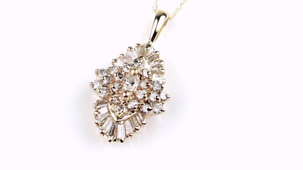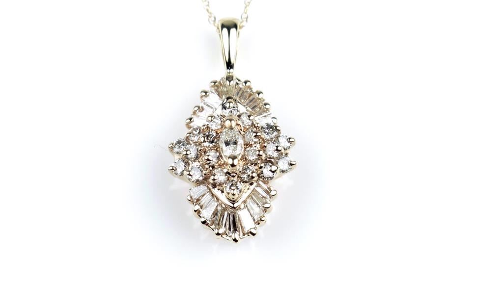Radiant Diamond Pendant featuring 38 round and baguette cut Diamonds weighing approx. 1.50 carats with G-H colors and VS/SI clarity set in 14 karat white gold. Retail $3,000-$4,000 Estimates $1,500-$2,000