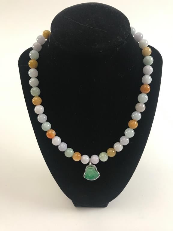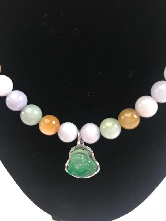 One unique multi-color jade bead necklace with a jade Buddha pendant Est:$250-500