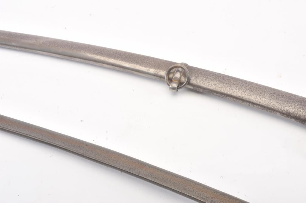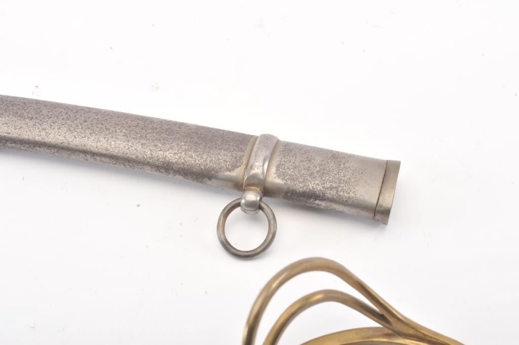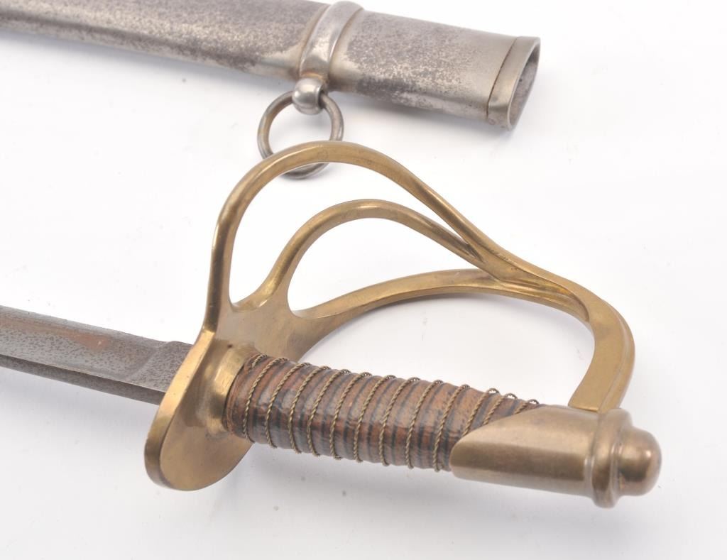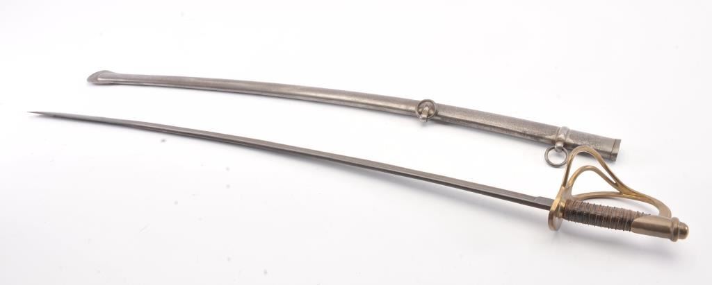 Reproduction Model 1860 Light Cavalry sabre with steel scabbard and hangers. The sword is in good overall condition with an overall length of 40” and a 34” blade. The blade has gone to a grey patina with some spotting and staining along its length. The handguard and pommel are brass with a wire wrapped leather handle. The steel scabbard is in good condition with light surface rust along its length. Est.: $100-$200.