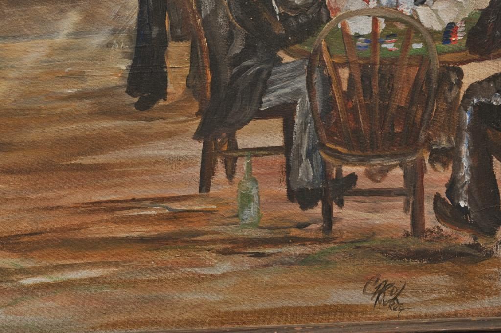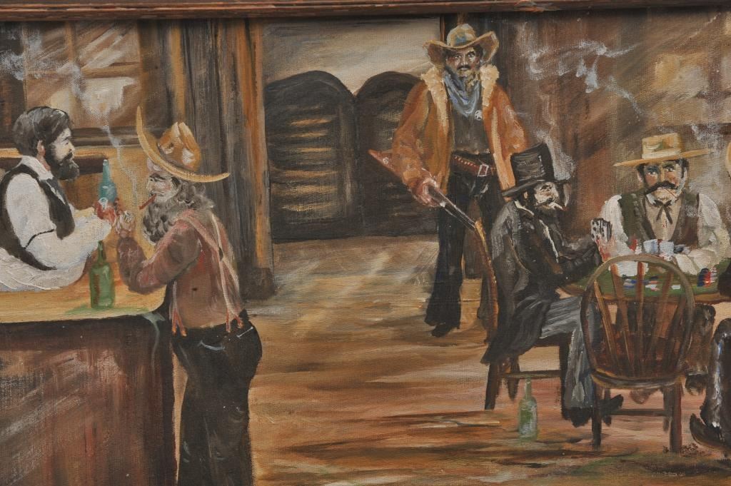 Vintage oil on board painting of an Old West saloon scene. The piece is 17 ½” x 11 ½” (art only) in a nice, distressed wood frame. An interesting depiction of the town Sheriff about to interrupt some bad hombre’s pokergame. Signed by the artist in the bottom right corner. The work came from a local estate. Est.: $100-$200.