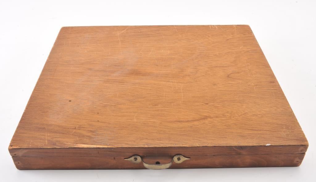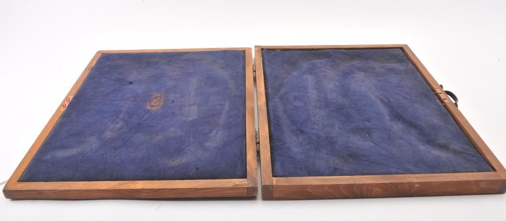 Folding wooden Colt display case with blue velvet interior. The folding case is 22” x 18 ½” with brass handle and lock. The interior is in good condition showing light wear. The exterior is unfinished withscratches and mars from carry and display. Est.: $25-$50.