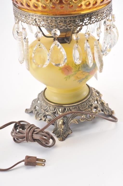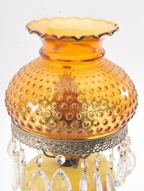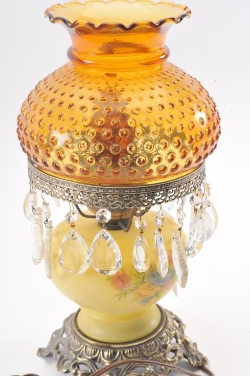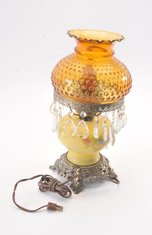 Vintage table lamp with decorative hand painted frosted glass and brass base. The shade is amber glass hobnail with crystal dangles. The lamp is 13” in height and working at the time of description. Est.:$25-$50.