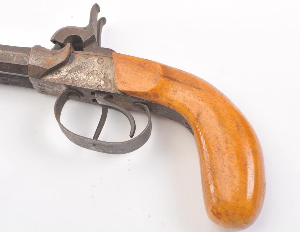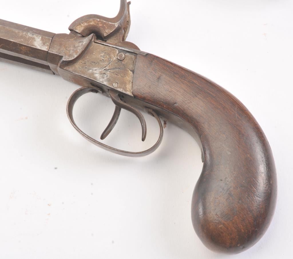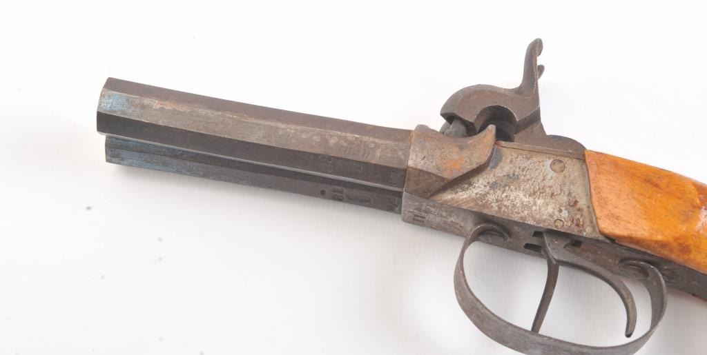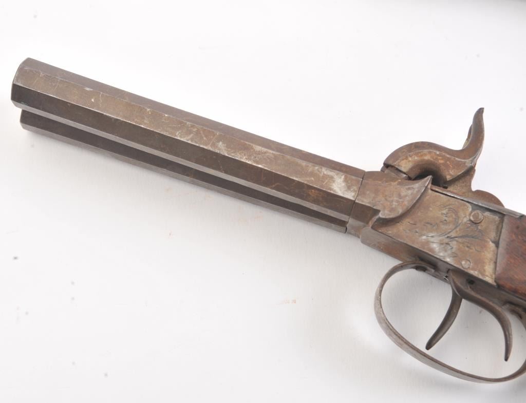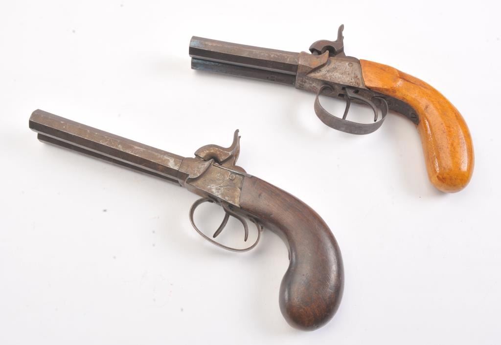 Lot of two double barrel percussion pistols, both pistols are approximately .45 caliber and both feature octagon barrels. The first pistol has 5” barrels with a fleur-d-lis engraved on the action. The second pistolhas 3” barrels with European proofs. Both pistols have smooth wood grips in good condition and double triggers. Est.: $150-$300. (Antique).