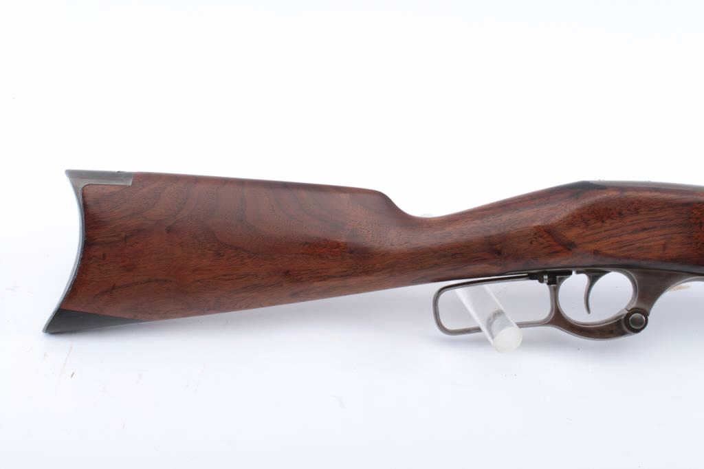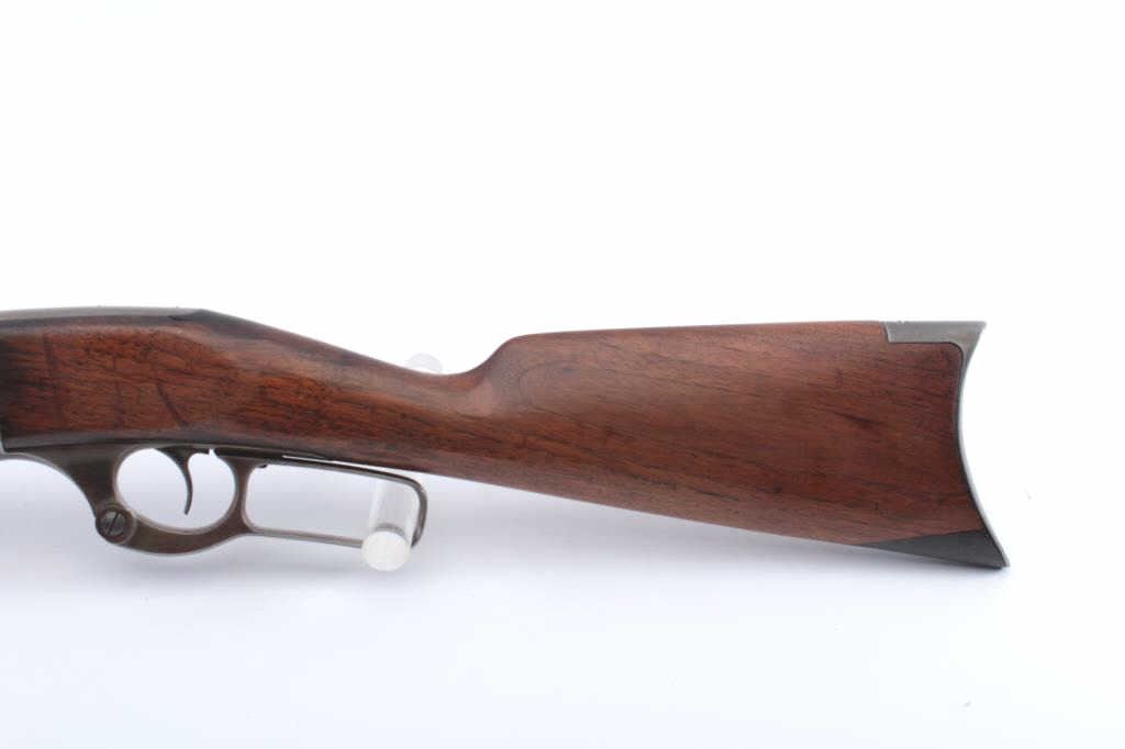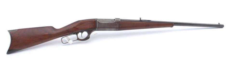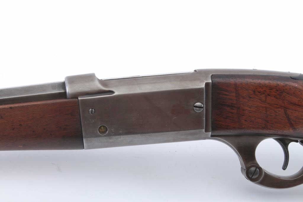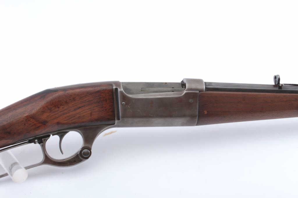 Early Savage Model 1899 lever action rifle, .30-30 caliber, Serial #31624. The rifle is in very good overall condition with a 23” octagon barrel with a blade front and Marble’s rear sights. The metal surfaceshave drifted to a grey/brown patina with sharp edges and crisp markings. The rotary magazine works well with the brass cartridge counter on the left side of the receiver. The smooth wood stock is in good conditionwith a small dark wood repair at the toe. The bore is good, the action is crisp and the markings are sharp on this early Model 99. Est.: $600-$1,200. (C+R).
