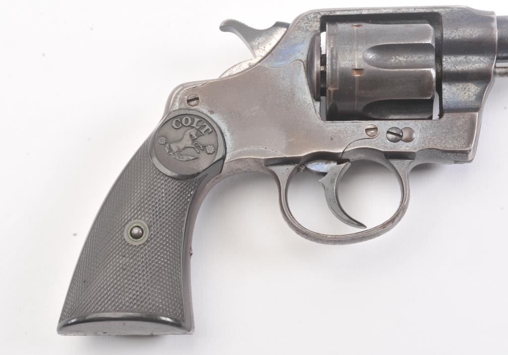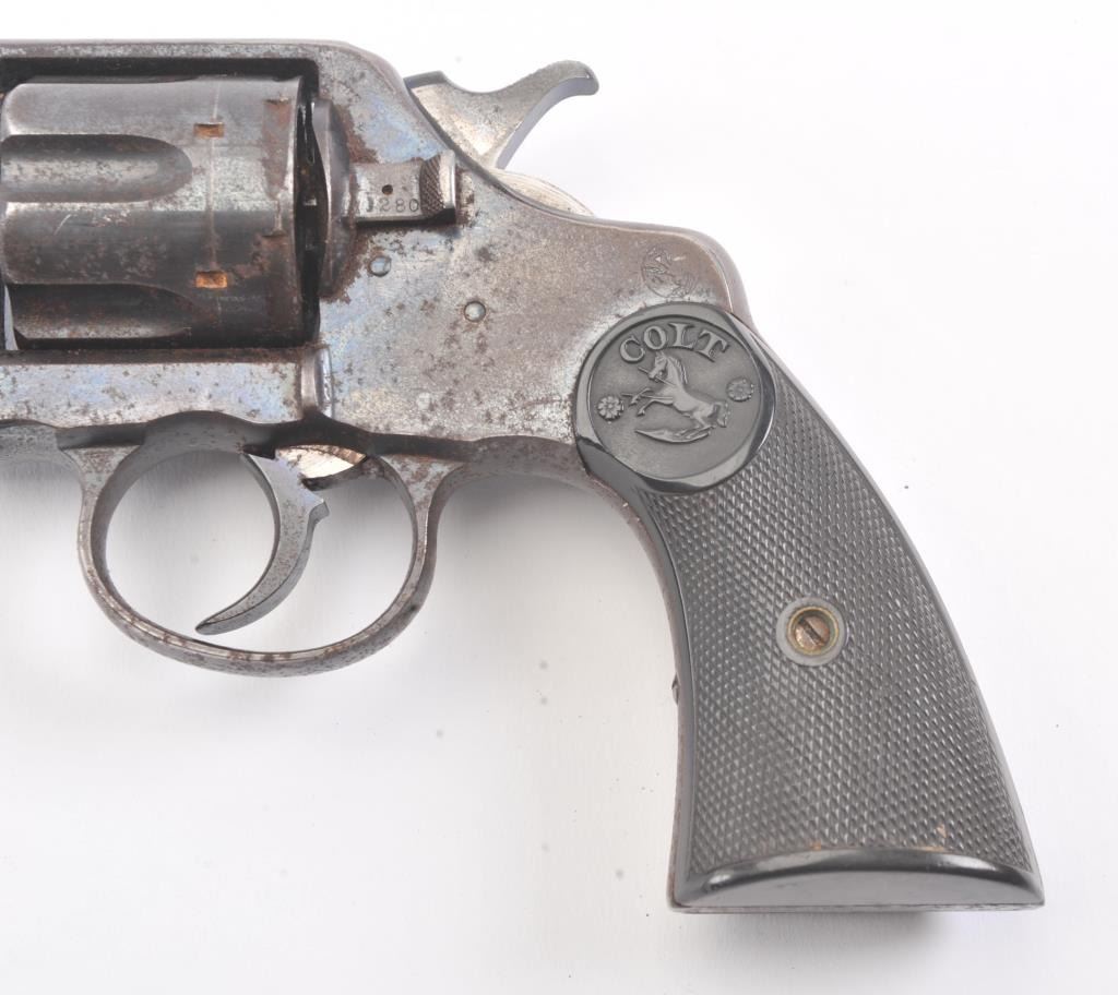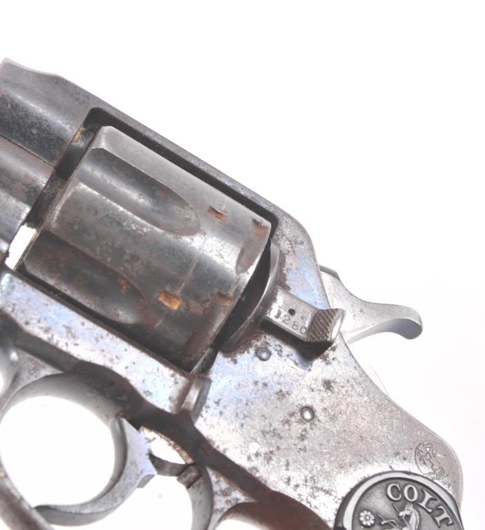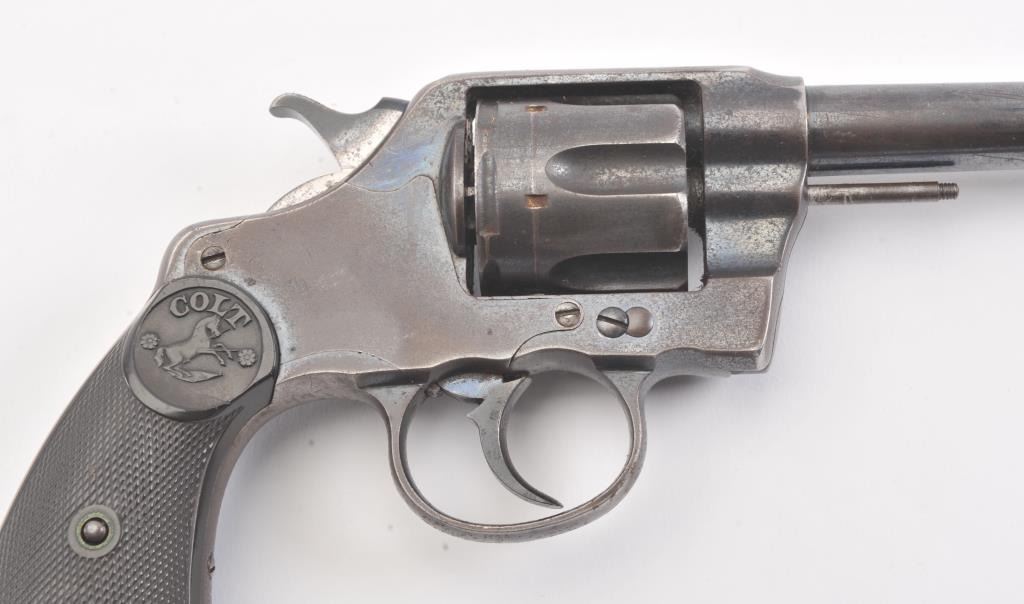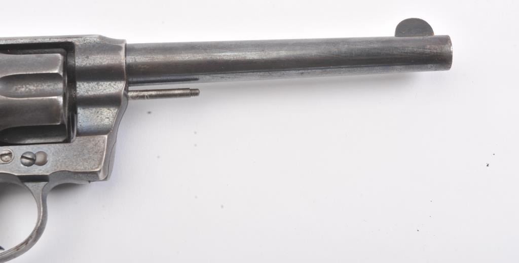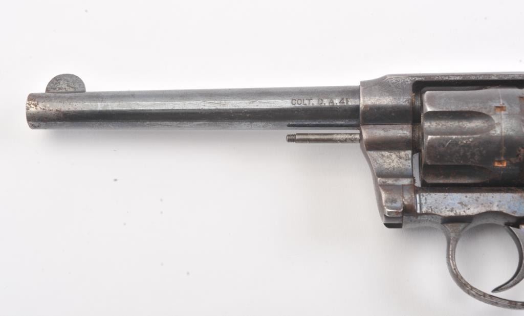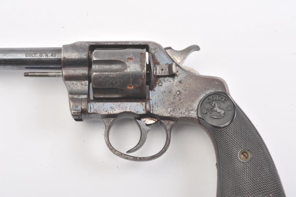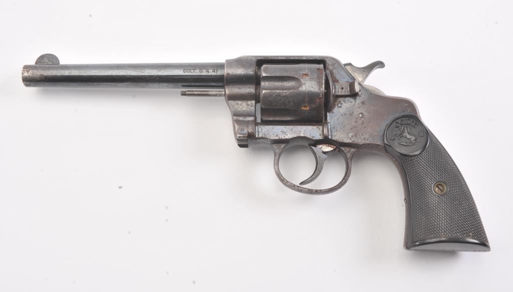 Colt DA .41 revolver, .41 Long Colt caliber, Serial #254218. The pistol is in good overall condition with a 6” barrel. The pistol retains approximately 65%-70% of the original blue finish with light to moderatesurface rust due to poor storage. The action is locked up, non-functioning and should be checked by a competent gunsmith. The pistol shows areas of bright niter blue finish like the rear of the hammer. The checkered hardrubber Colt marked grips are in very good condition. A commercial version of the New Army and Navy models, this one would benefit from some TLC. Est.: $200-$400. (C+R/PPT).