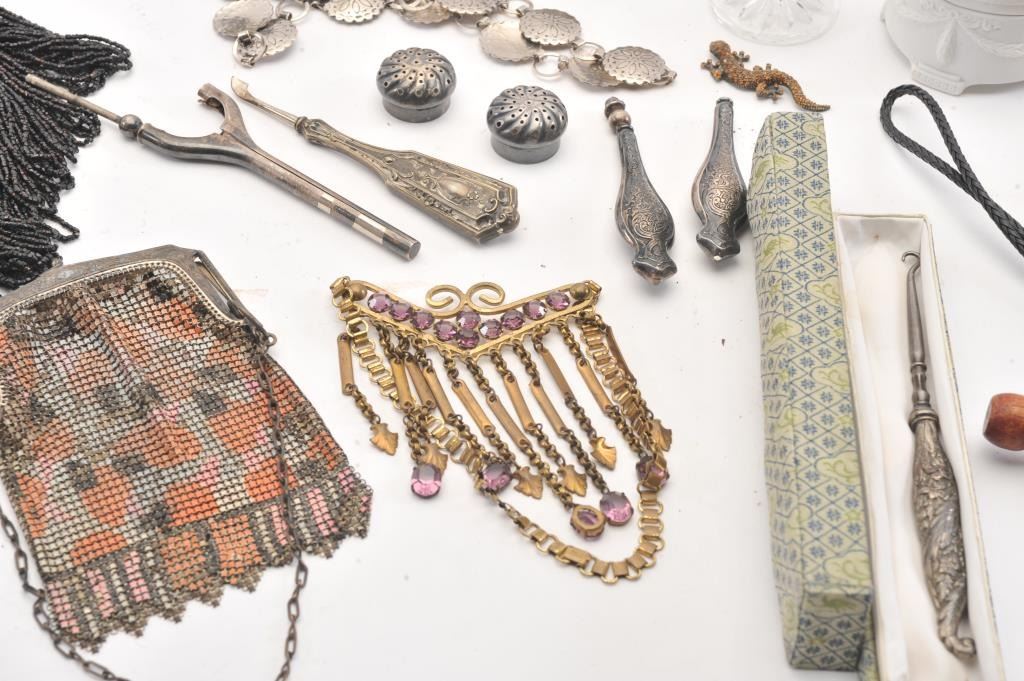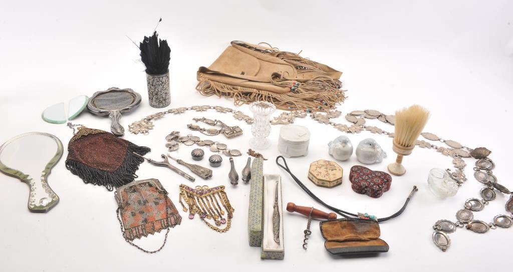 Vintage Costume Jewelry lot with Vintage beaded purse, mirror & other items. Est:$200-400