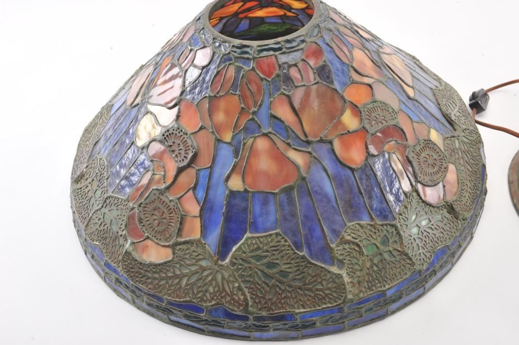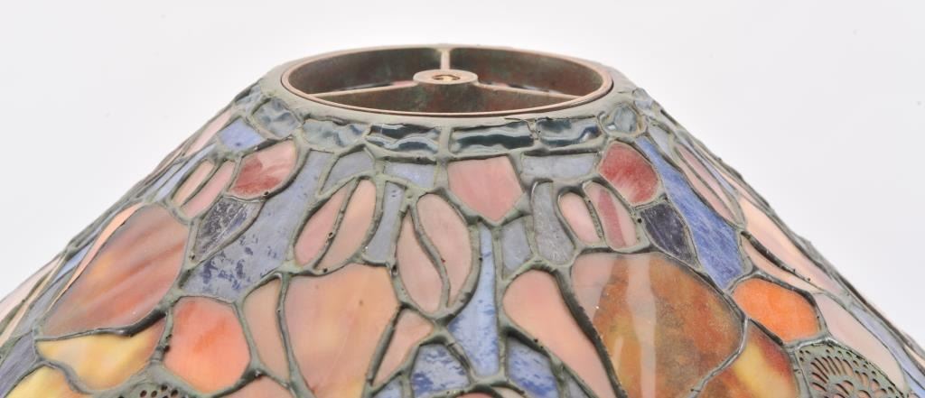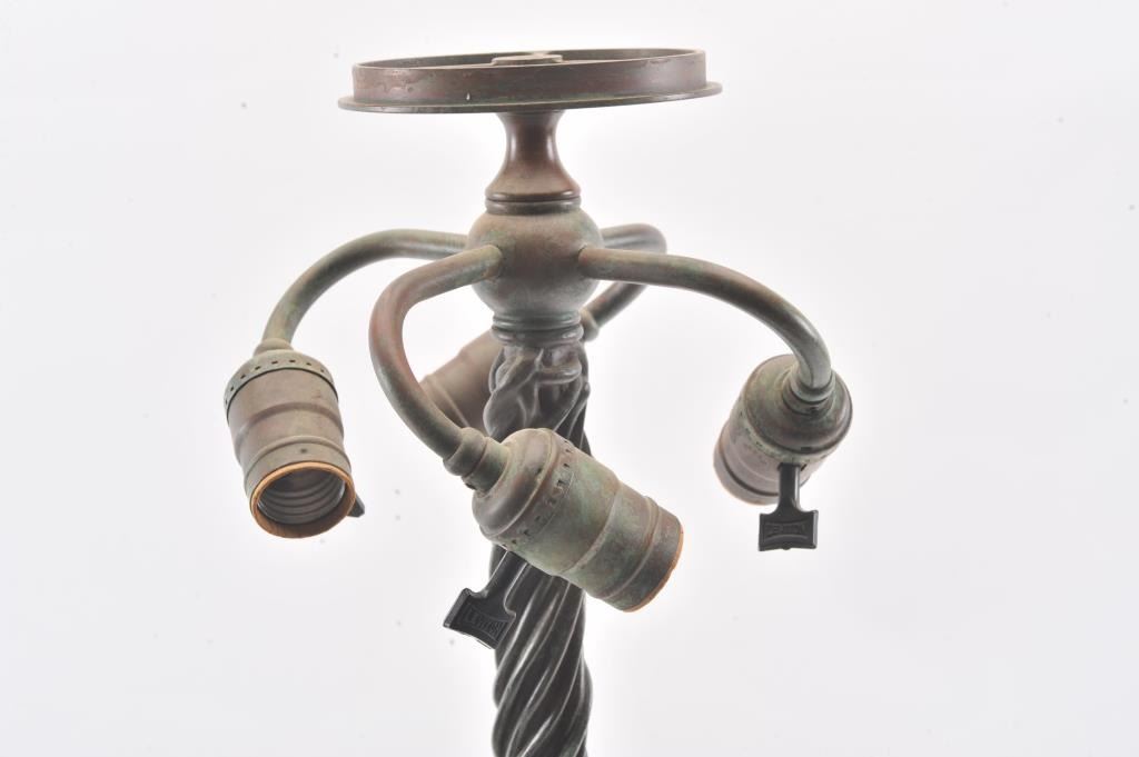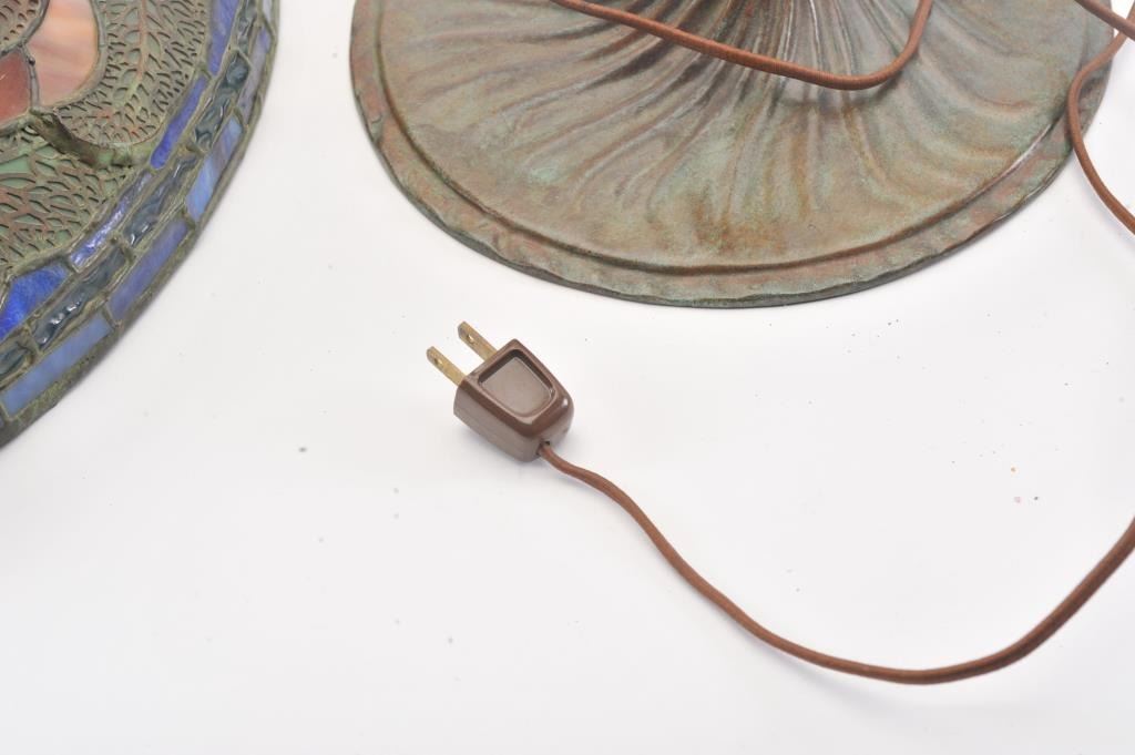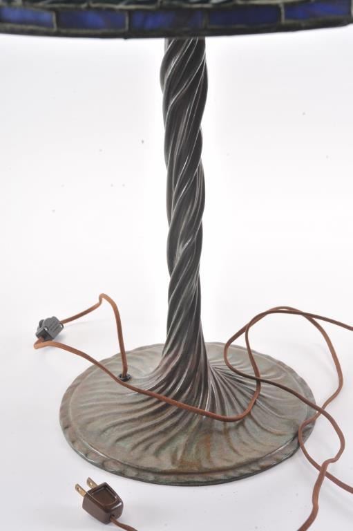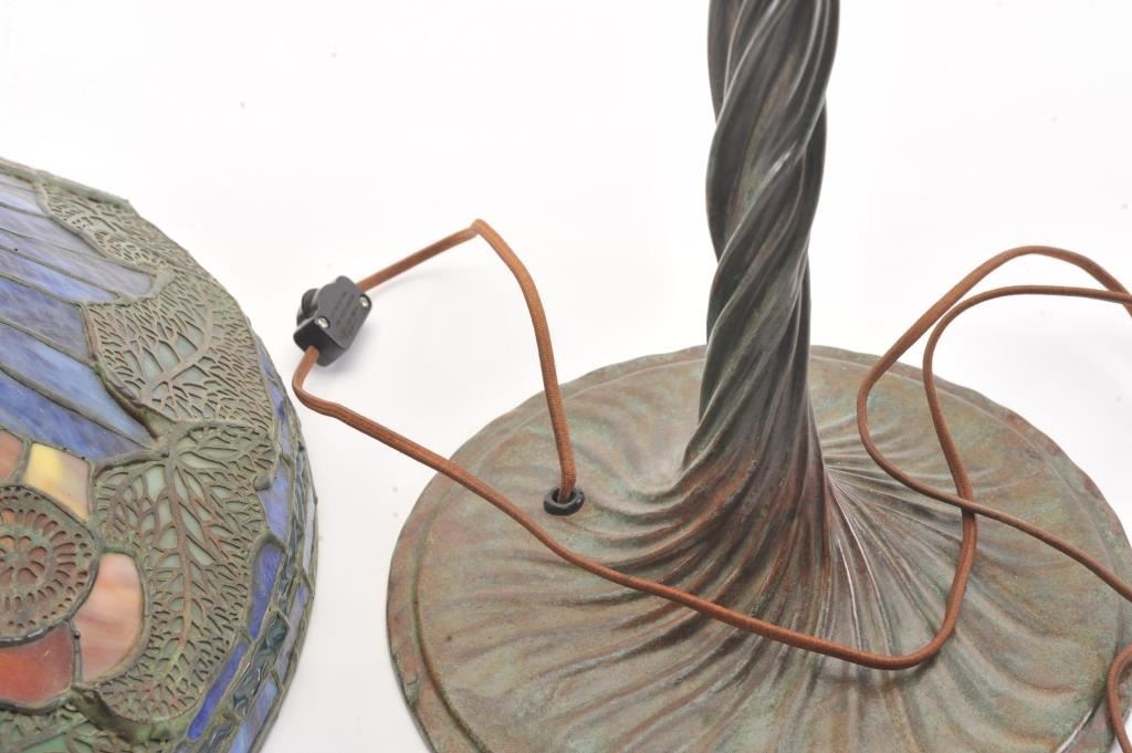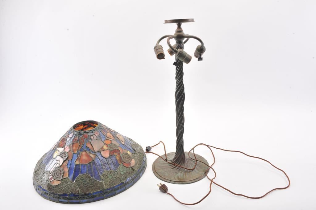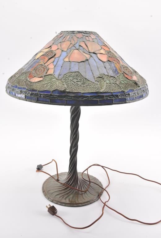 Vintage reproduction Tiffany style table lamp with antiqued brass base and stained glass style shade. The shade is decorated in a lily pad theme with a 4 ½” fitter and 20” across. The base is antiqued brass with agreen tint in a twisted trunk motif. The shade and base are both is very good condition. Est.: $150-$300.