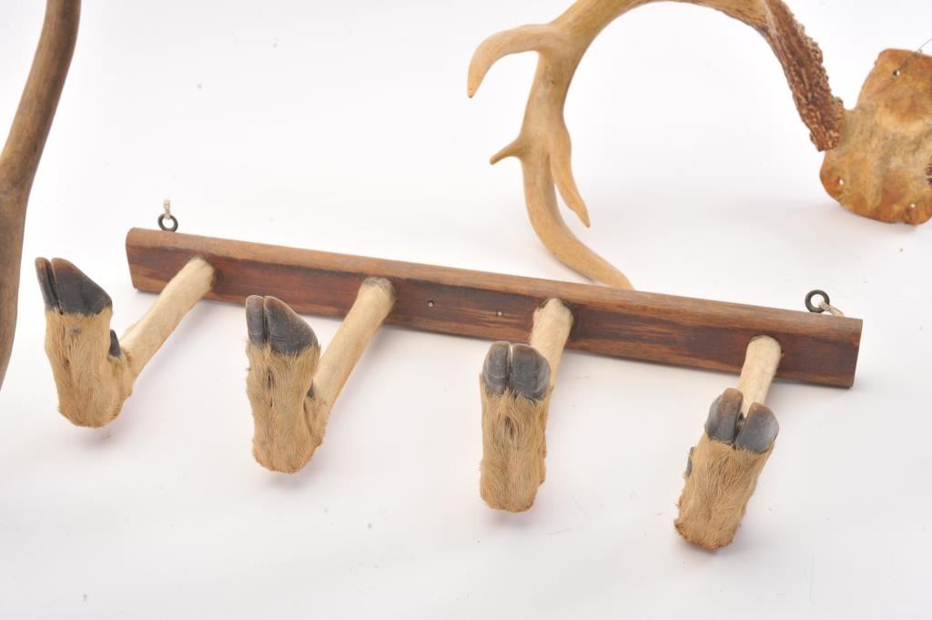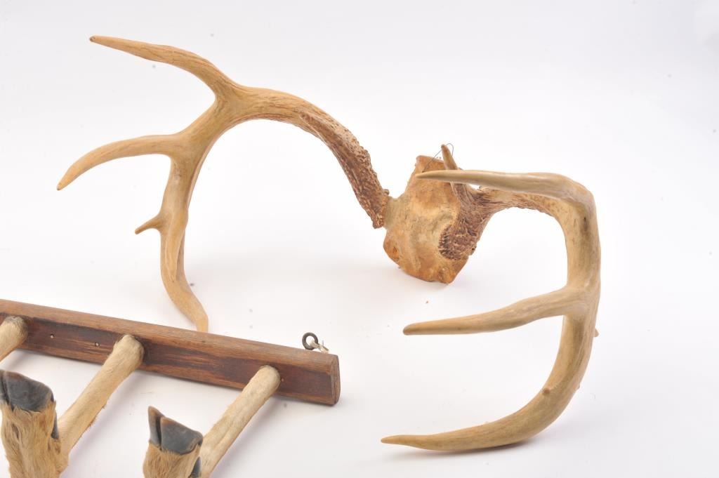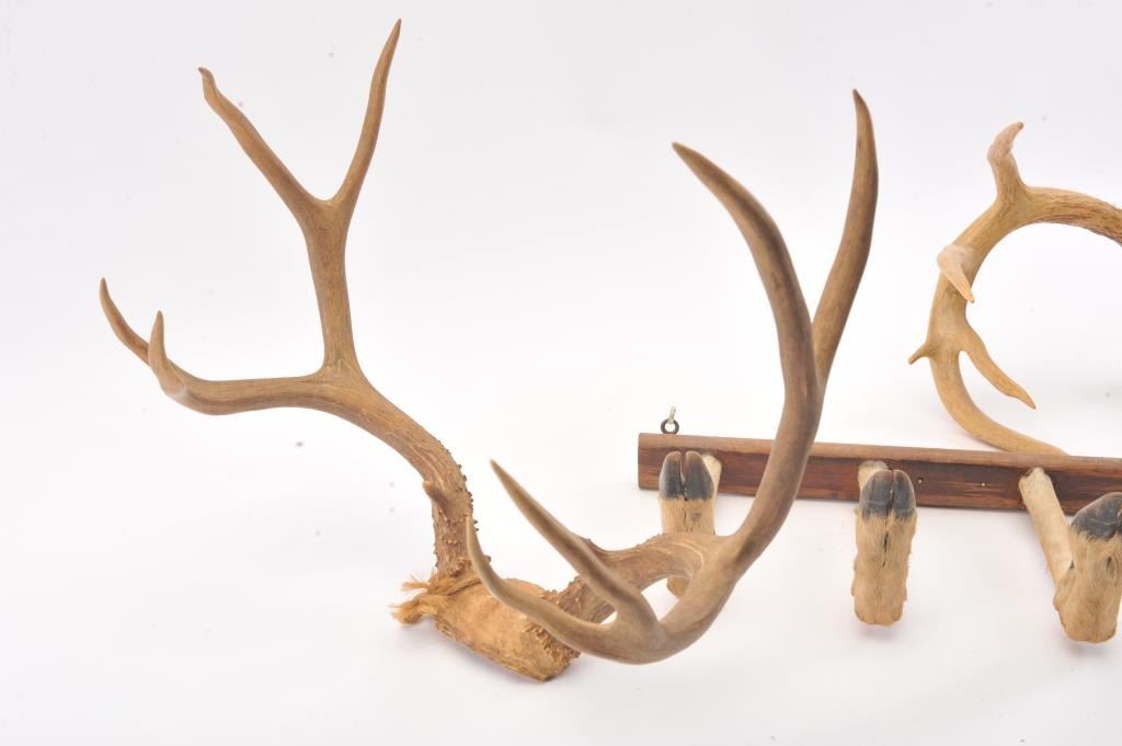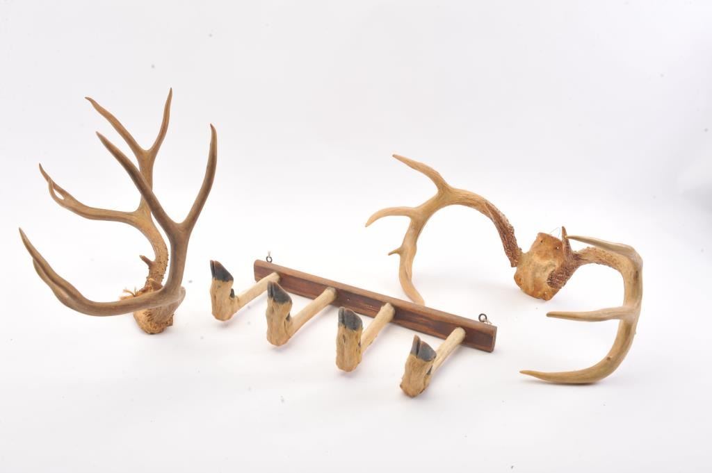 3 sets of antlers along with a hoof rack. Est:$150-300