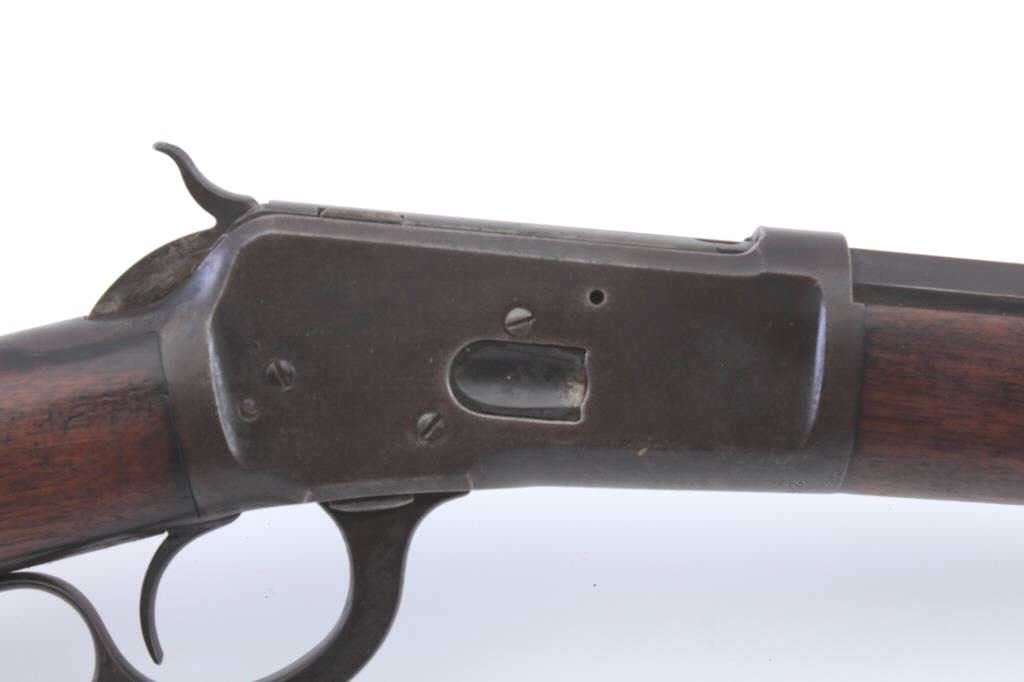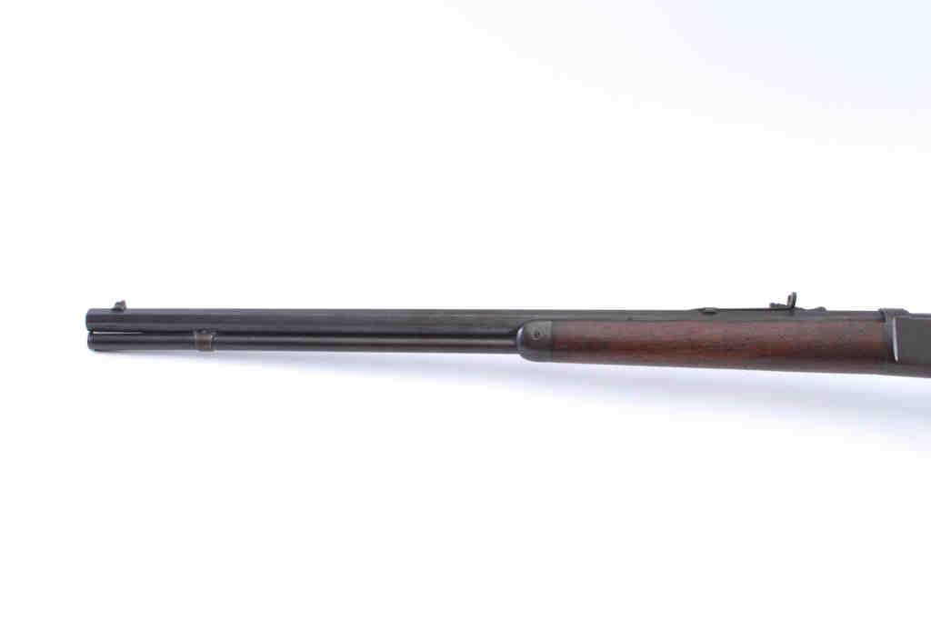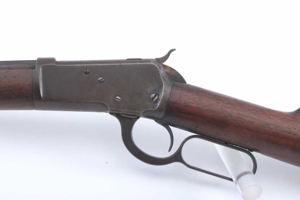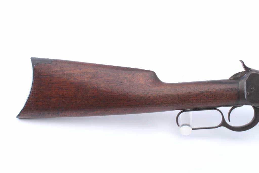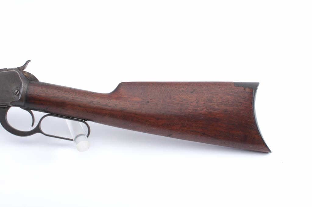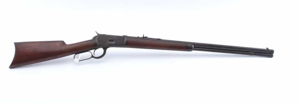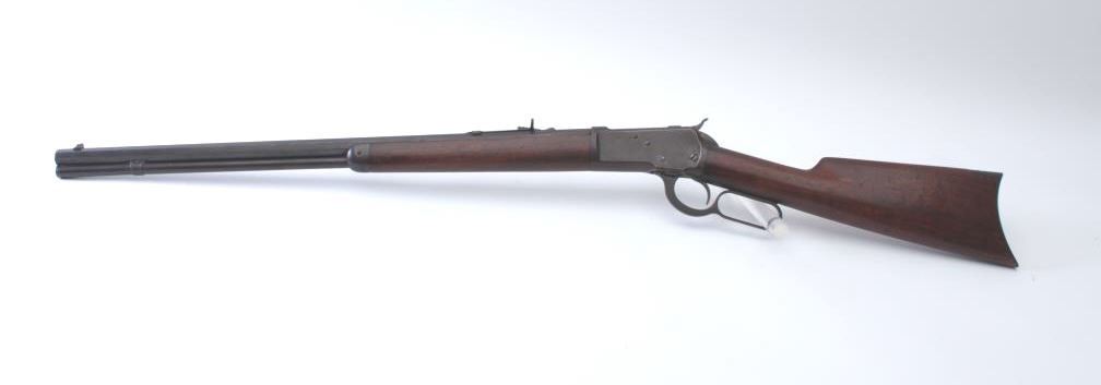 Winchester Model 1892 lever action rifle, .25-20 WCF caliber, Serial #269388. The rifle is very good overall condition with a 24” octagon barrel with a full-length magazine. The metal surfaces have gone to apleasing plum patina with original muted blue in the protected areas and dull case hardening still evident on the hammer. The smooth wood stock is in good condition and the butt stock ends with a smooth steelcrescent butt plate. The bore is rough but may clean to fair. The action is crisp and the markings are sharp. Est.: $400-$800. (C+R).