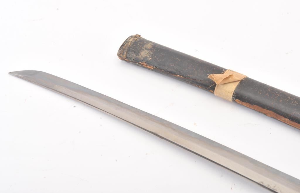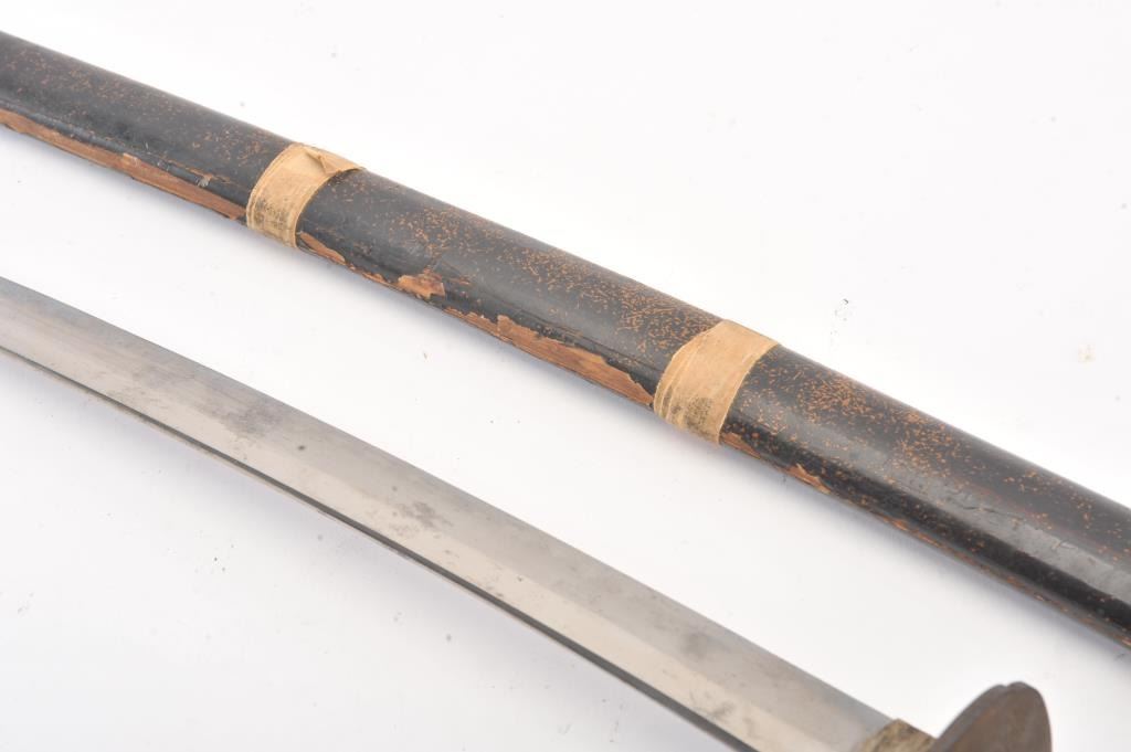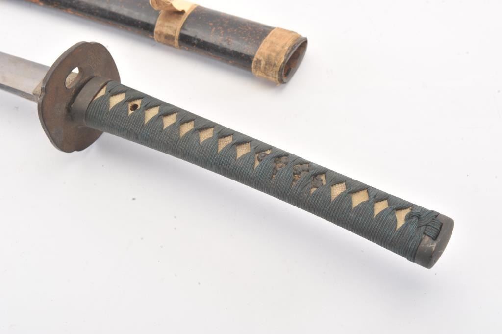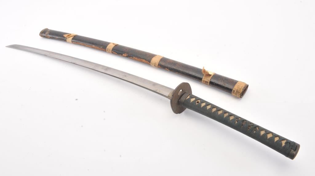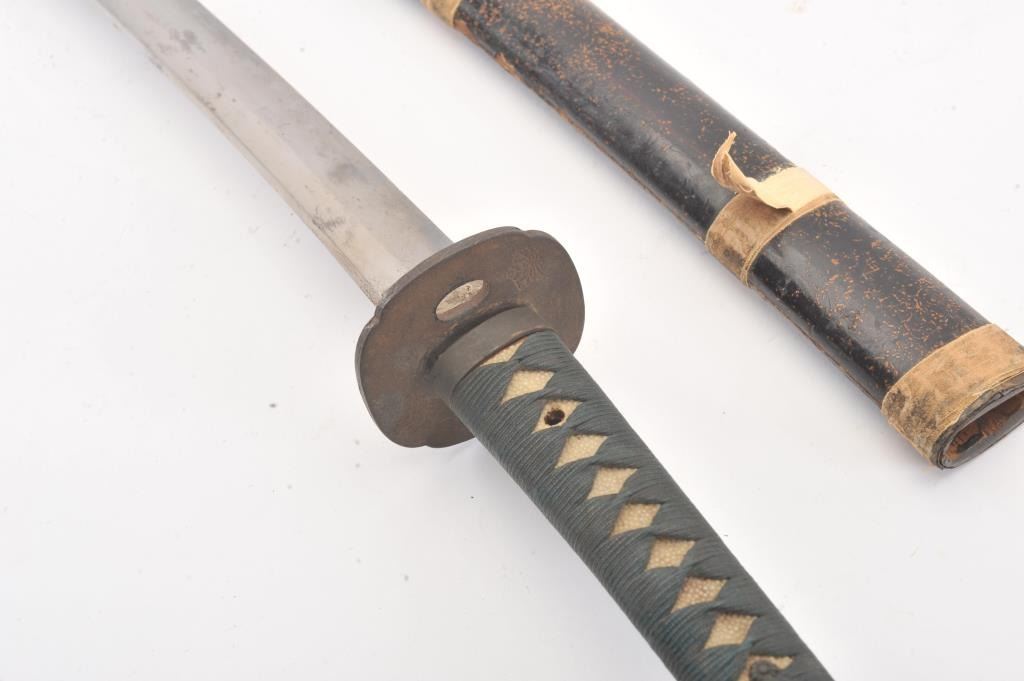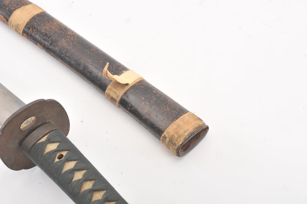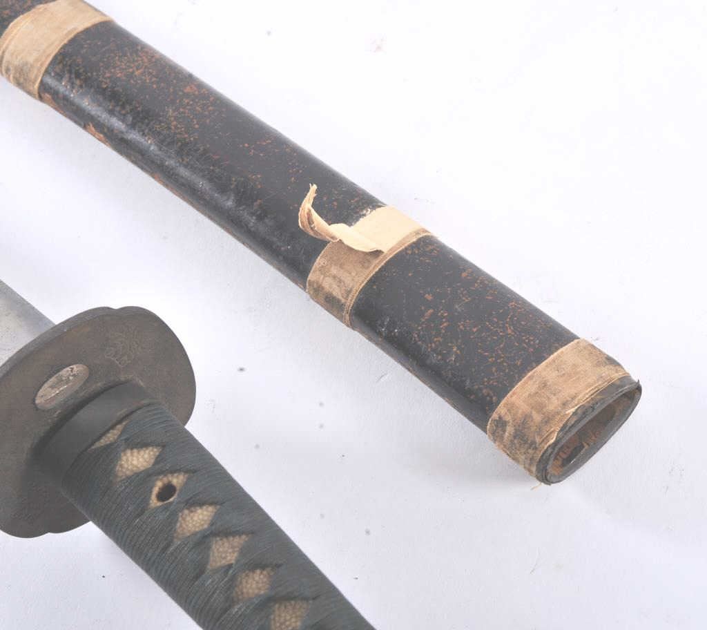 Japanese Samurai sword with 26 ½” blade in traditional late mountings with file marks and some dark rust on one side of the tang (the other side was cleaned to see signature, which is illegible). The blade condition is good with nice temper and a good iron tsuba. The scabbard is broken. A 92 year old collector’s attic find sword. $500-$1,000.