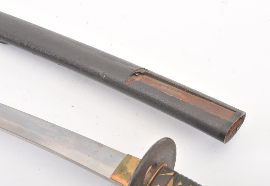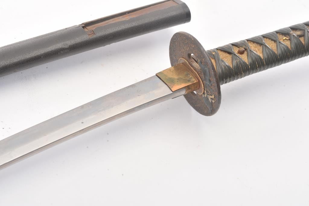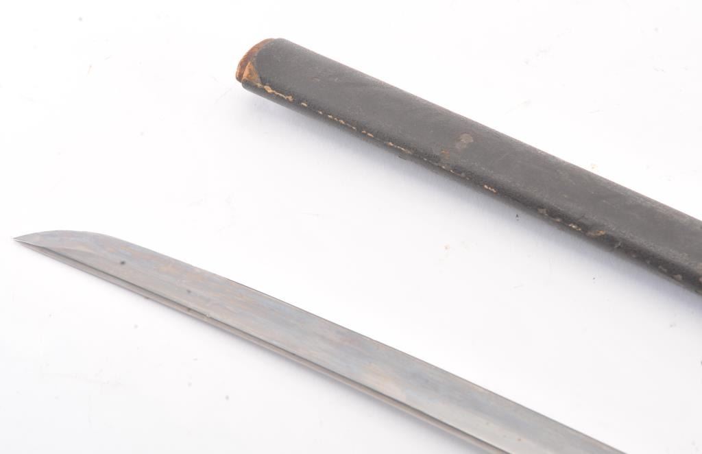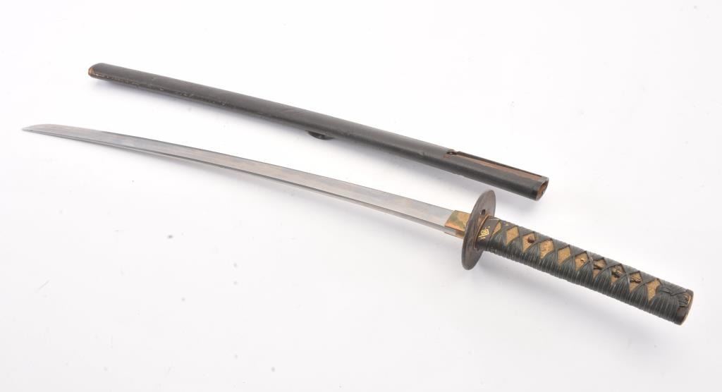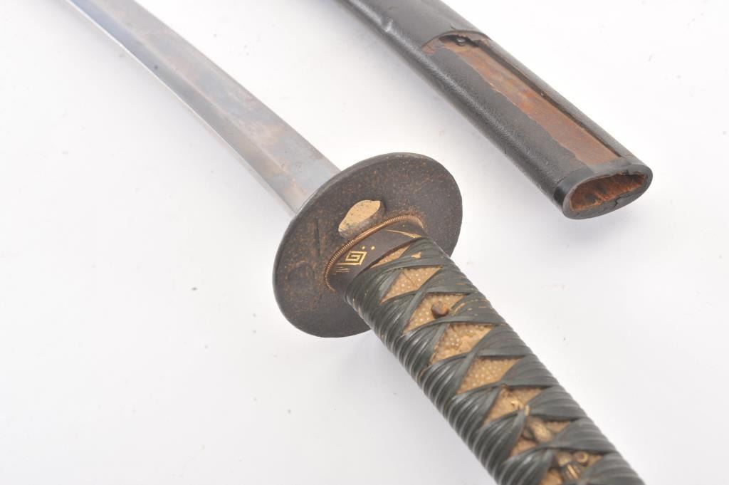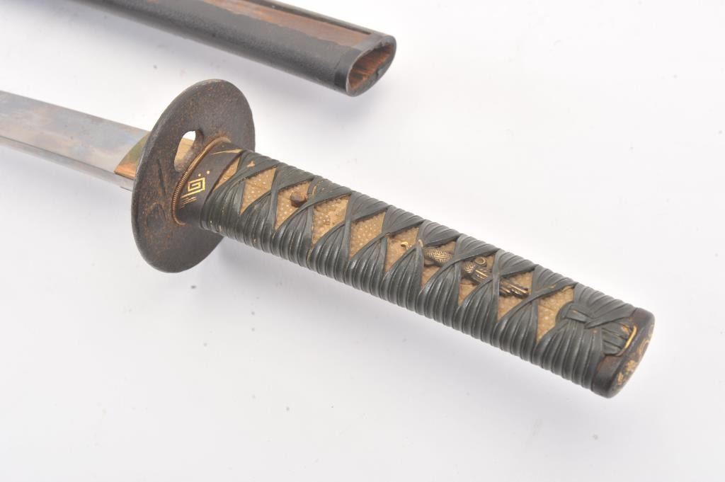 Japanese Wakasashi or medium size sword for samurai in traditional mountings showing gold inlay and fancy menuki of quiver and arrows. The sword has a 20 plus inch cutting edge with no visible cracks or core showing. Thetemper line is visible around the tip and it has been incorrectly cleaned. The blade shows some finger prints and scratching. The grip is rusted onto the tang and unable to be removed. From the attic of a 92 year oldcollector, missing the kozuka and accessories in the scabbard. Est.: $300-$600.