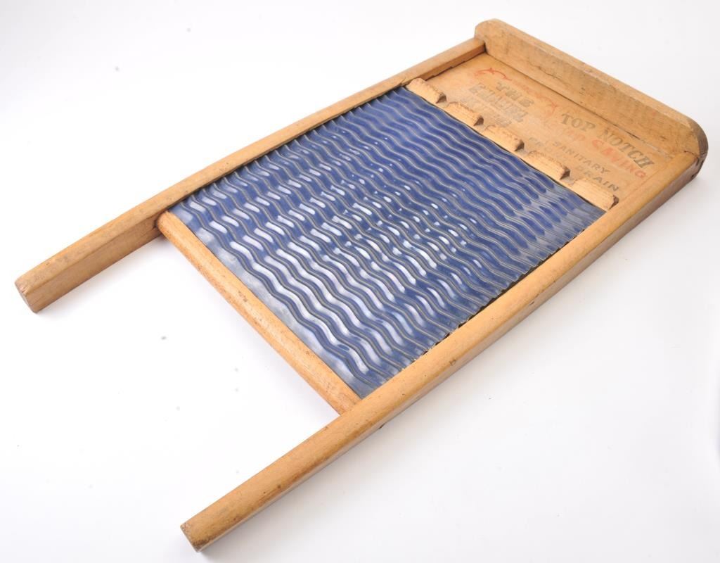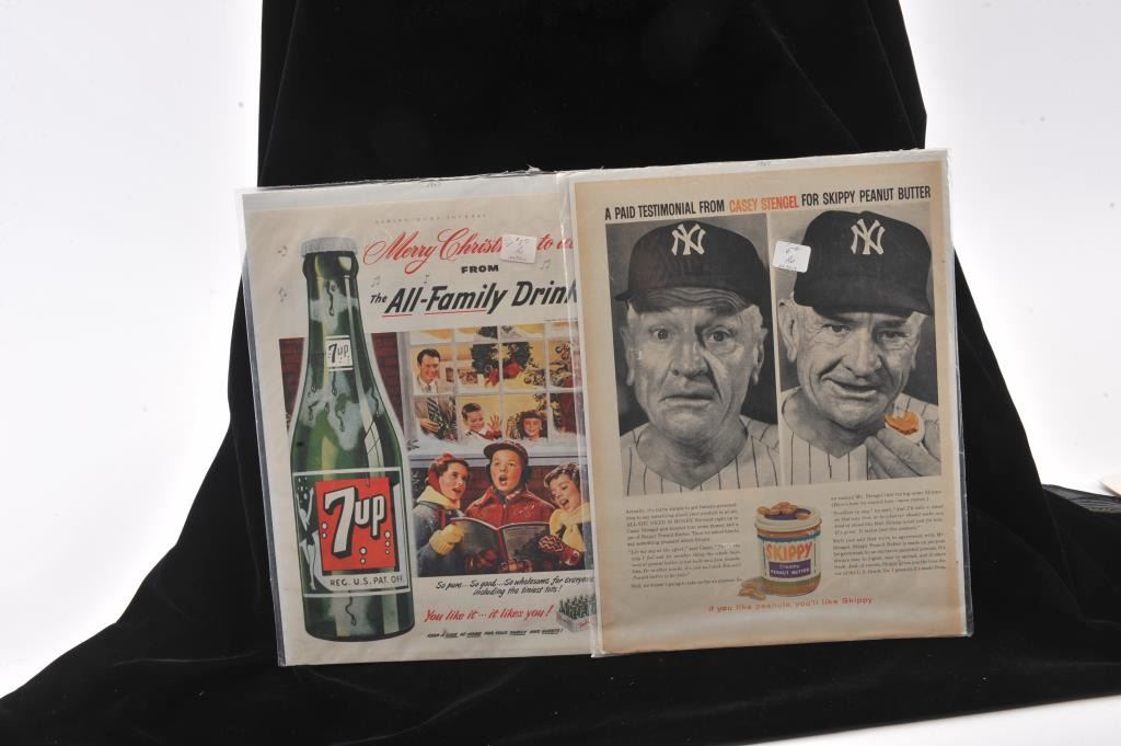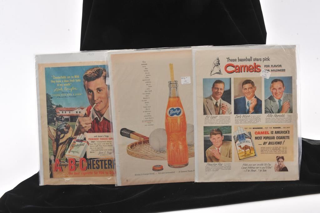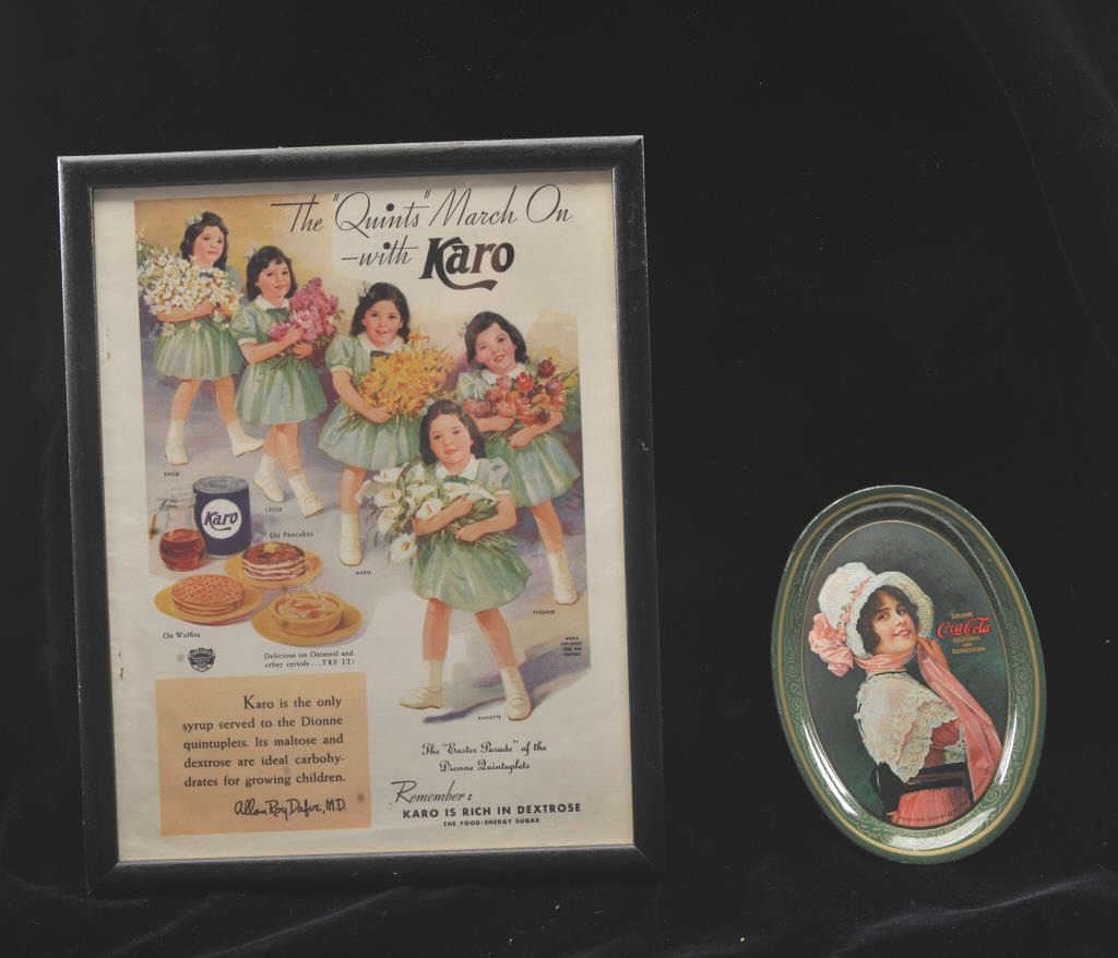 Vintage advertising lot including: a wood and tin Top Notch wash board, reproduction Coca-Cola tip tray, a period Karo syrup advertiser featuring the “Dionne” quintuplets, a Sweet-heart Sugar Cones tinstorage container and five 1950’s advertising flats featuring Kirk Douglas, MLB stars and others. A great lot of advertisers in good to very good condition. Est.: $100-$200.