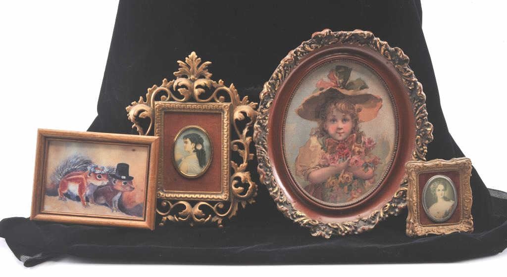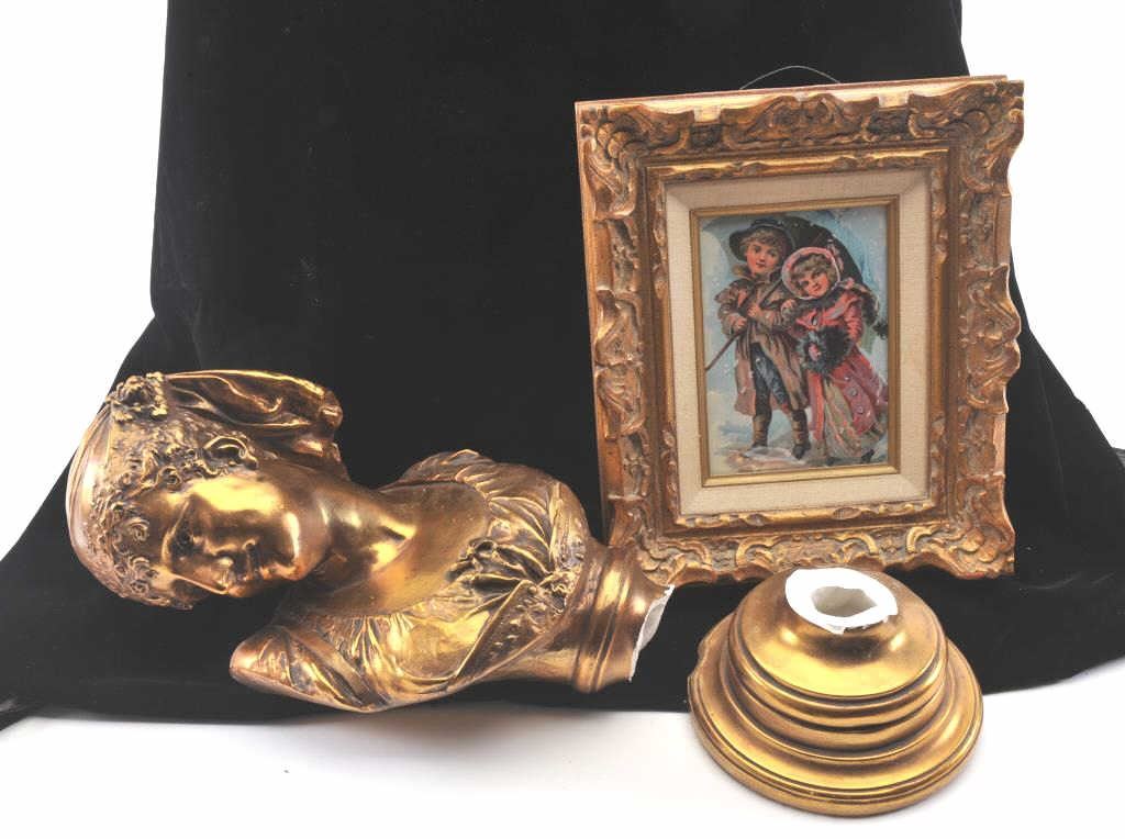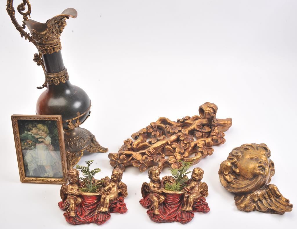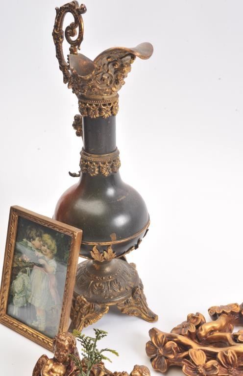 Great lot of vintage decorator pieces including: hand painted gold tone cherub wall sconces, floral wall mount for a candlestick, ornate reproduction European pitcher with brass hardware, four smallprints of children and animals in decorative wooden frames, two ornately framed cameo style portraits of 19th century woman on metal plates and a plaster of paris bust of a women with significant damage at the base.Est.: $50-$100.