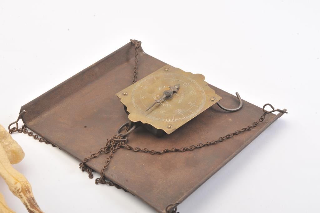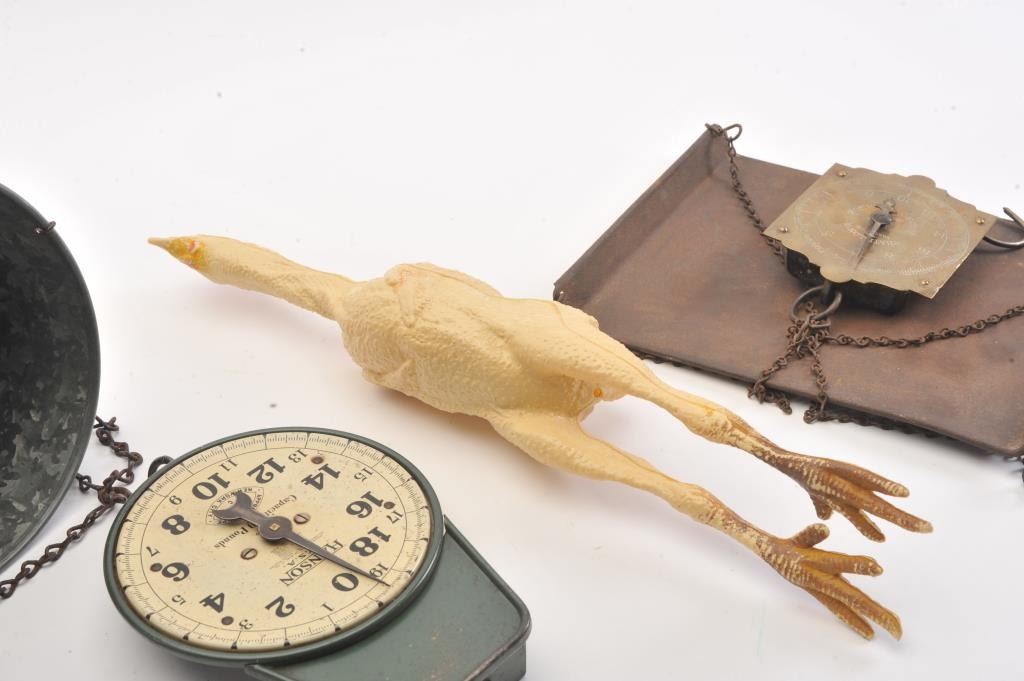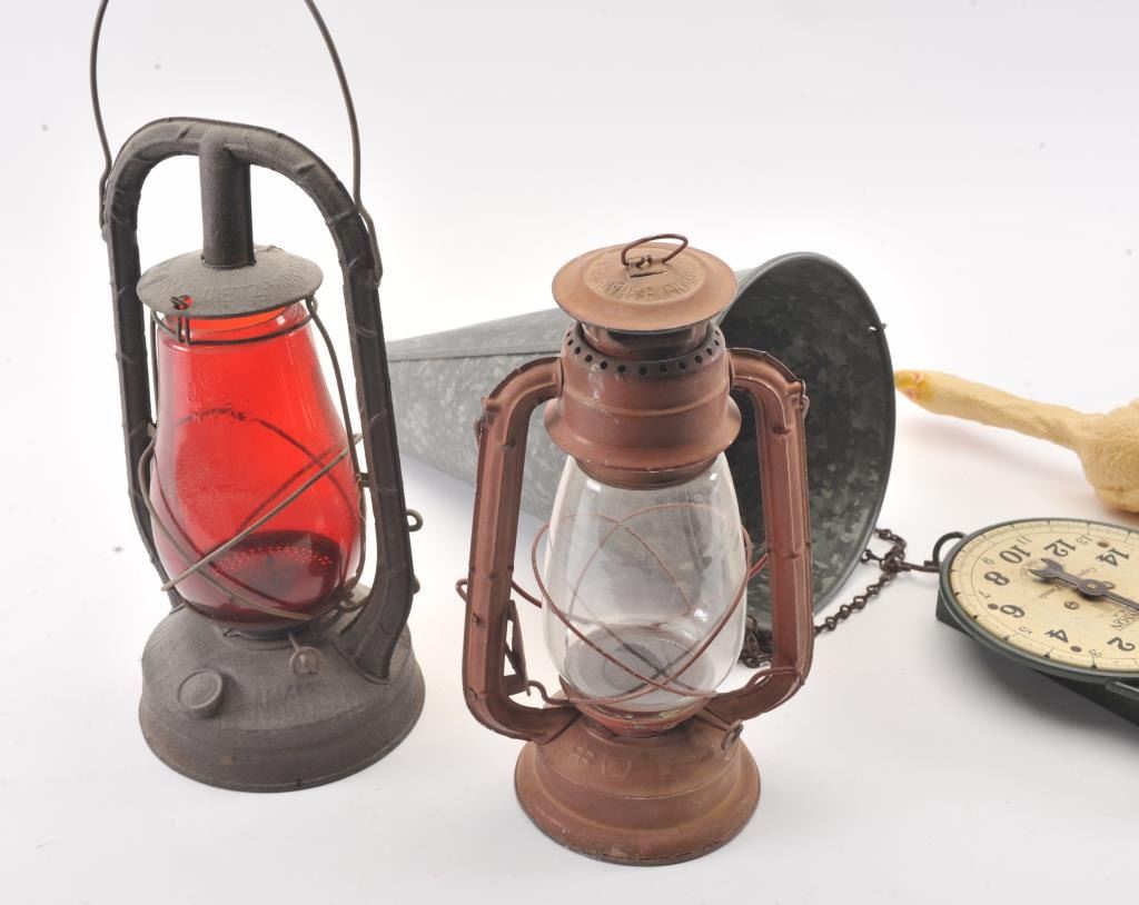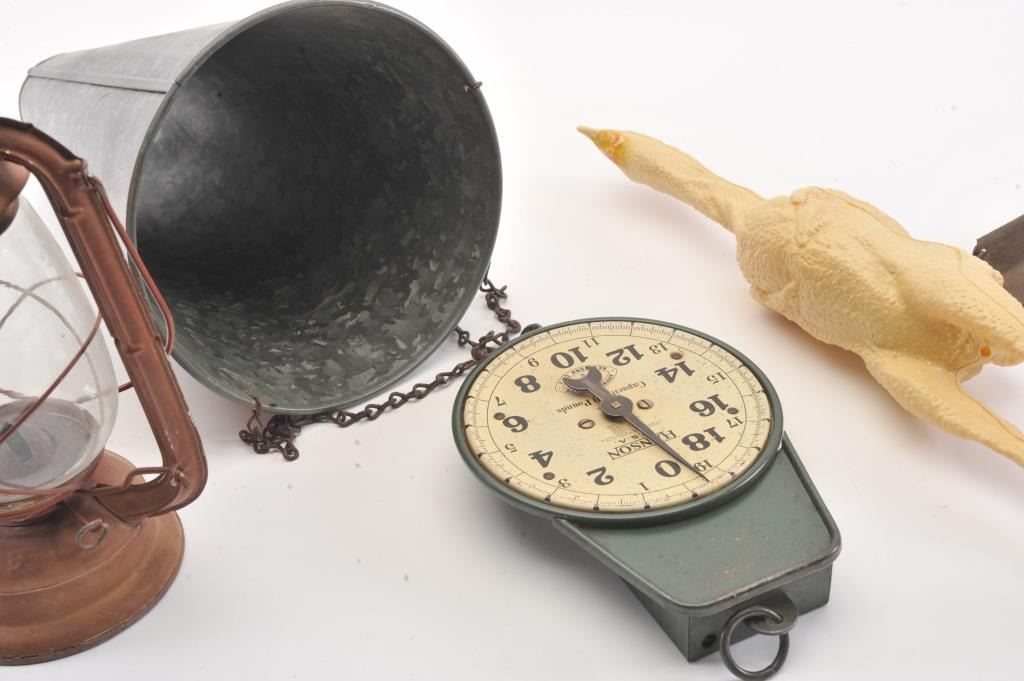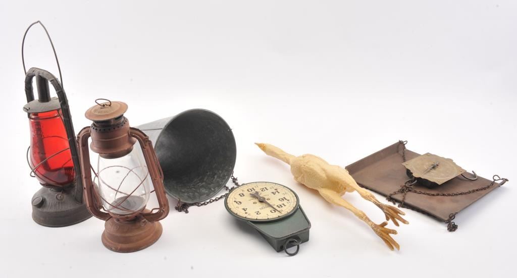 Lot consisting of 2 kerosene lanterns, two hanging scales and a metal chicken killing cone with hanging chain. Est.: $50-$100.