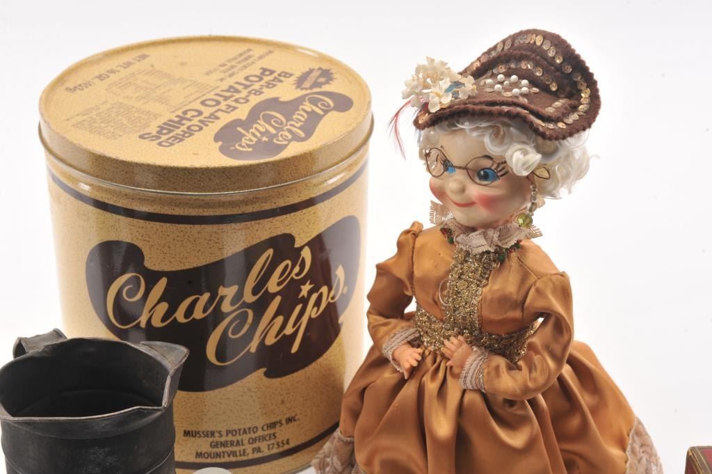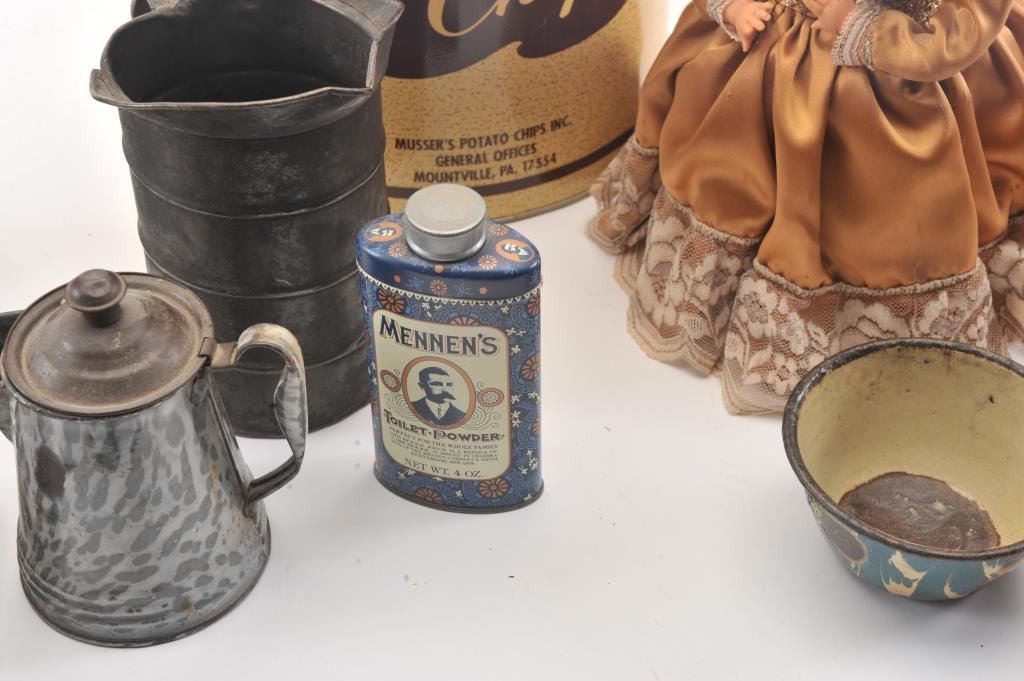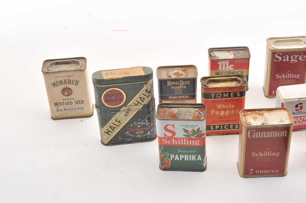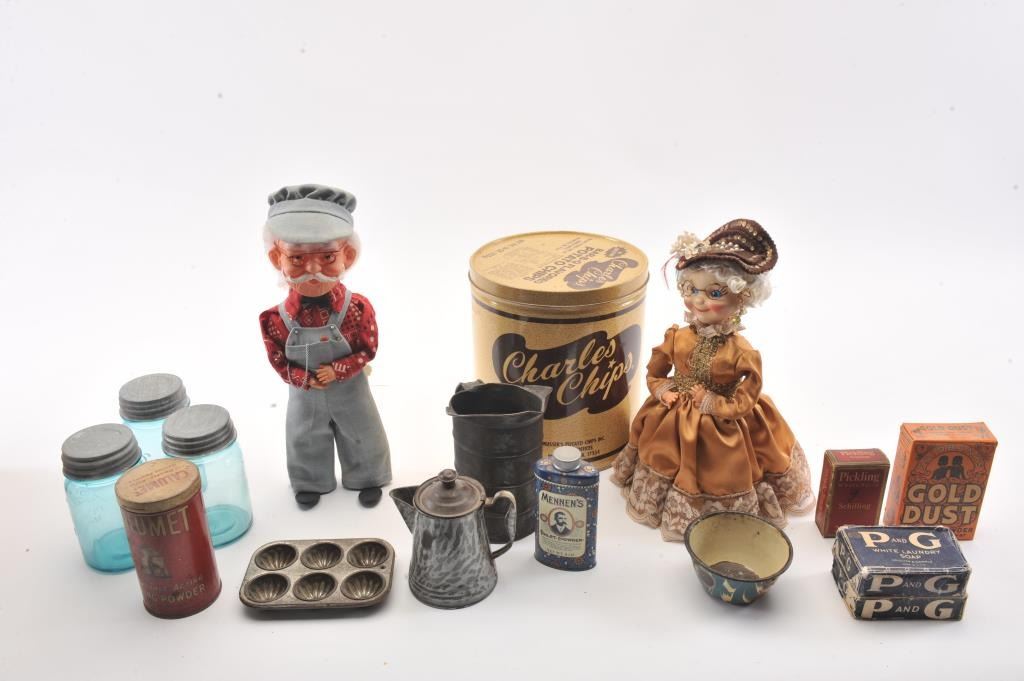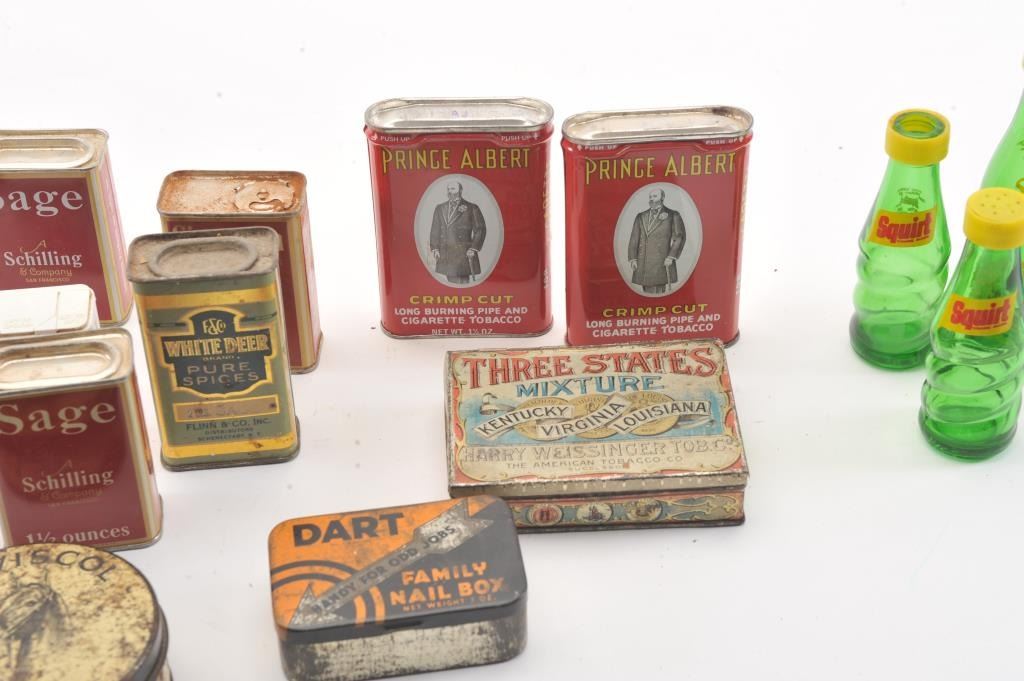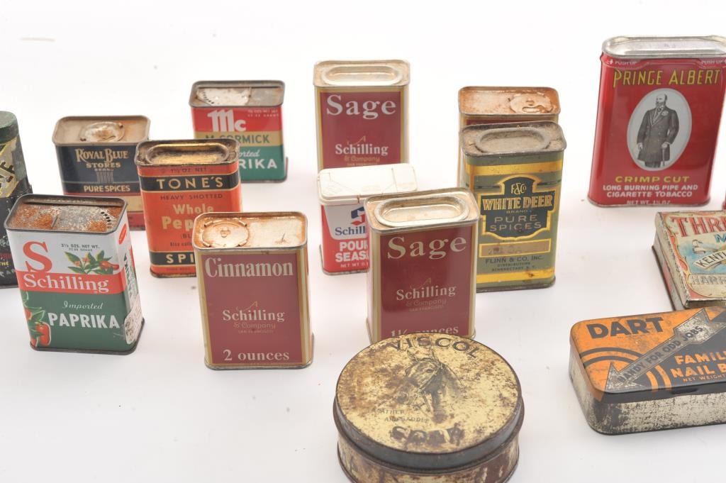 Advertising tin lot approx. 15 tins of various sizes and companies including Charles Chips, Prince Albert, Three States Mixture, spices, Dart. Along with various antique Kitchen items. Est:$200-400