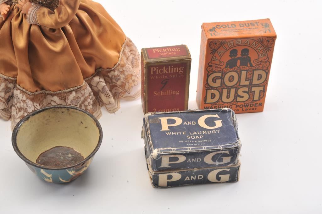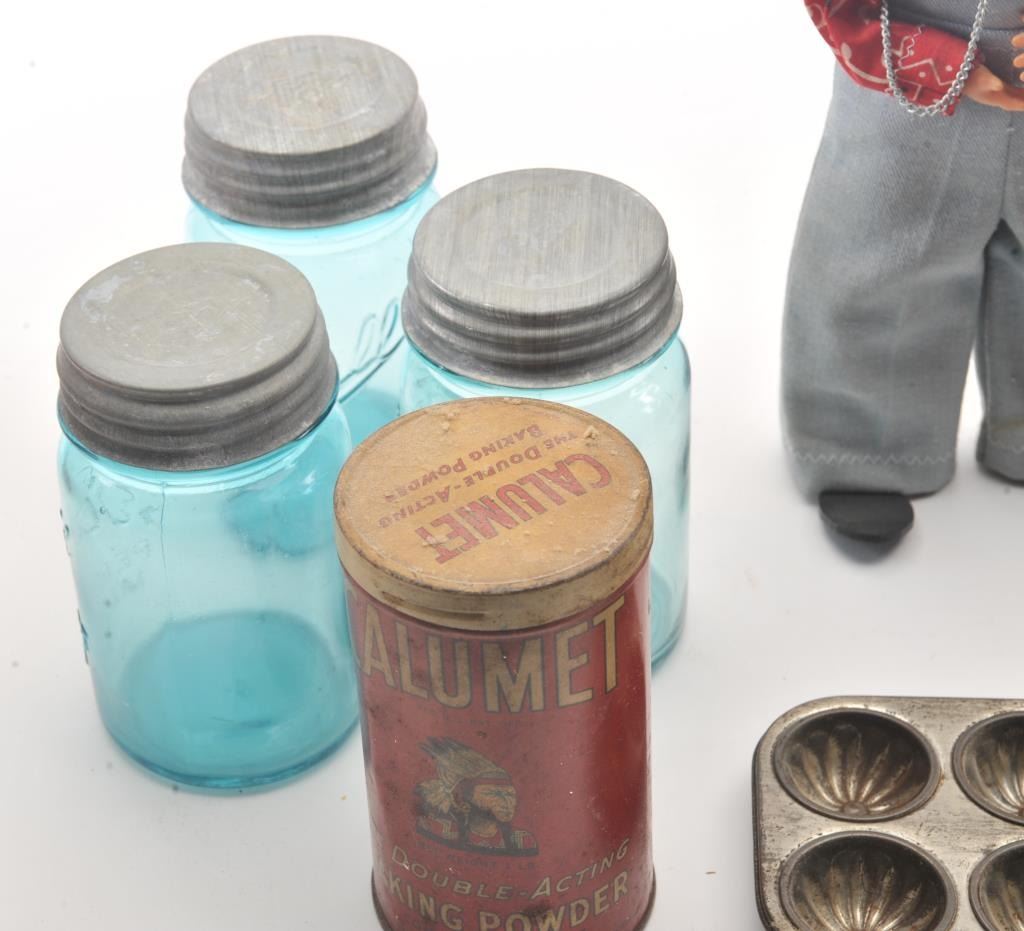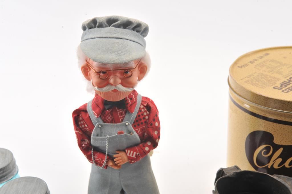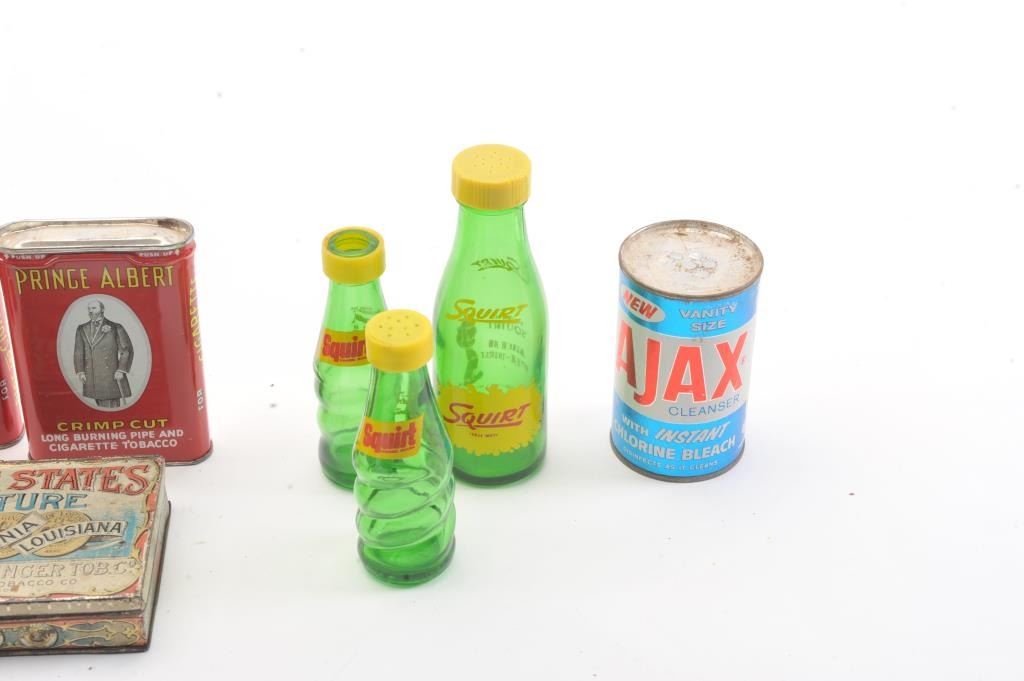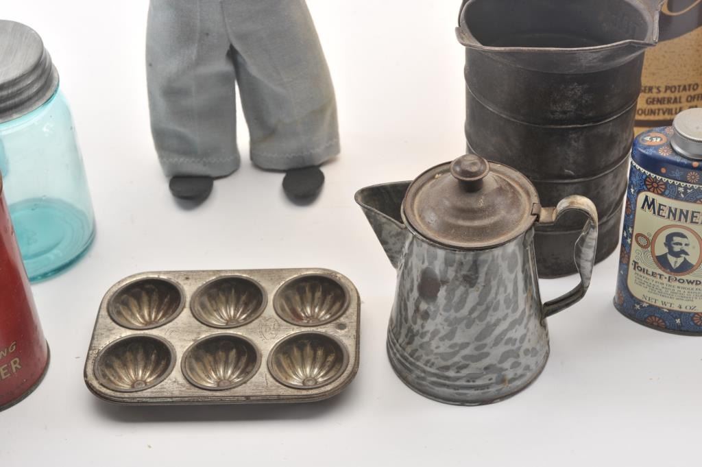 Advertising tin lot approx. 15 tins of various sizes and companies including Charles Chips, Prince Albert, Three States Mixture, spices, Dart. Along with various antique Kitchen items. Est:$200-400