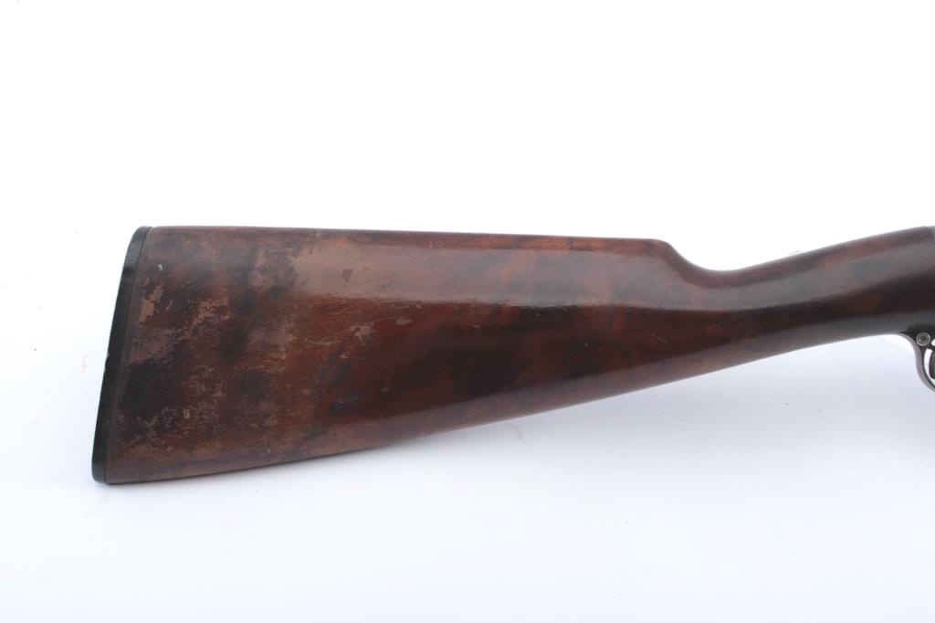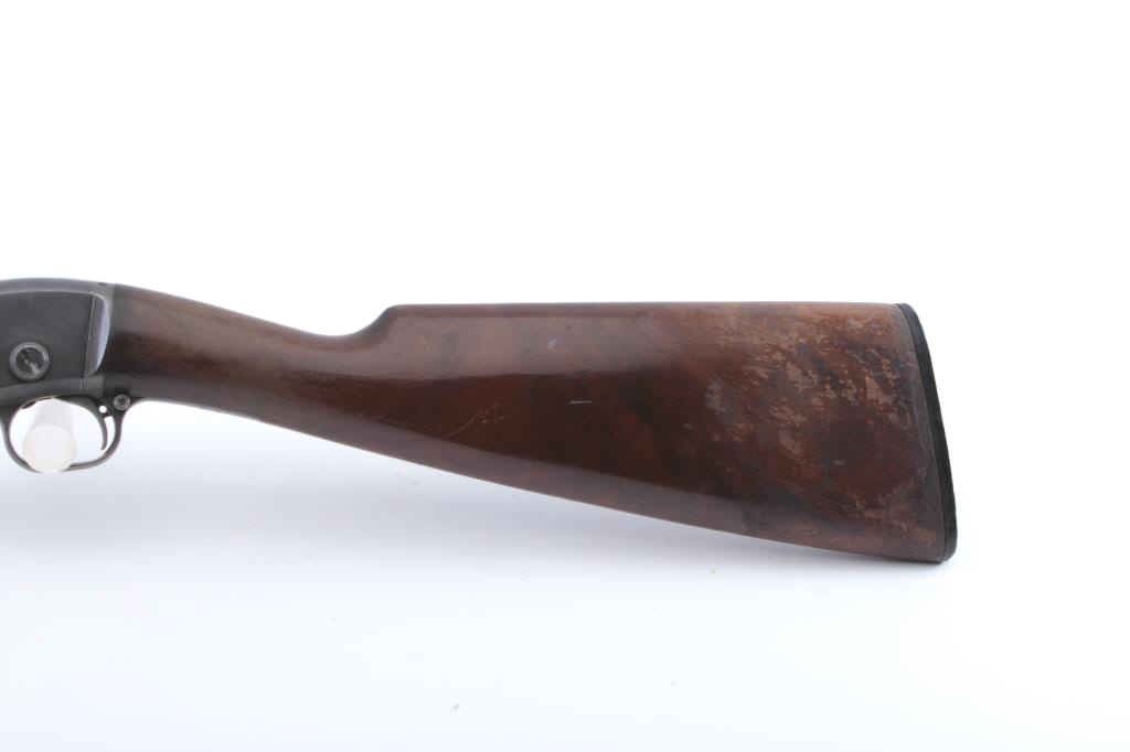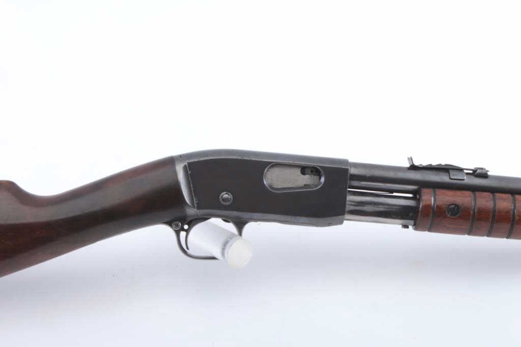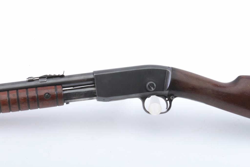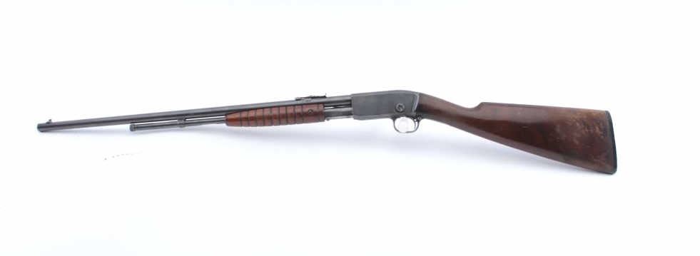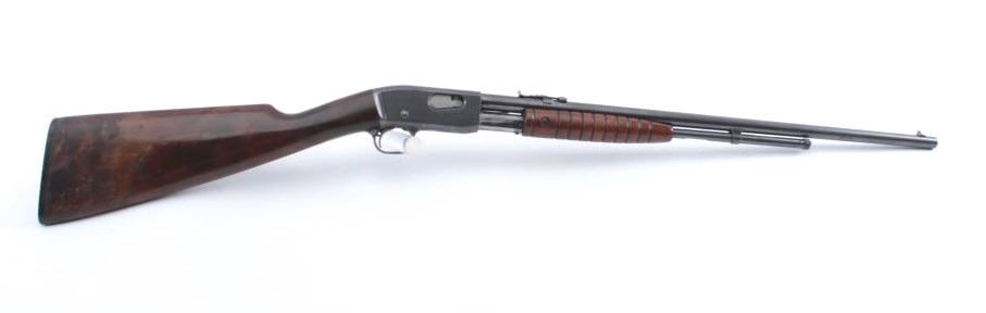 Remington Model 12-A takedown pump rifle, .22 Short, Long or Long Rifle caliber, Serial #441524. The rifle is in very good overall condition with a 22” round barrel and ¾ length magazine. The rifle retains asignificant amount of thinning blue finish with high point edge wear and light scratches. The smooth wood stock is in good condition with small mars and a loss of finish at the rear of the butt stock, whichends with a hard rubber butt. The bore is good, the action is crisp and the markings are sharp. Est.: $200-$400. (C+R).