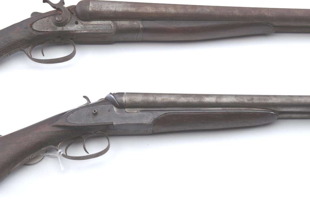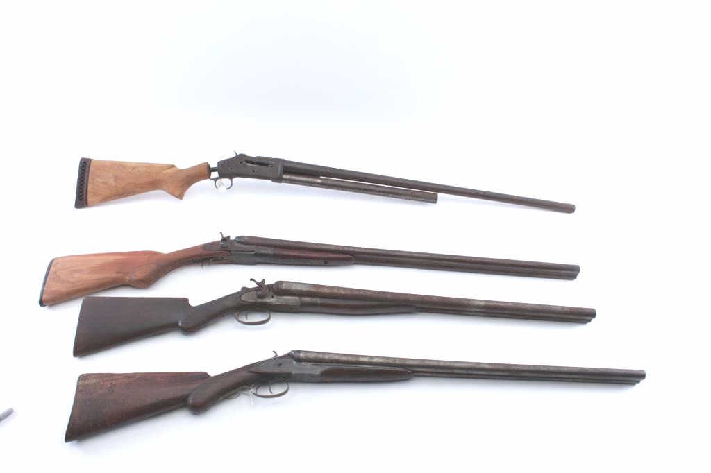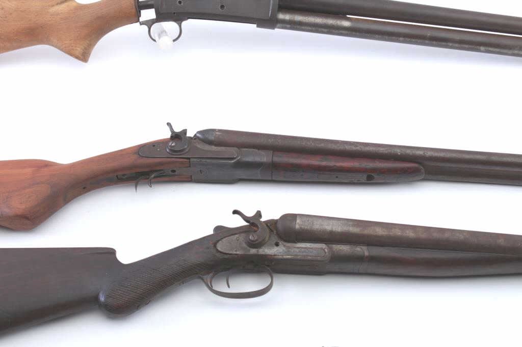 Vintage guns parts lot including: an American Arms S x S hammer shotgun is 12 gauge, an AM Arms S x S shotgun in 12 gauge, Winchester Model 1893 pump shotgun and a Snider Conversion carbine. All four firearms are inoperable and sold as parts only. The lot also includes two checkered wood butt stocks in fair condition. Est.: $175-$350. (C+R).