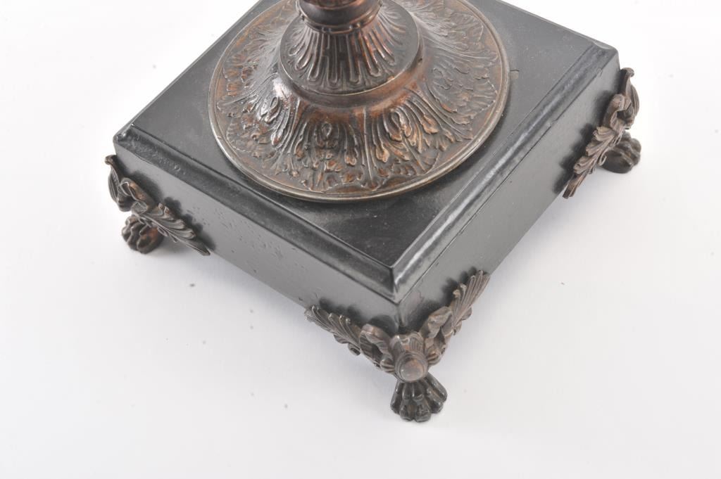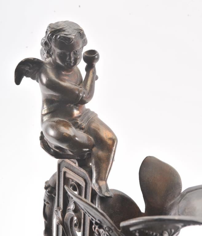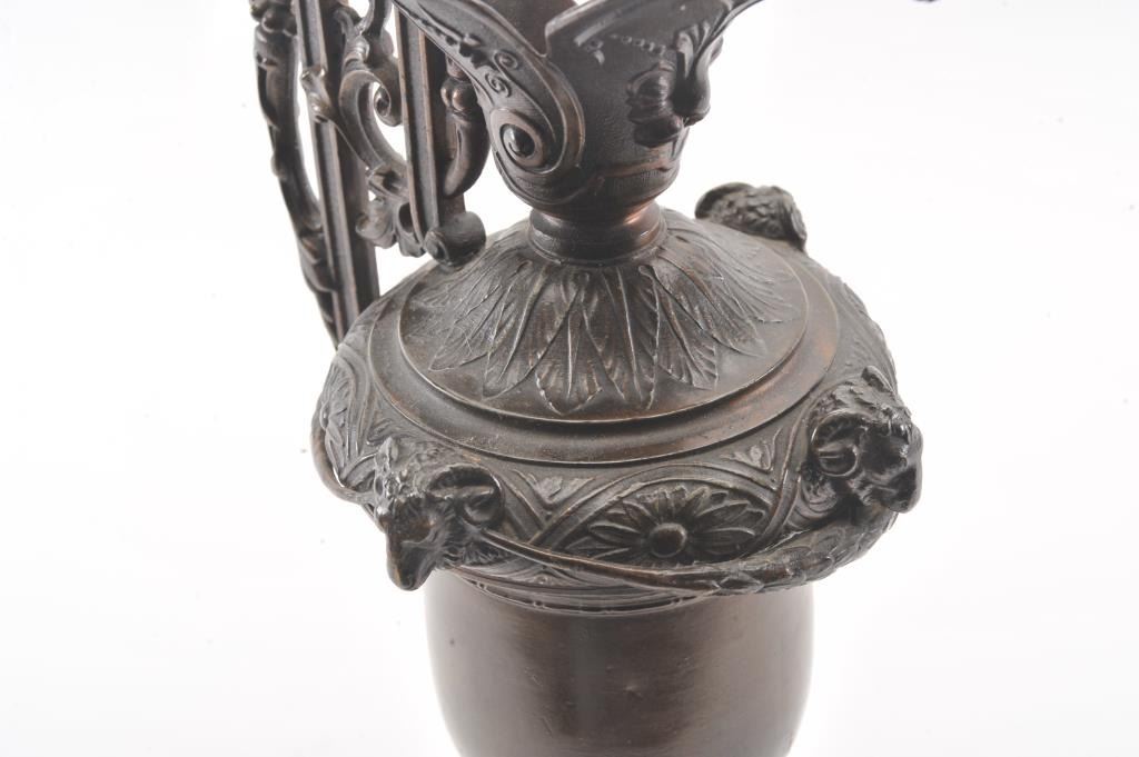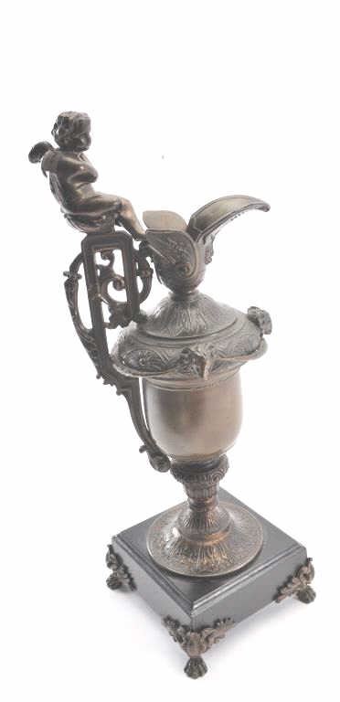 Beautiful older metal pouring vessel on base with fancy metal feet; approximately 19” in overall height, top of handle sits a cherub; beautiful patina. Est.: $100-$200.