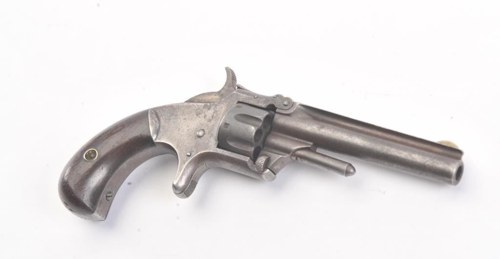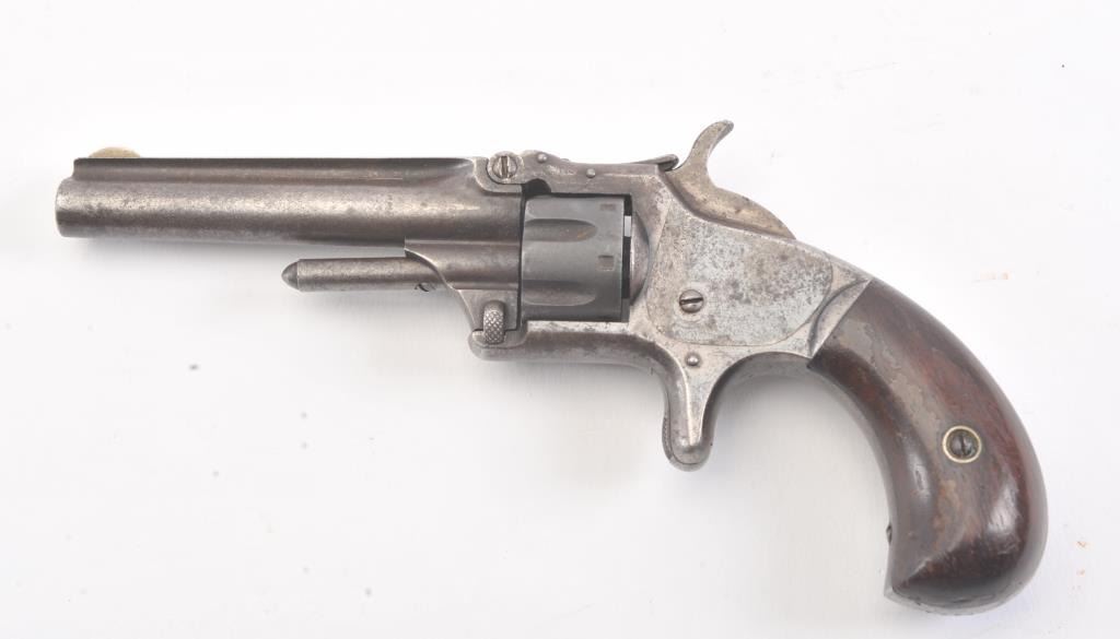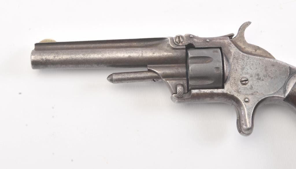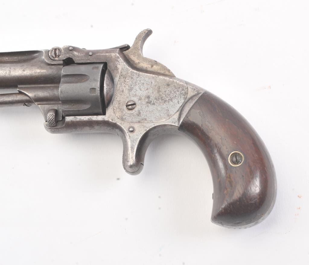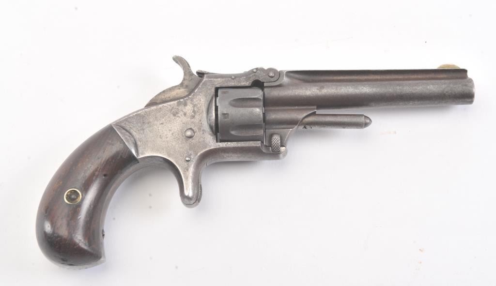 Smith & Wesson 1st Model 3rd Issue revolver, .22 caliber, Serial #77334. The pistol is in good overall condition with a 3 ¼” barrel with a crisp barrel address. The frame shows significant muted blue finish in theprotected areas with smooth Rosewood bird head grips. The action functions and the markings are legible. Est.: $175-$350. (Antique).