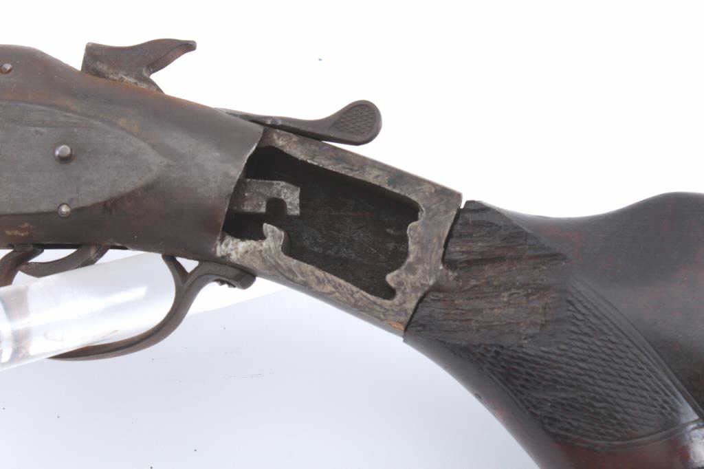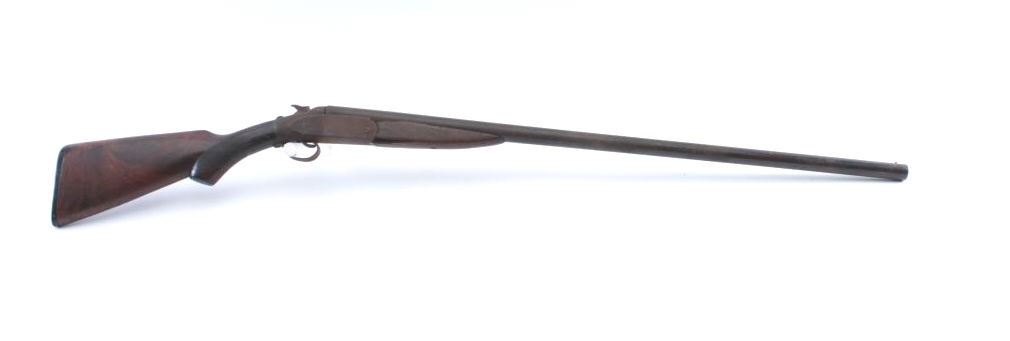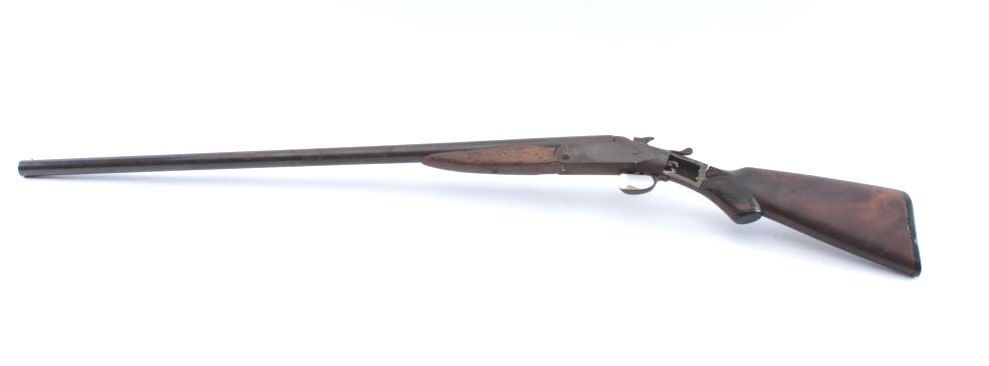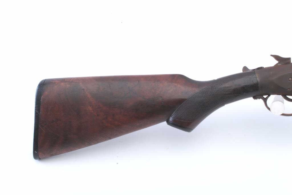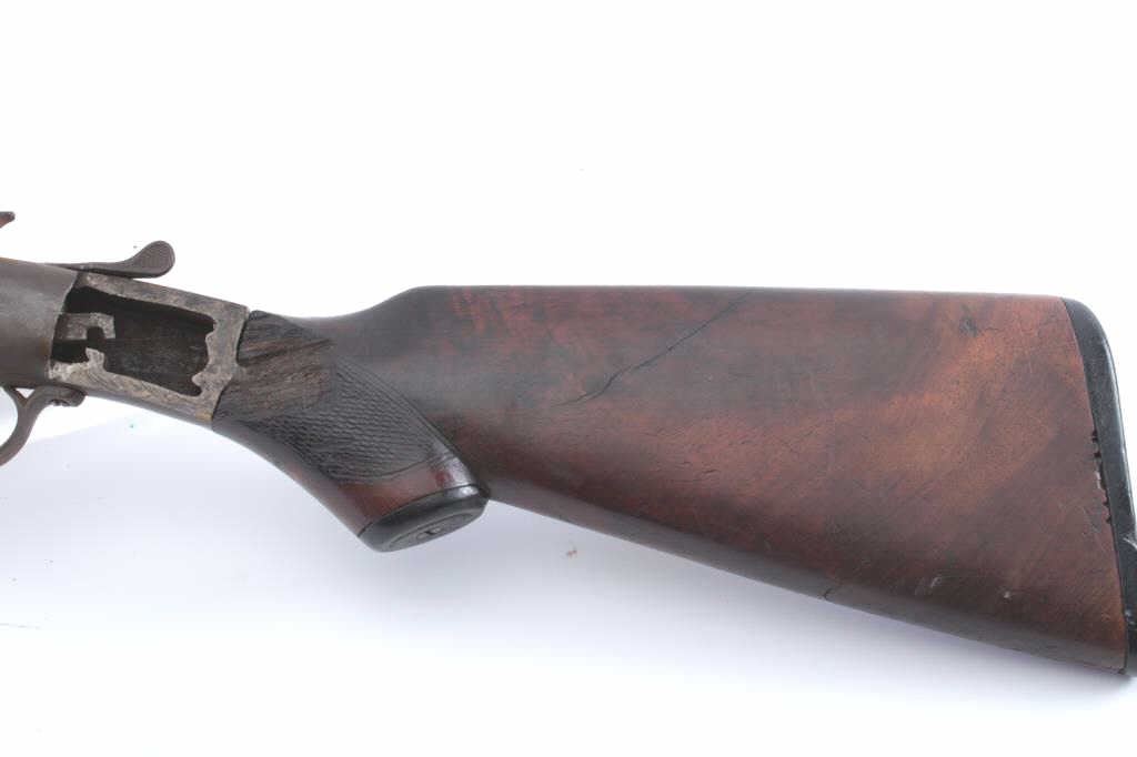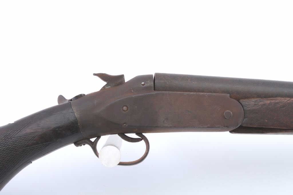 Worlds Challenge Ejector rusty relic single shot shotgun, 12 gauge with a 32” barrel. The shotgun is inoperable, missing a portion of the rear of the receiver and a large chunk of wood at the wrist. Est.: $15-$30.(Antique).