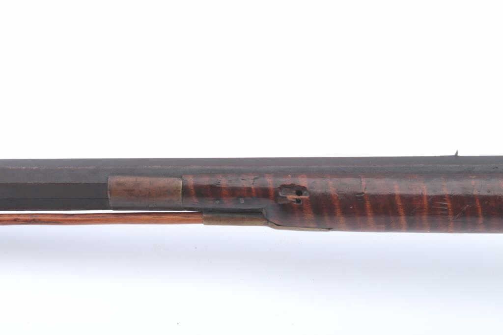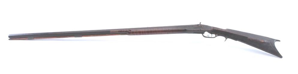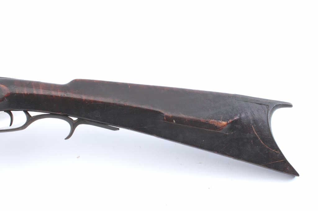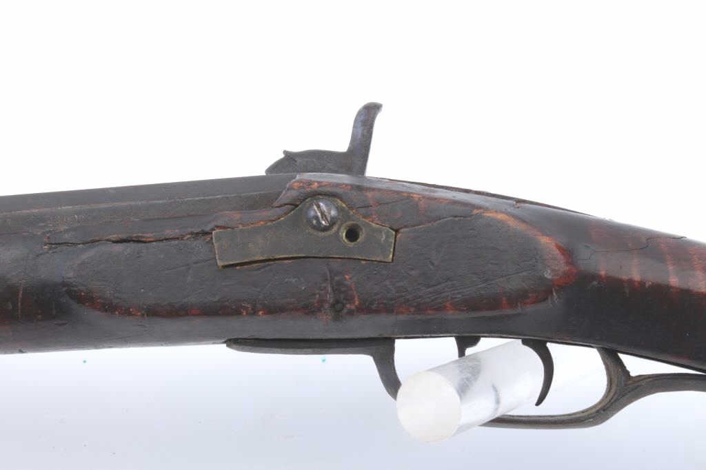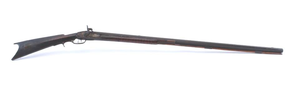 Half-Stock American percussion rifle in approximately .36 caliber with a 40” octagon barrel with brass mounts and double set triggers. The barrel has gone to a dark brown patina. The half stock was previouslyfull length and has beautiful figure with a wooden ram rod and loss of wood along the barrel as well as some damage at the wrist. The butt stock ends with a crescent brass butt plate. Est.: $150-$300.