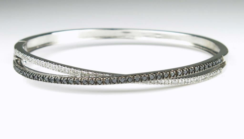 Contemporary White and Black Diamond Bangle Bracelet with stylish crossover design featuring combination of 82 round Black and White Diamonds weighing approx. 1.50 carats crafted in 14 karat white gold setting.Retail $3,000-$4,000 Estimates $1,800-$2,500