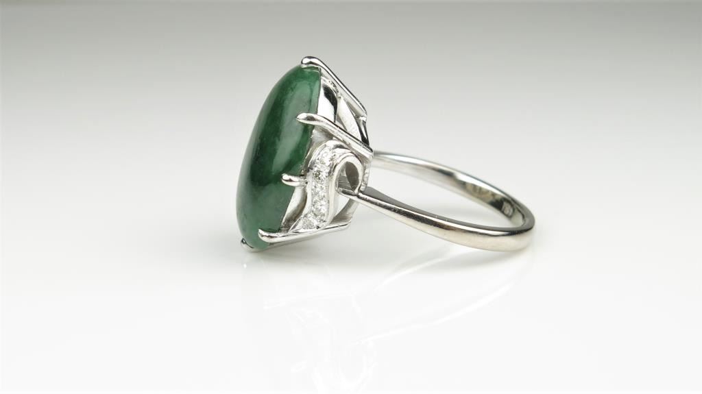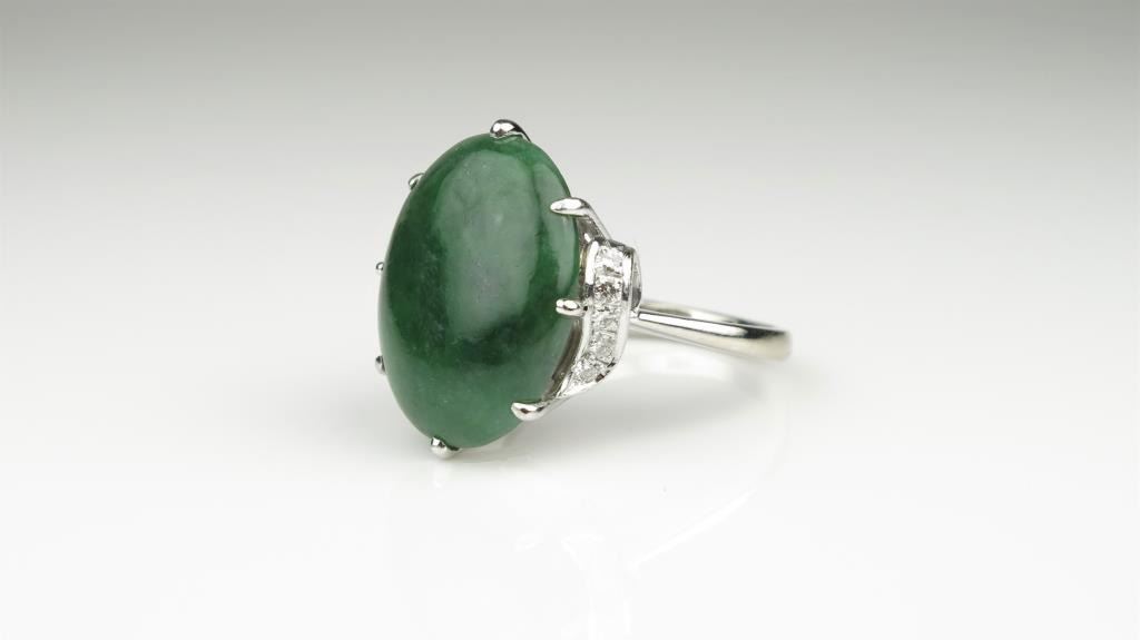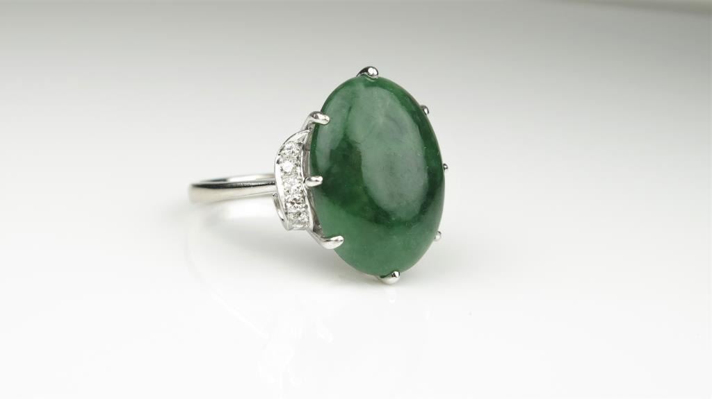 Lovely Vintage Green Jade and Diamond Ring featuring an approx. 15.00 carat oval Green Jade accented with 10 ‘IDEAL’ cut Diamonds 0.20 carats of F-G colors and VVS/VS clarity set in an 18 karat white gold vintage designsetting. Retail $5,000-$6,000 Estimates $2,000-$3,000
