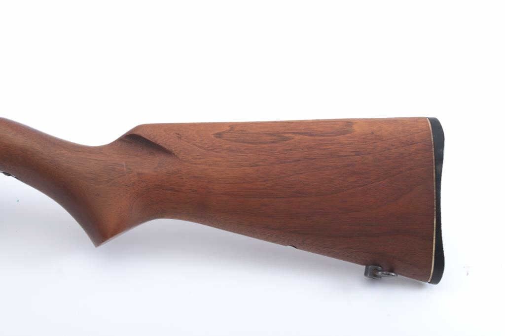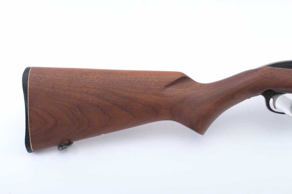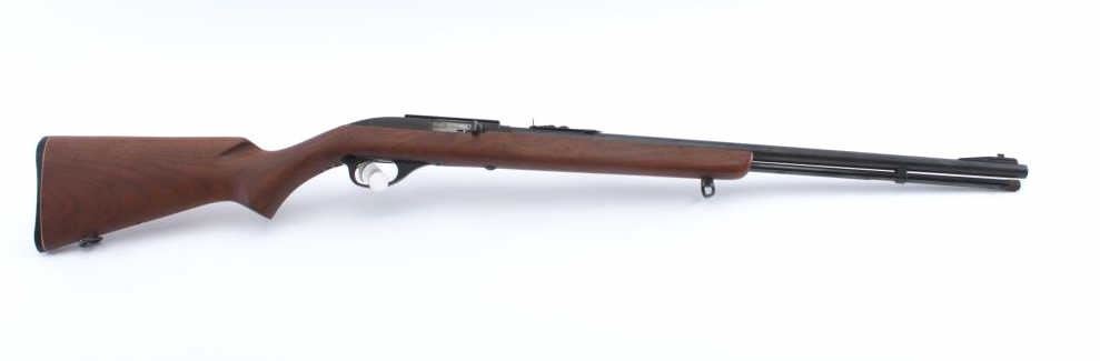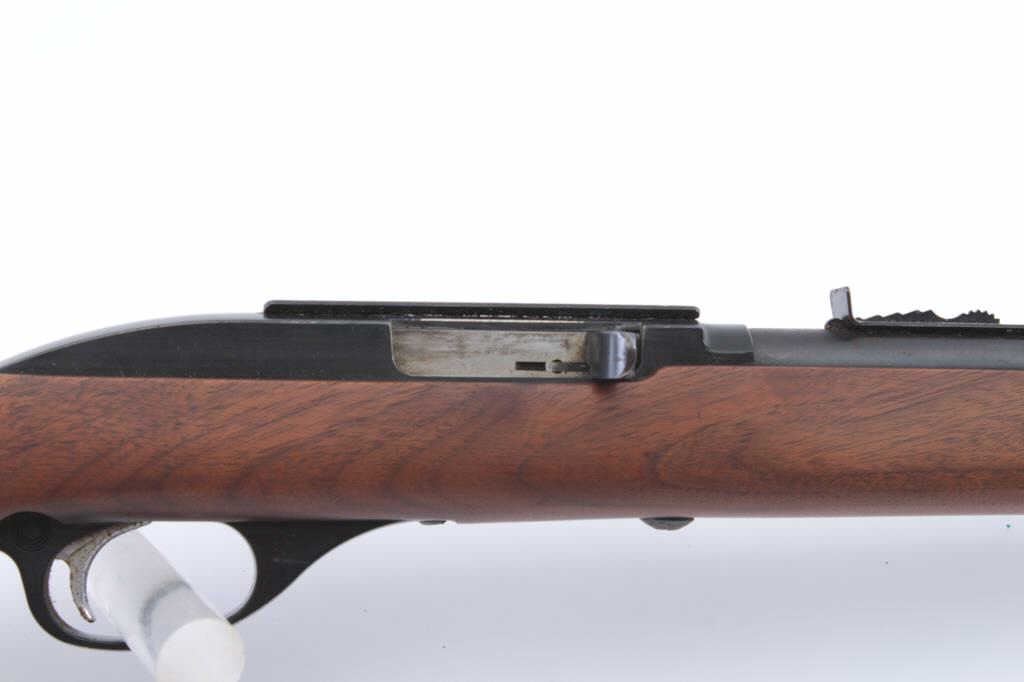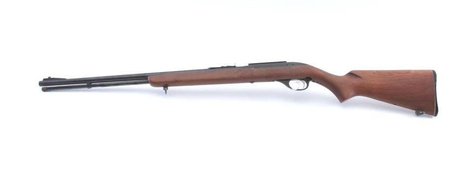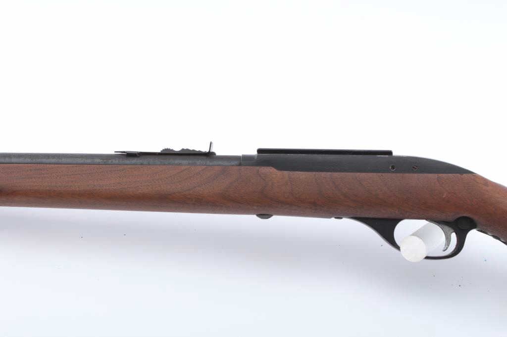 Marlin Model 99 semi-automatic rifle, .22 L.R. caliber, Serial #NSNV. The rifle is in good overall condition with a 22” barrel and full-length magazine. The barrel and receiver retain the majority of the bluefinish with light surface erosion noted. The smooth wood stock is in very good condition with small mars and marks consistent with field use. The butt stock ends with a Marlin marked plastic butt plate. The bore isfair, the action crisp and the markings are sharp. Est.: #$100-$200. (Modern).