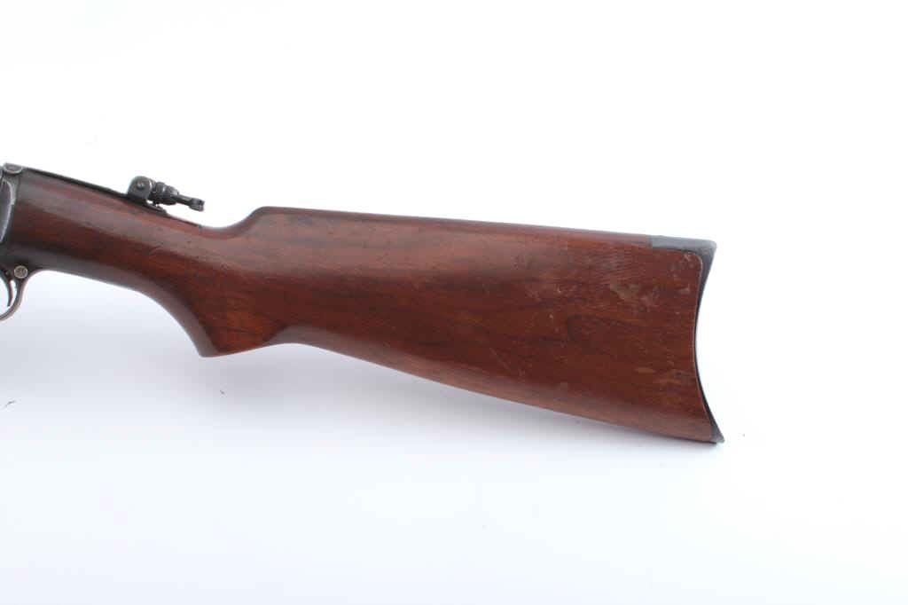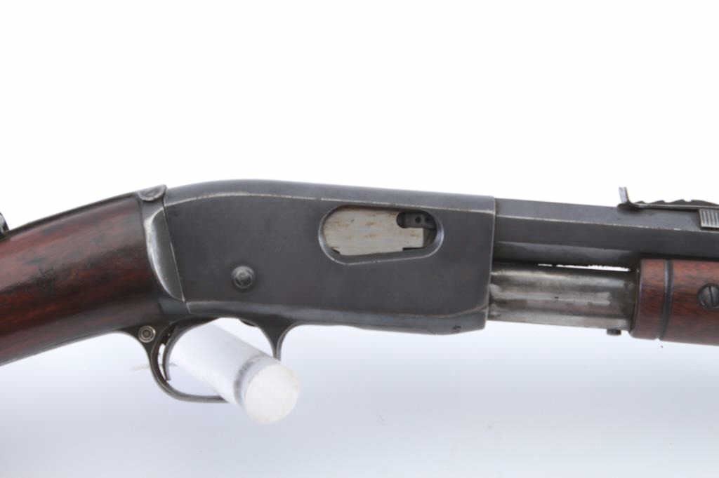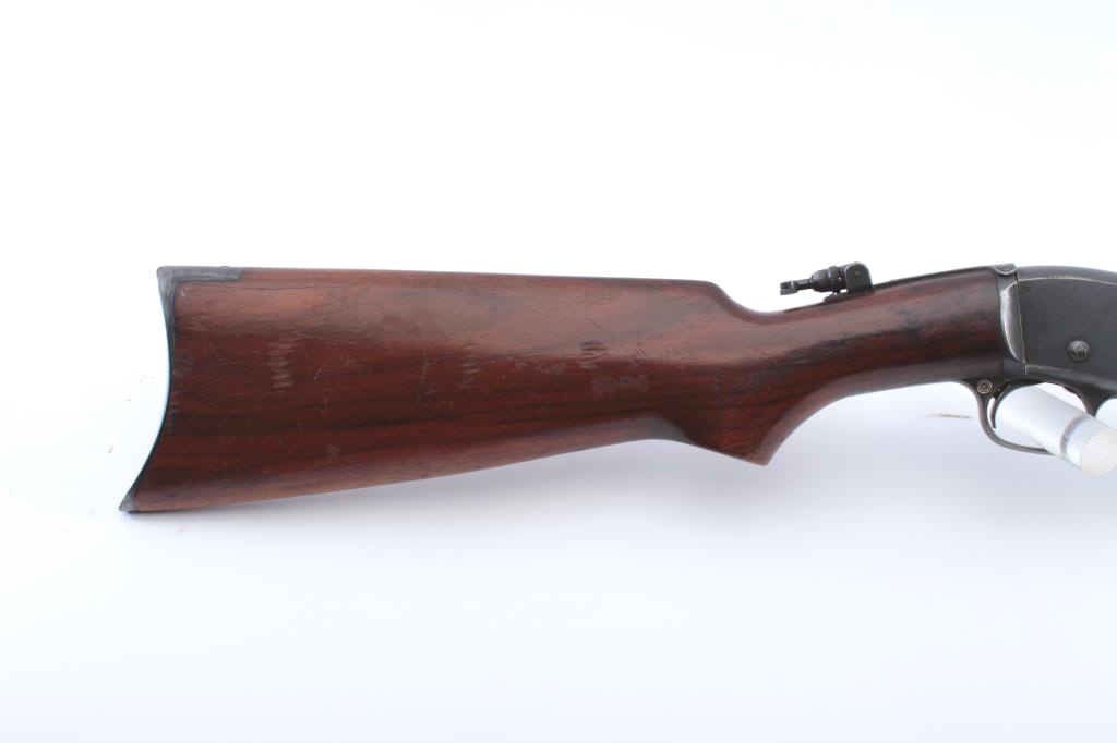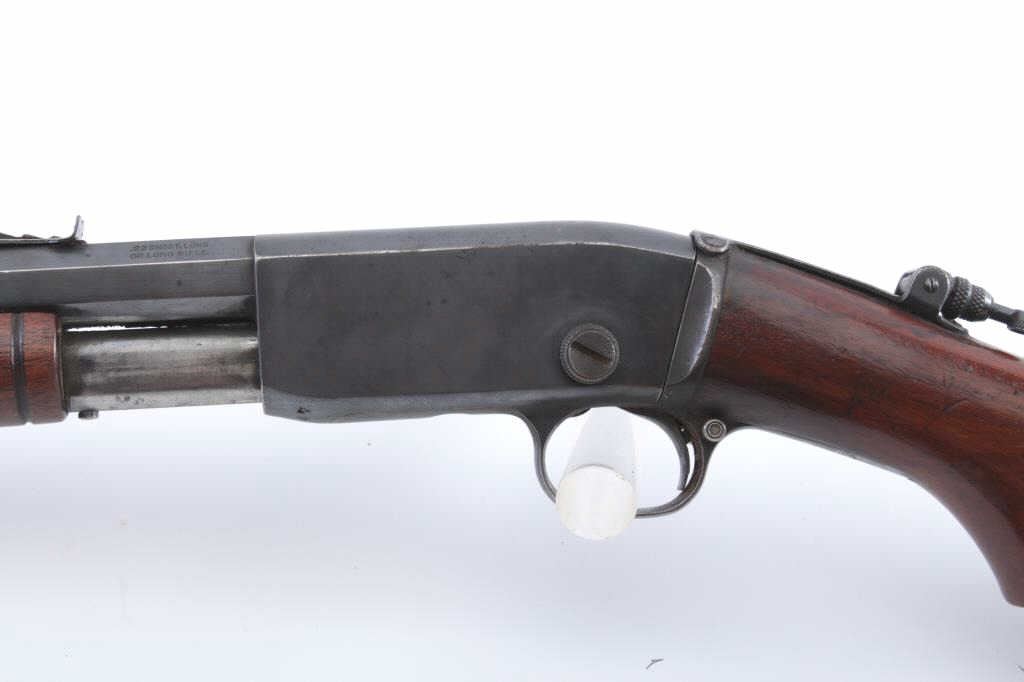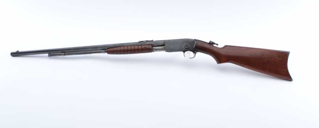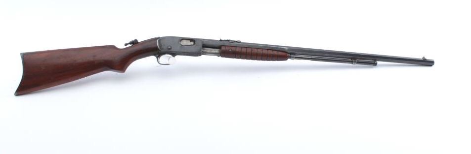 Remington Model 12-C takedown pump rifle, .22 Short, Long or Long Rifle caliber, Serial #415947. The rifle is in fine overall condition with a 24” octagon barrel with sharp edges and a ¾ length magazine. Thefront sight is a Marbles 2S and a period Marbles tang sight has been added during the period of use. The metal surfaces retain the majority of the original blue finish with edge wear and light scratches. The smoothwood stocks are in very good condition with dents and mars. The butt stock ends with a smooth steel butt plate. The bore is fair, the action is crisp and the markings are sharp. Est.: $250-$500. (C+R).