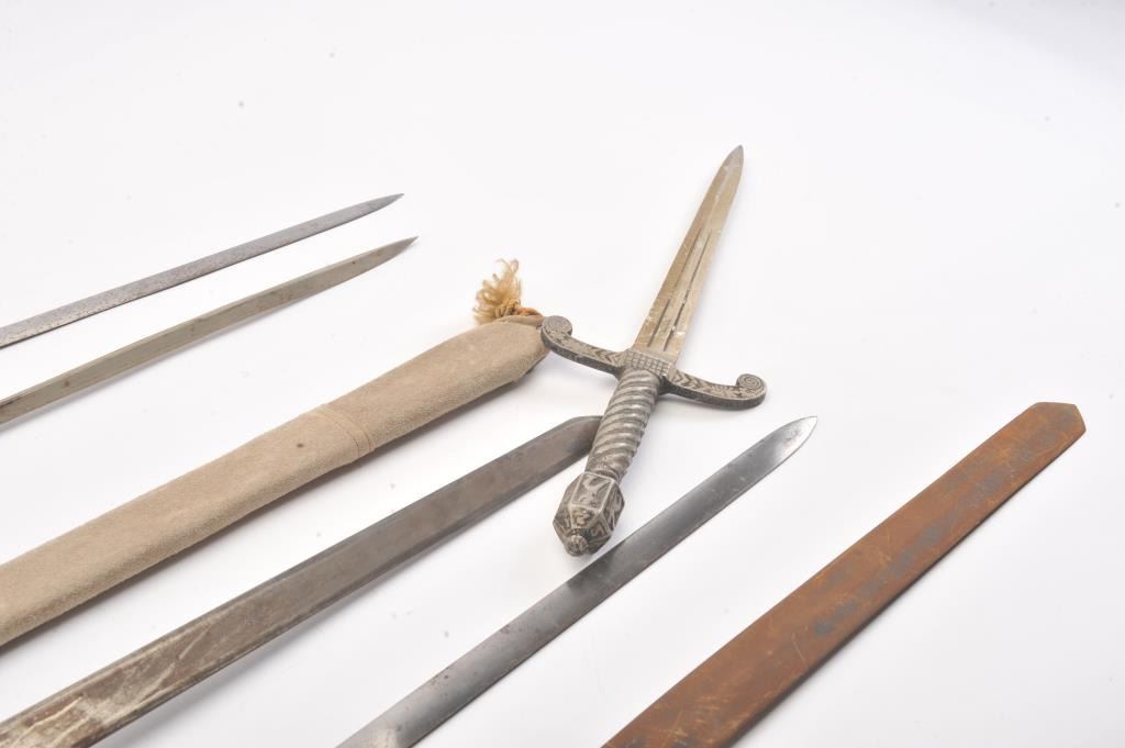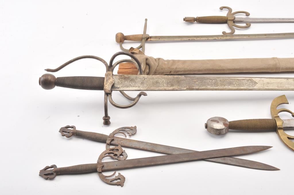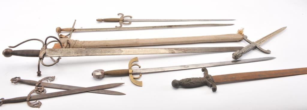 Lot of eight reproduction swords and daggers. The lot includes a reproduction broad sword with basket hilt and leather scabbard. The remainder are without scabbards. All are in fair to good condition with wrapped wirehandles. A nice lot for the re-enactor. Est.: $150-$300.