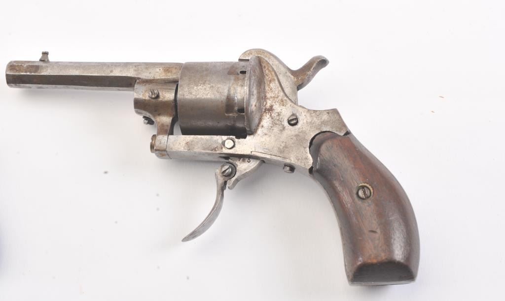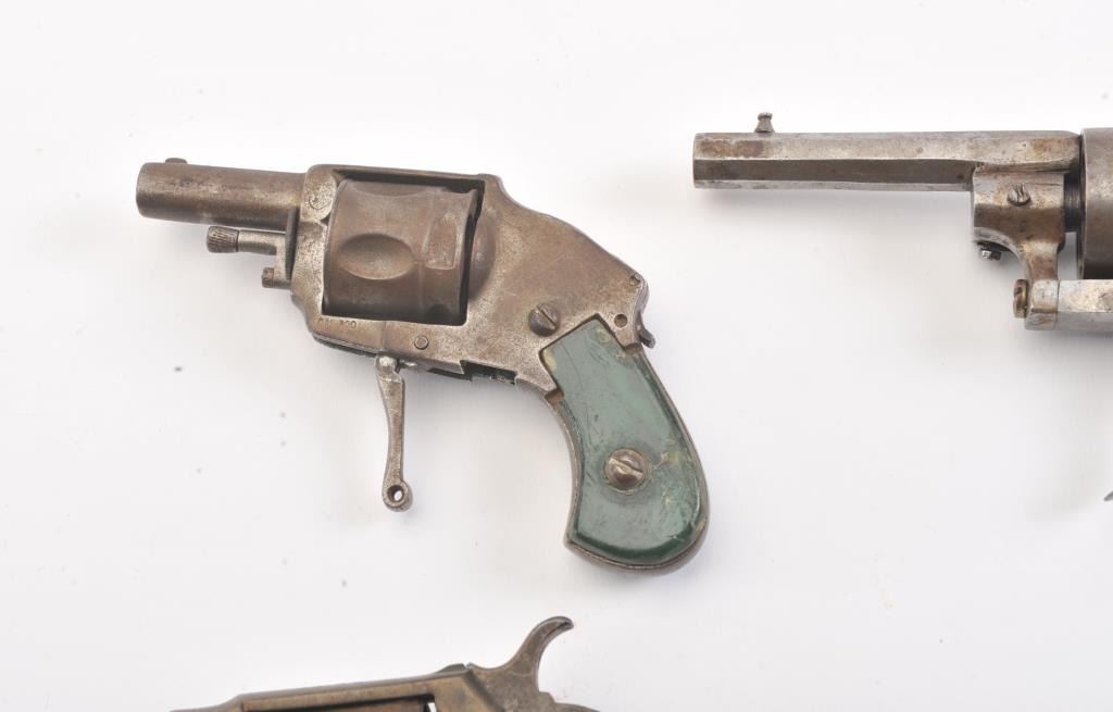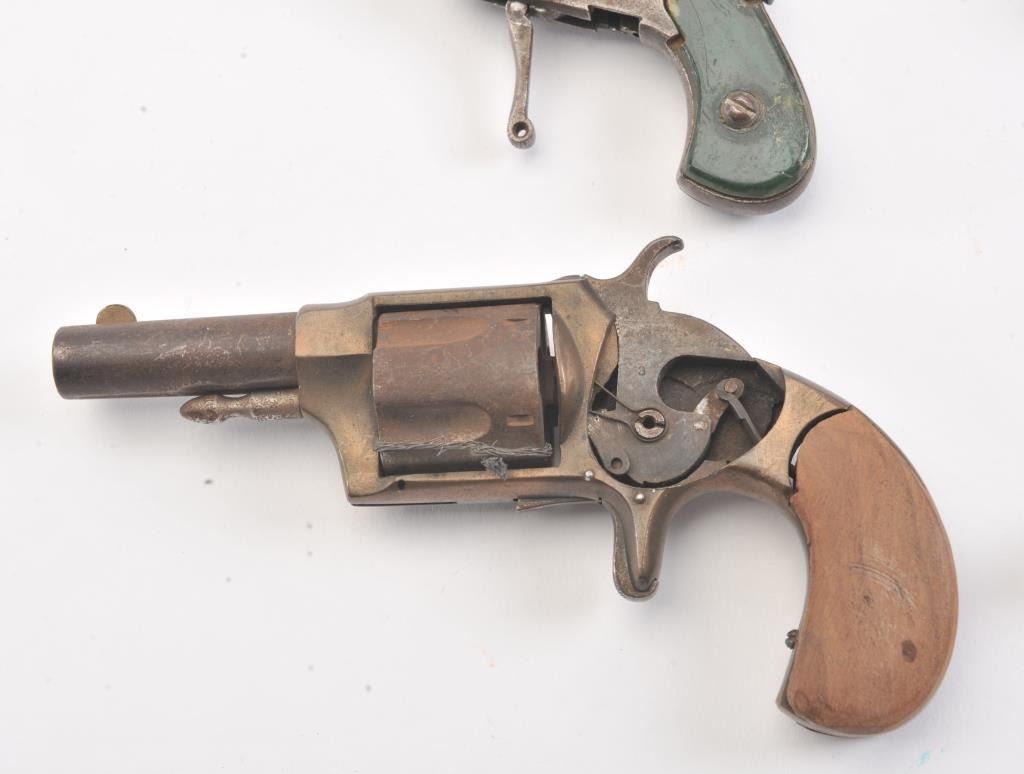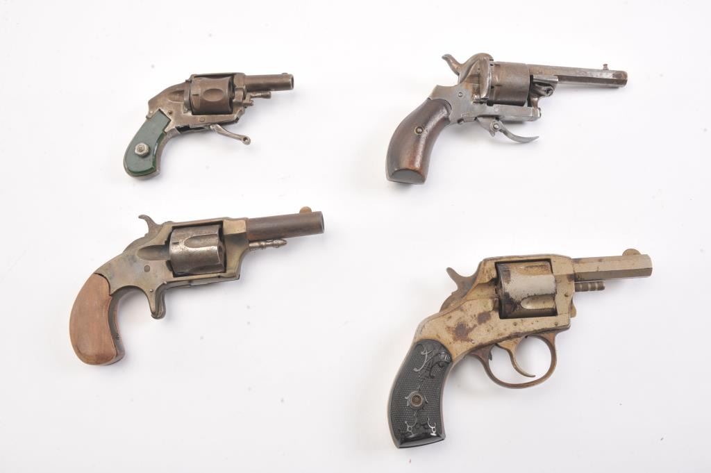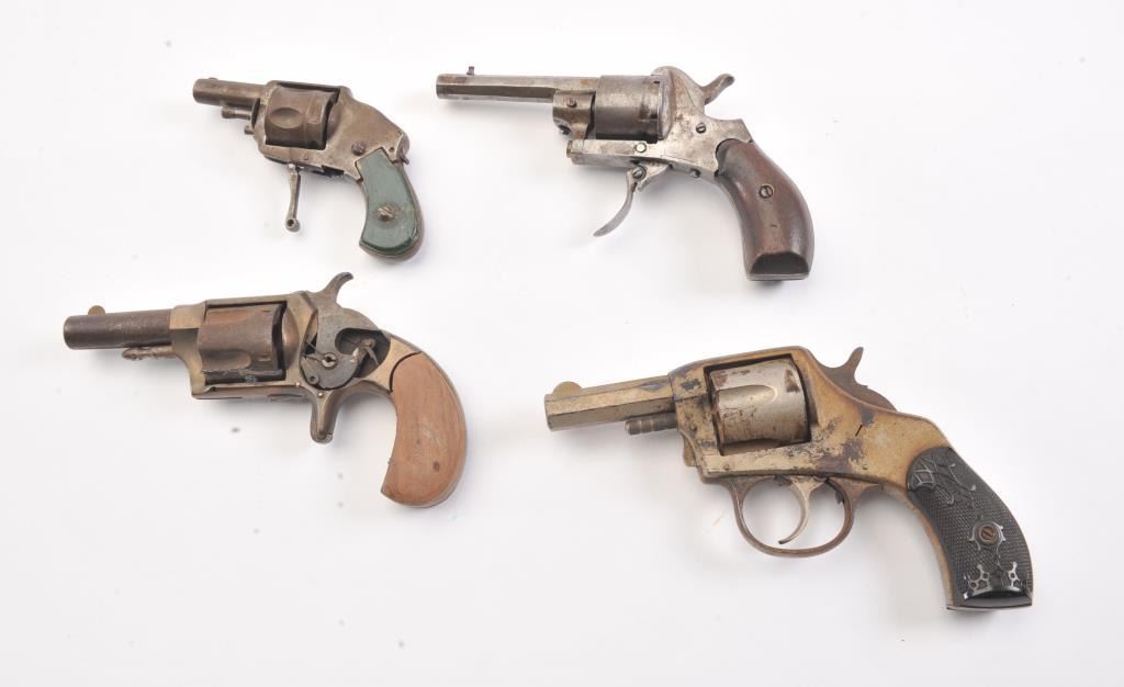 Lot of four antique revolvers including: The American, American No. 3 S, an unmarked revolver with a folding trigger and a pin fire revolver with Belgian proofs on the cylinder. All four are in fair conditionwith light surface rust and erosion. Est.: $150-$300. (Antique).