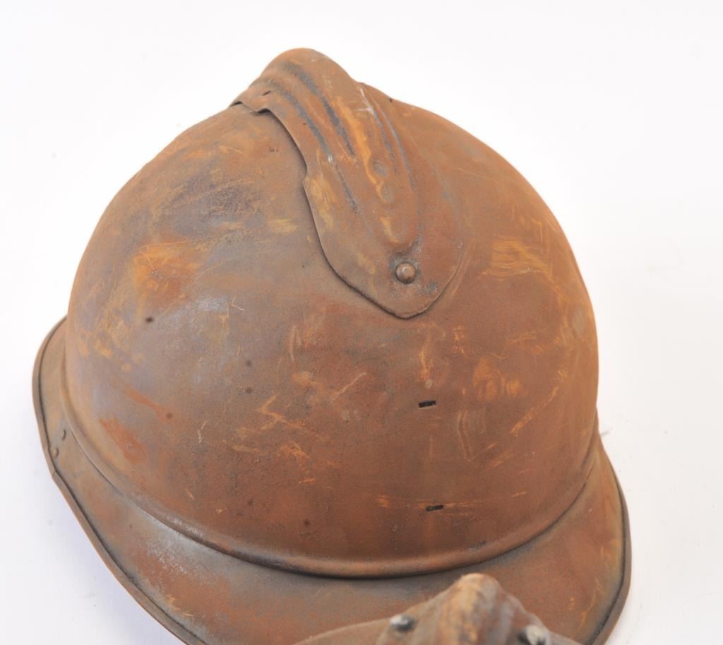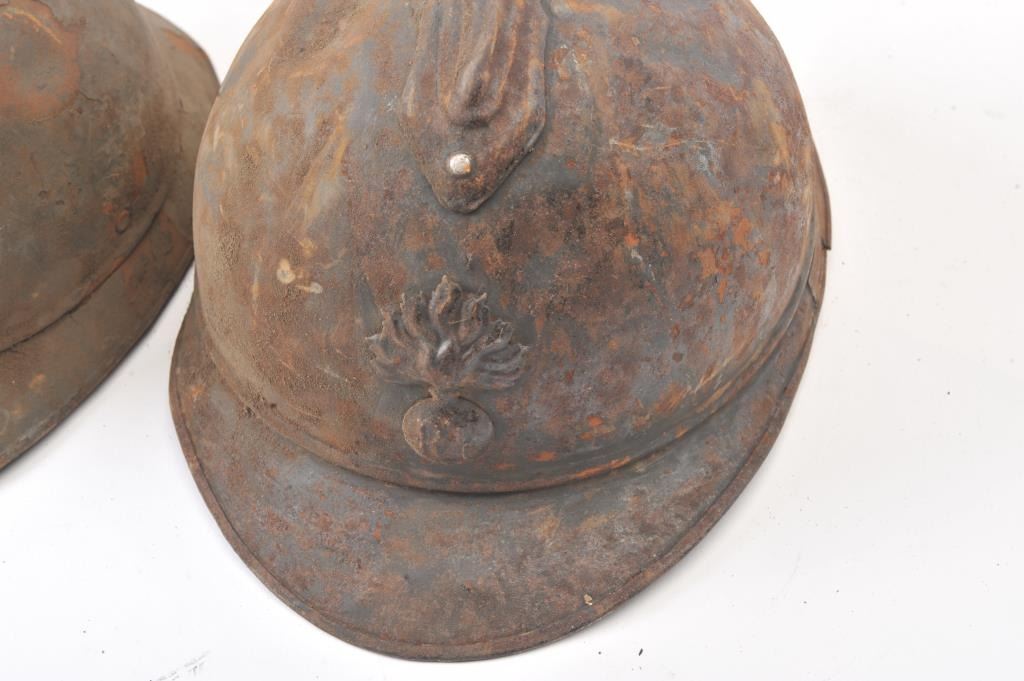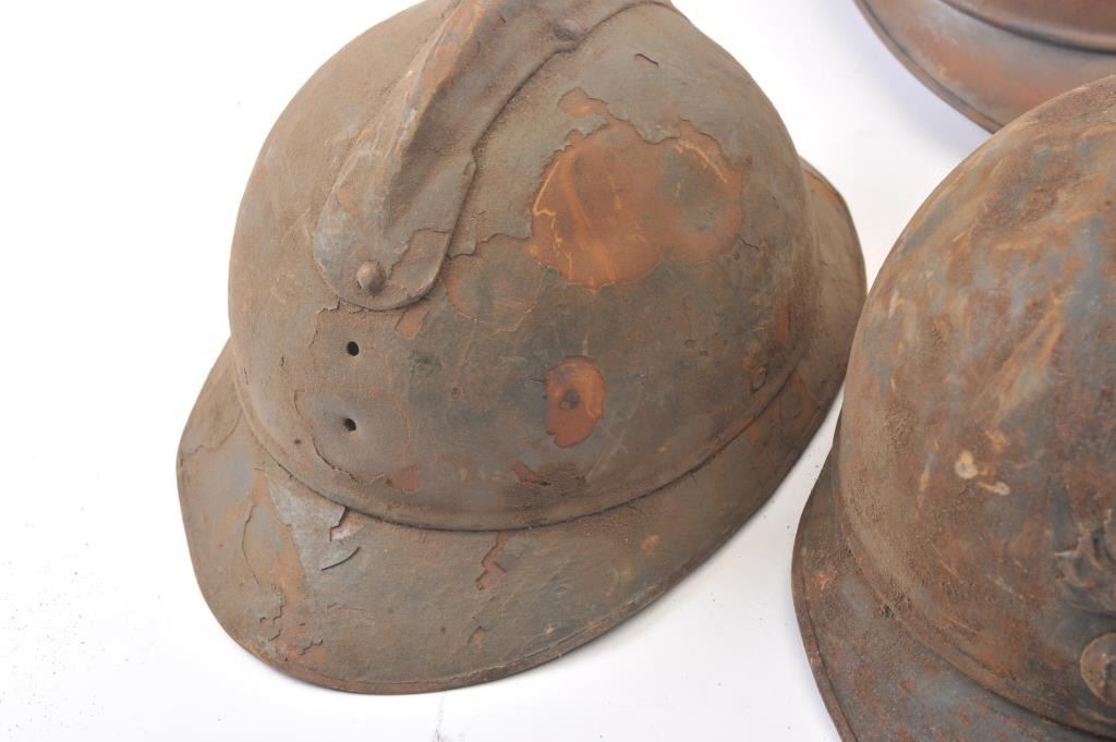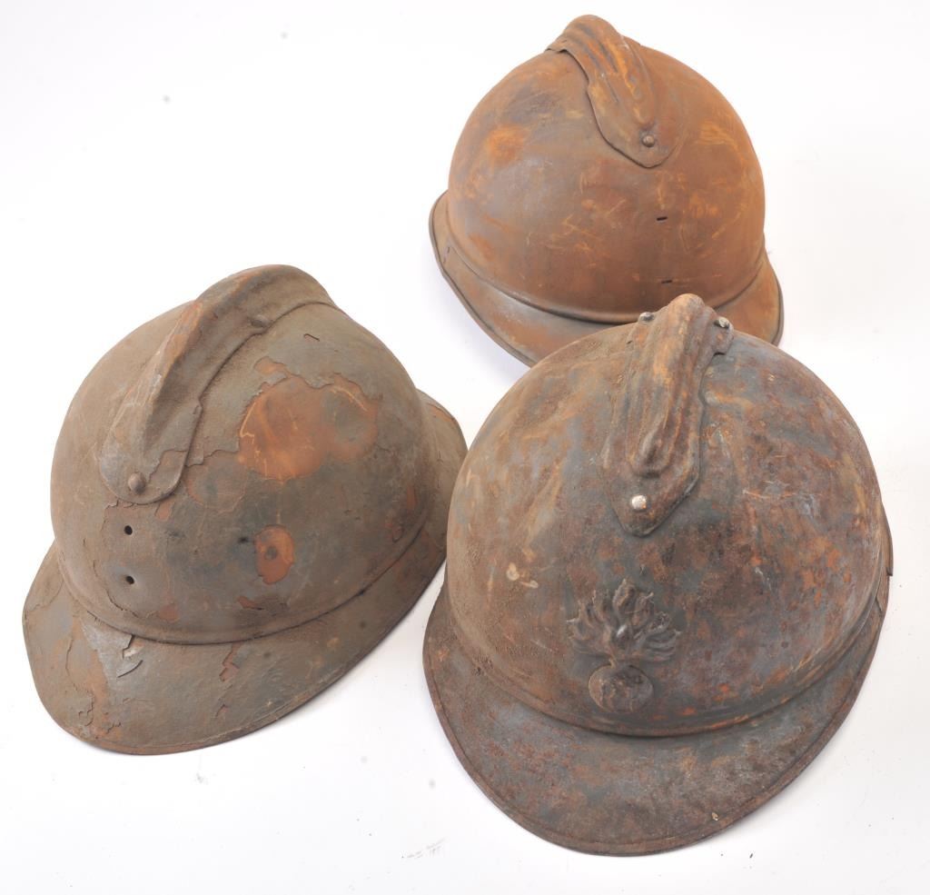 Lot of three French M15 Adrian WWI helmets. The lot includes three M15 Adrian helmets in untouched condition, missing liners, with surface rust and only one helmet retaining the “RF” flaming bomb emblem. An attic findout of an old local estate. Est.: $100-$300.