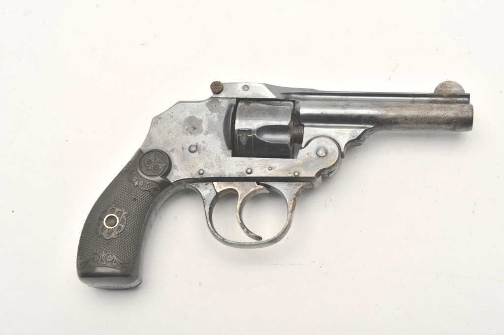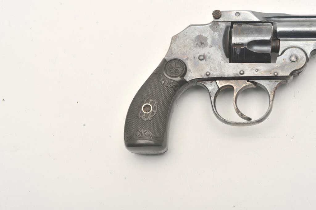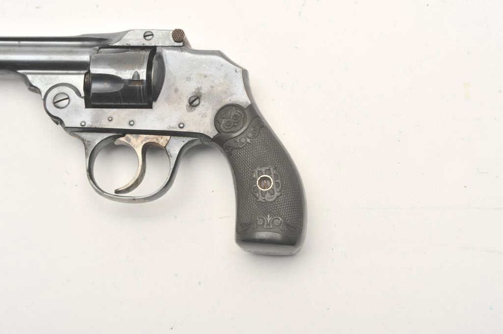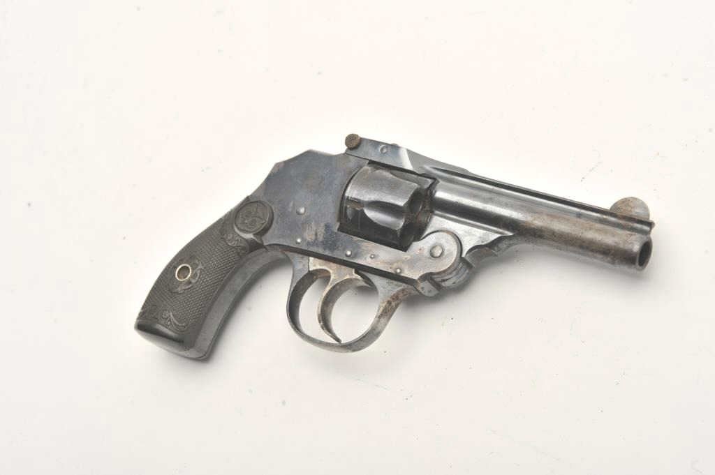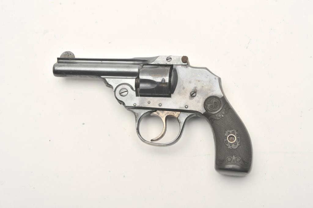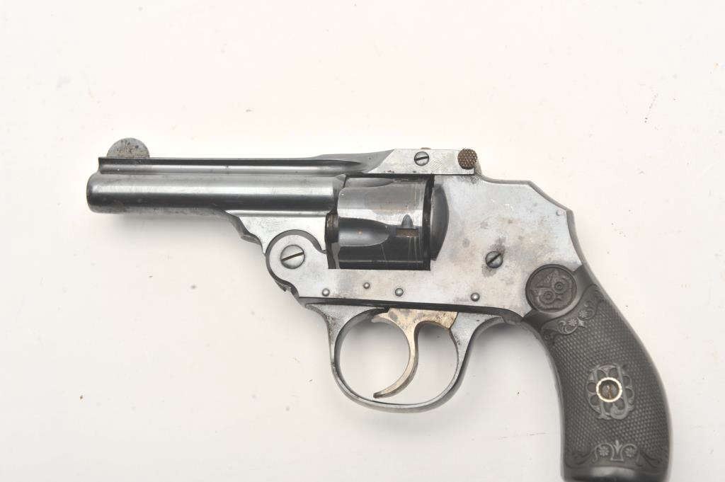 Iver Johnson double action revolver, .32 caliber, Serial #NSNV. The pistol is in good overall condition with a 4” barrel. The pistol retains the majority of its flaking blue finish with a loss of finish on theright side at the muzzle. The checkered hard rubber grips are in good condition. The action functions, the bore is fair and the markings are crisp. Est.: $75-$150. (C+R).