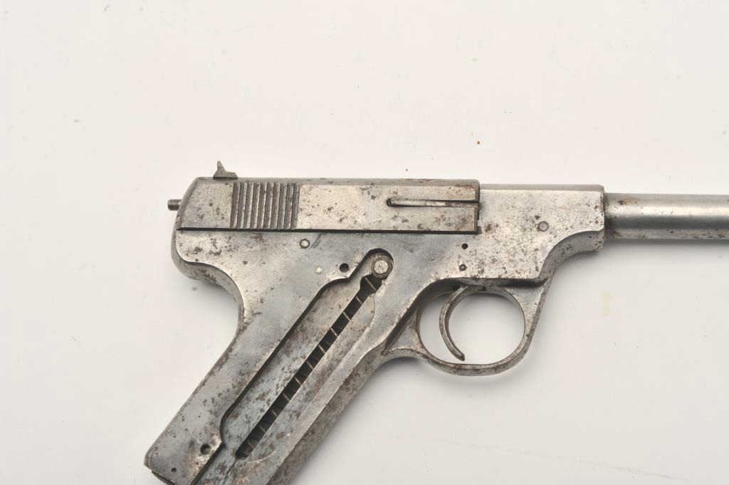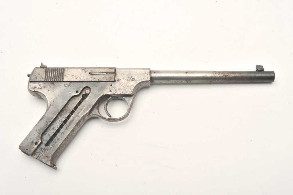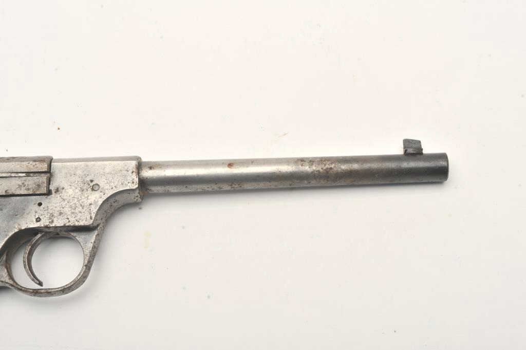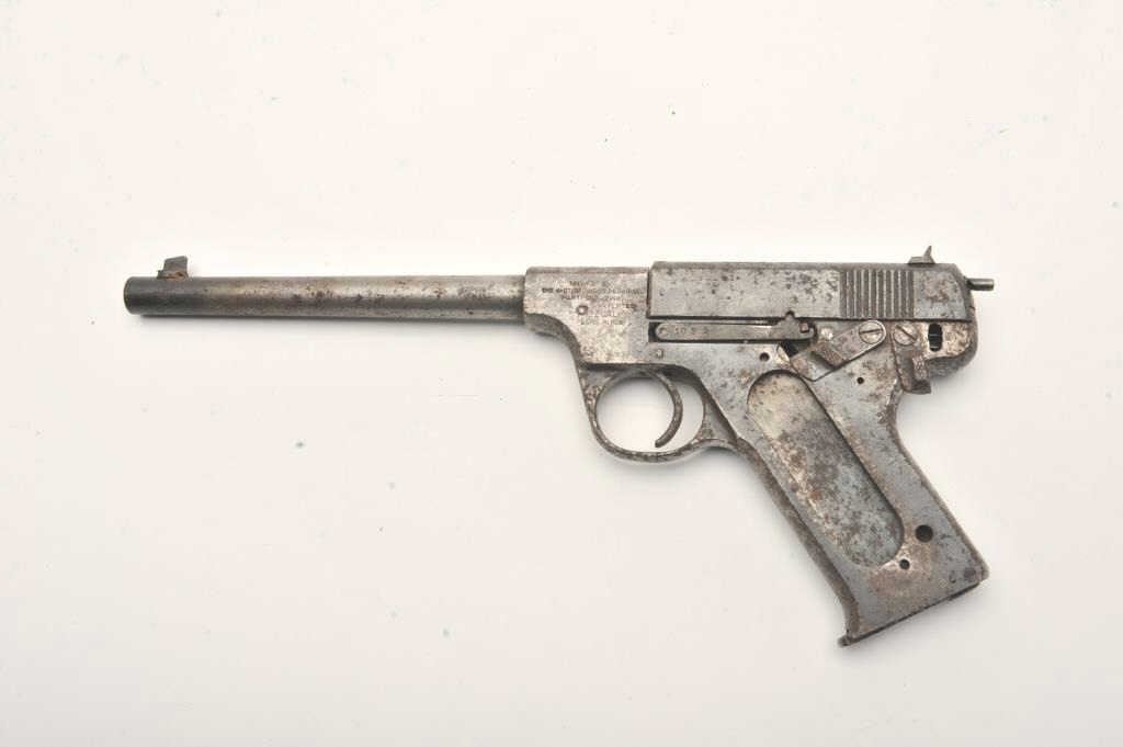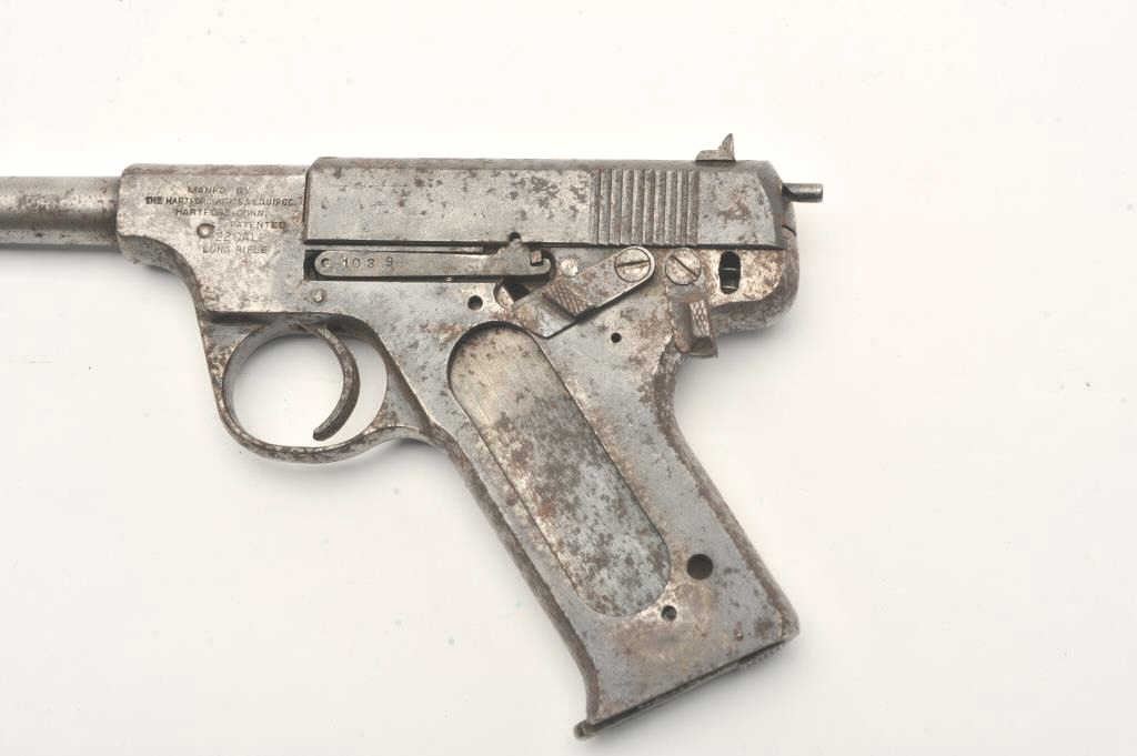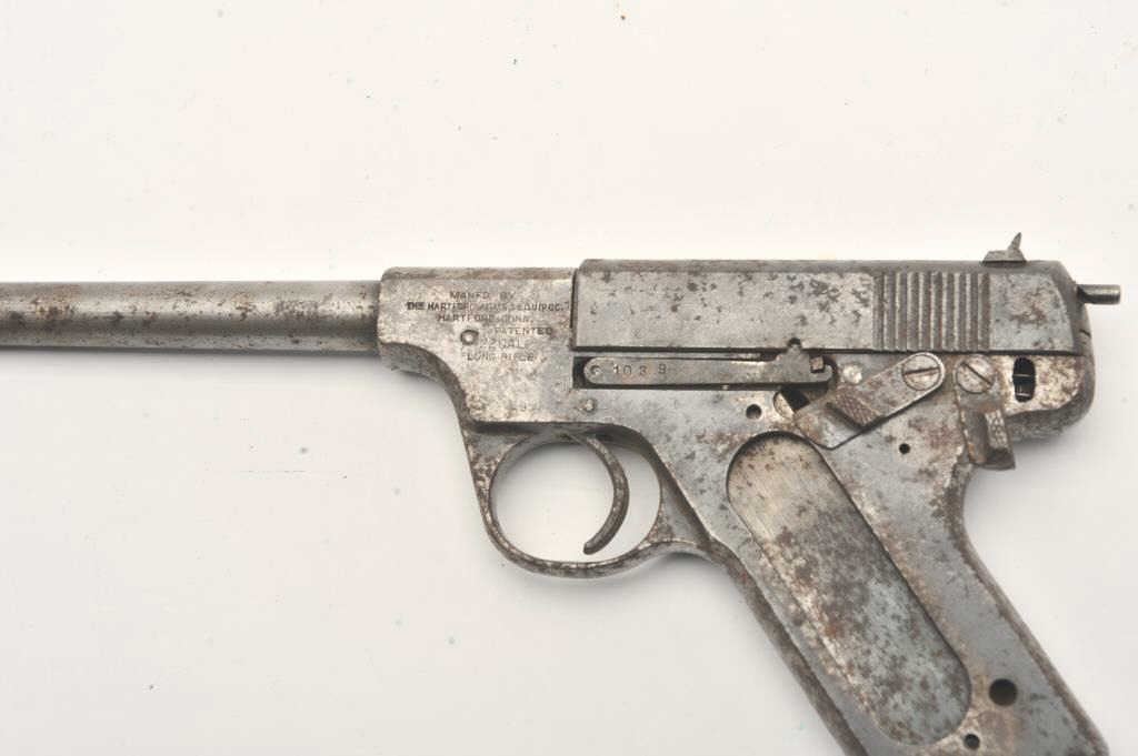 Hartford Arms semi-automatic pistol, .22 caliber, Serial #1039. The pistol is sold as parts, the action is non-functioning and the pistol is missing parts. The metal surfaces are a silver patina with light to moderatesurface rust. The front sight has been re-welded. The bore is rough, the action non-functioning and the markings are legible. The lot includes one correct magazine. Est.: $100-$200. (C+R).