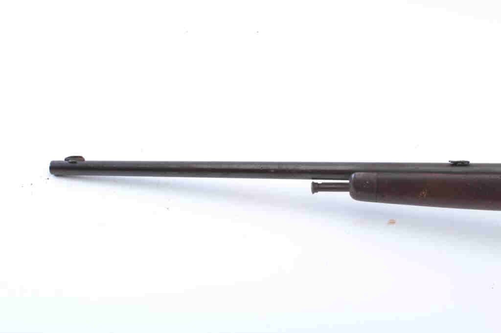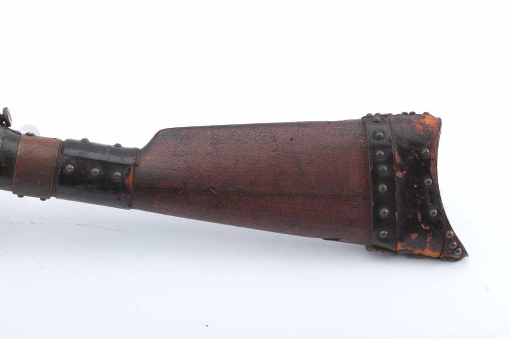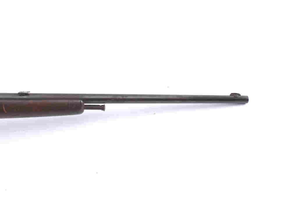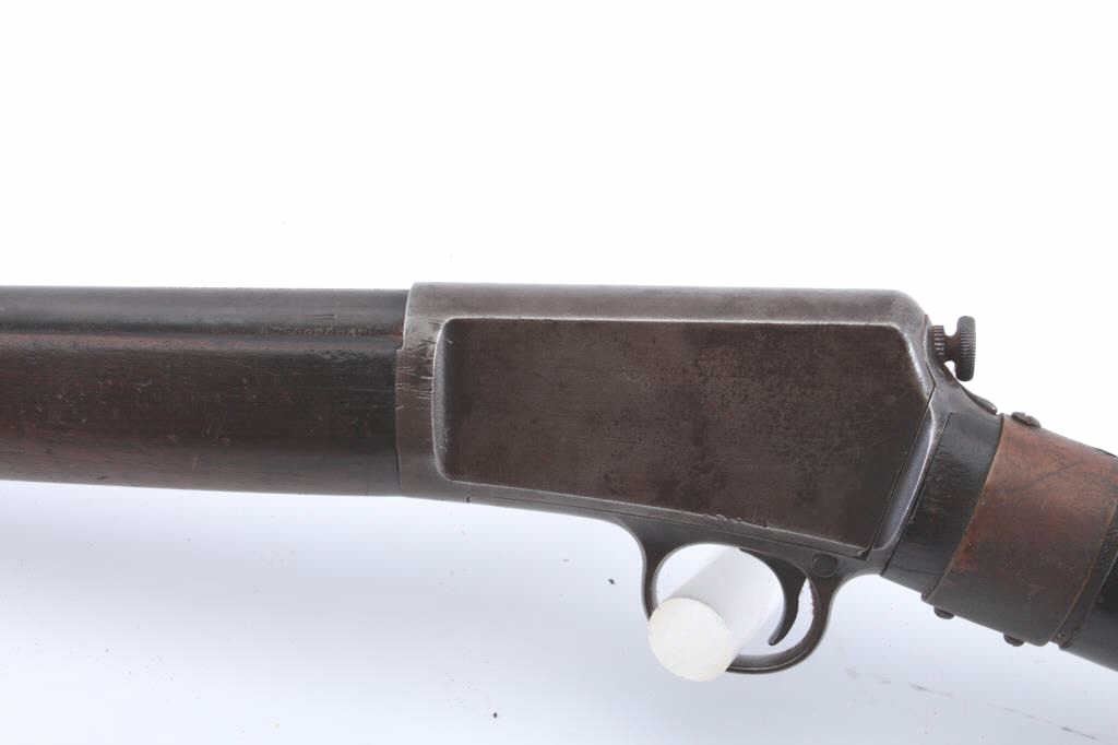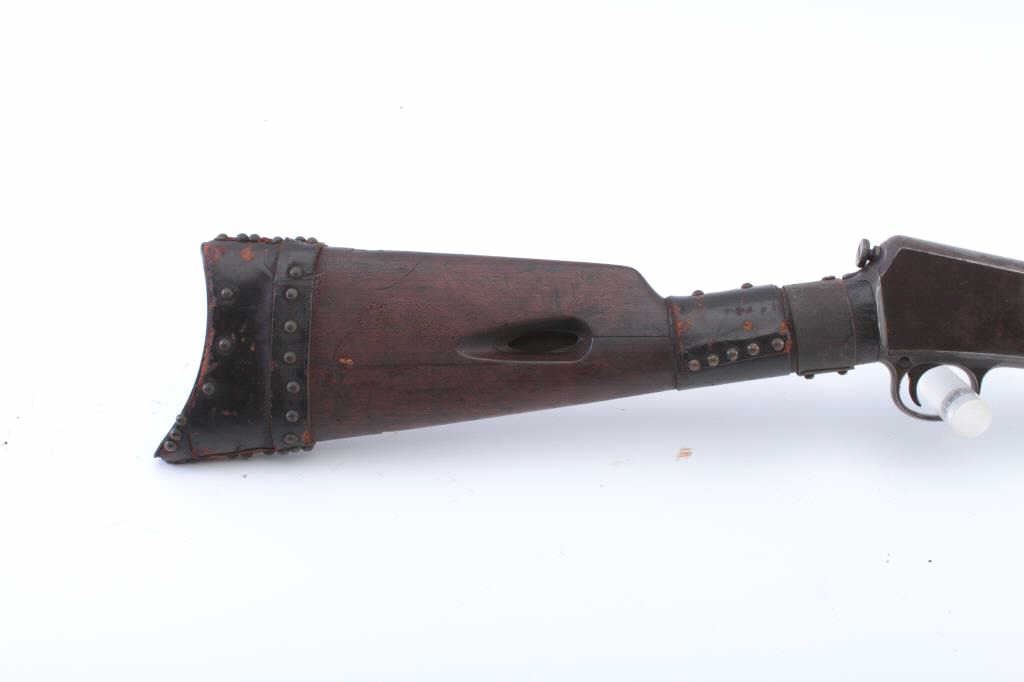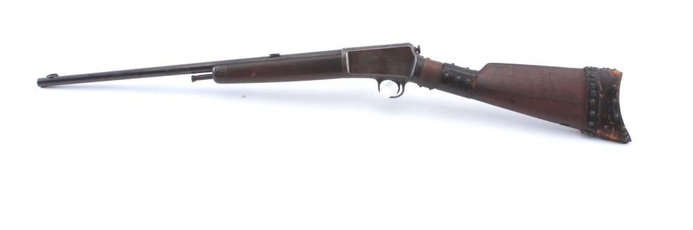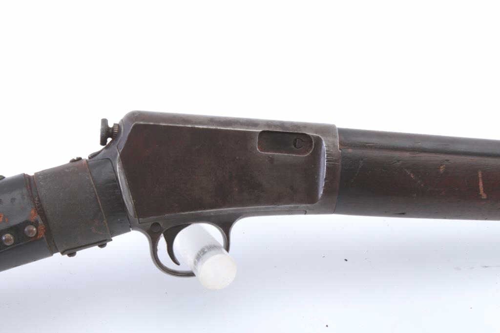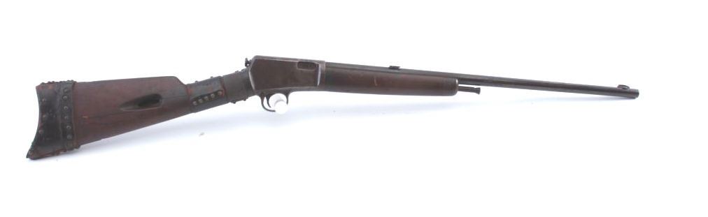 Winchester Model 1903 semi-automatic rifle, .22 Automatic caliber, Serial #41372. The rifle is in good overall condition with a 20” barrel. The metal surfaces have gone to a grey/brown patina with a two-leaf foldingrear sight. The smooth wood stock has period brass tack, leather wrap decorations and a brass strap repair at the wrist. The rifle is missing the magazine from the butt stock. The bore is fair, the action functions andthe markings are legible. Est.: $125-$250. (C+R).